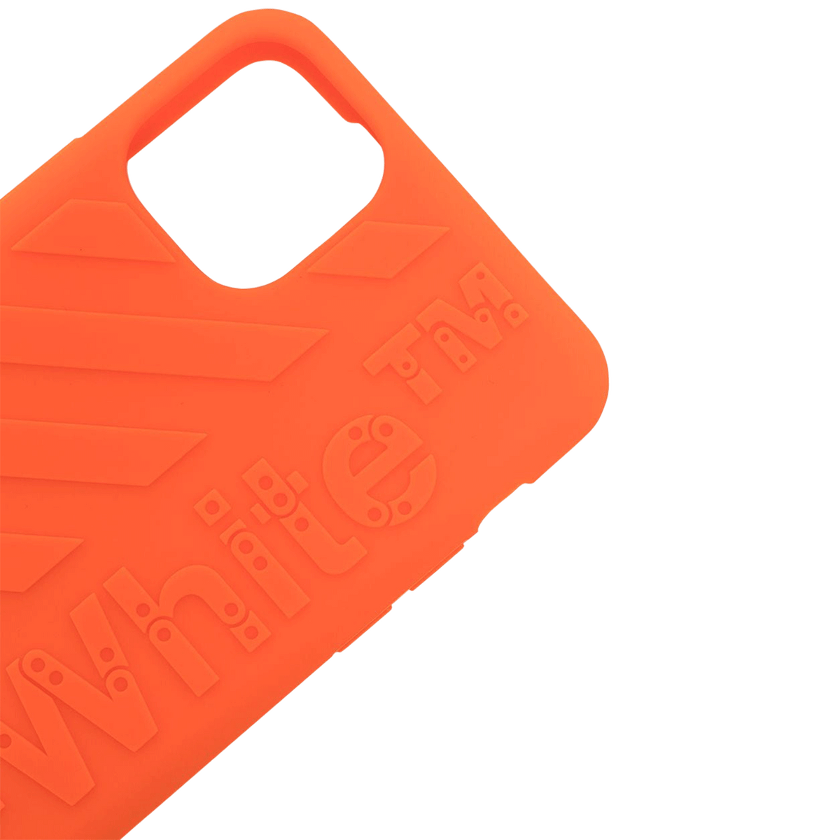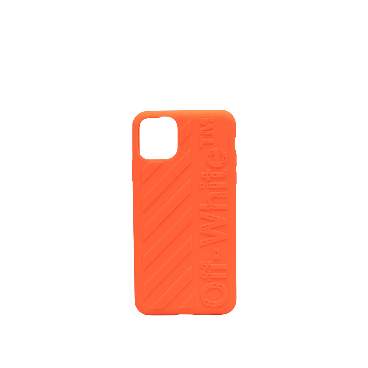 Orange rubber iPhone 11 Pro Max case with tonal diagonals motif, and embossed tonal Off-White™ logo.