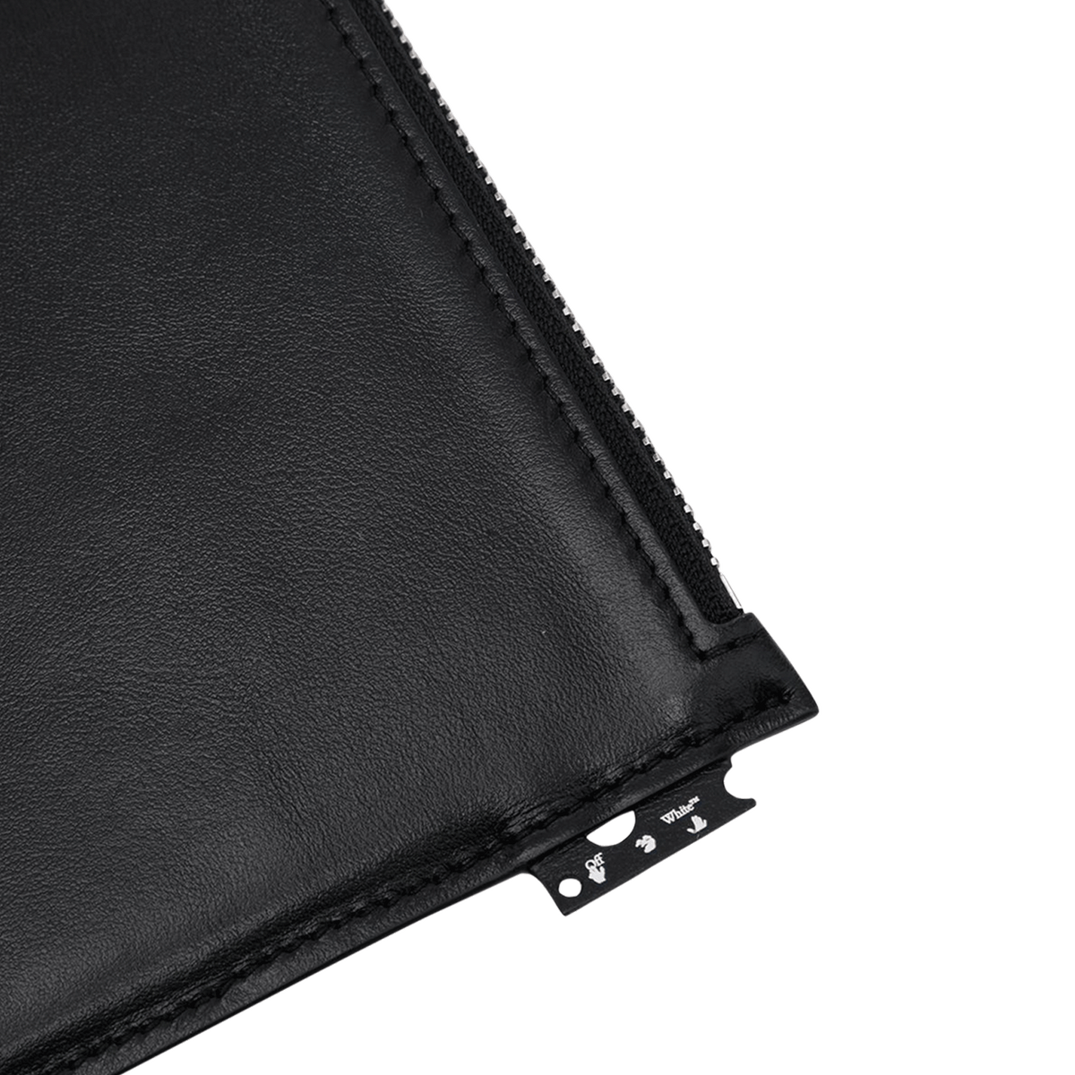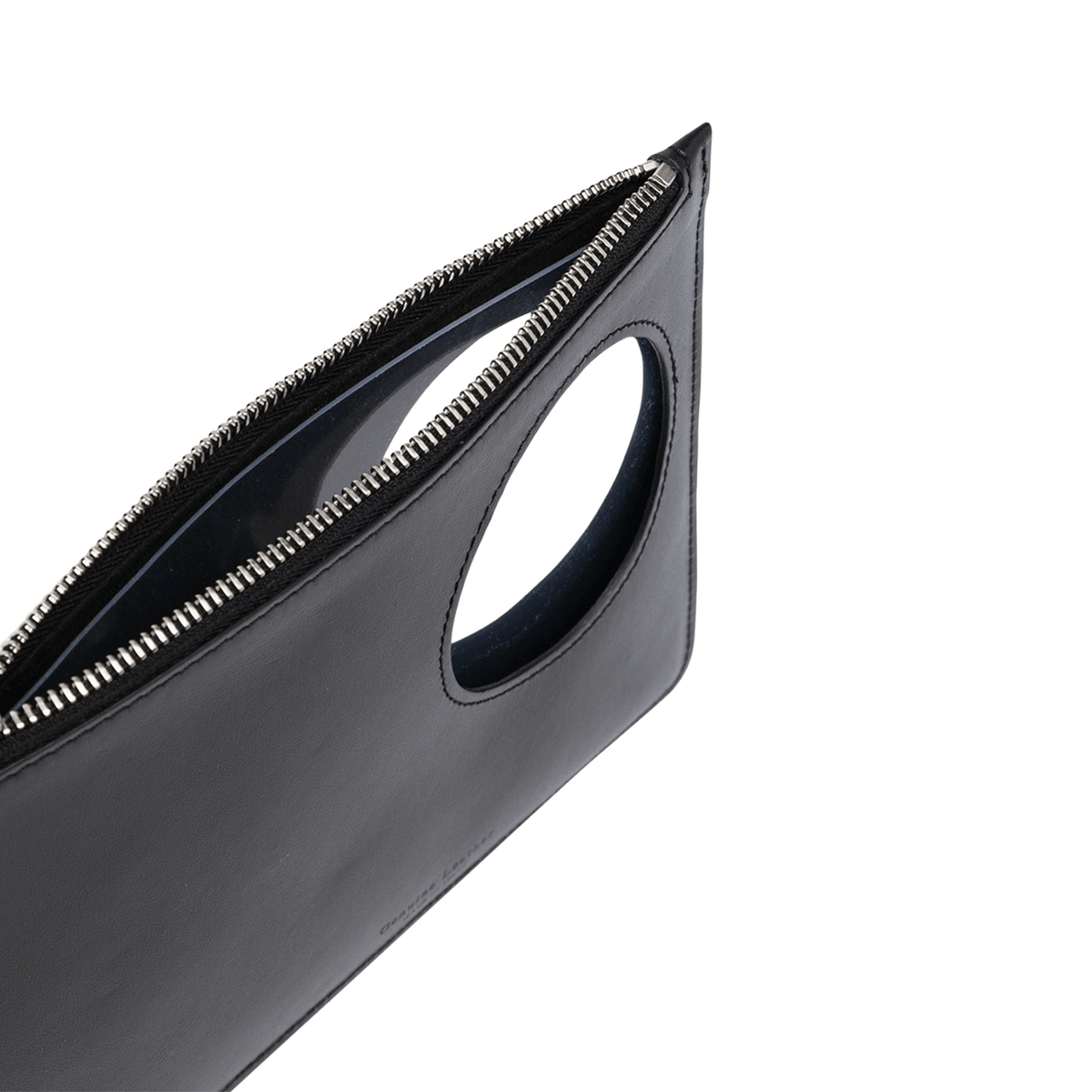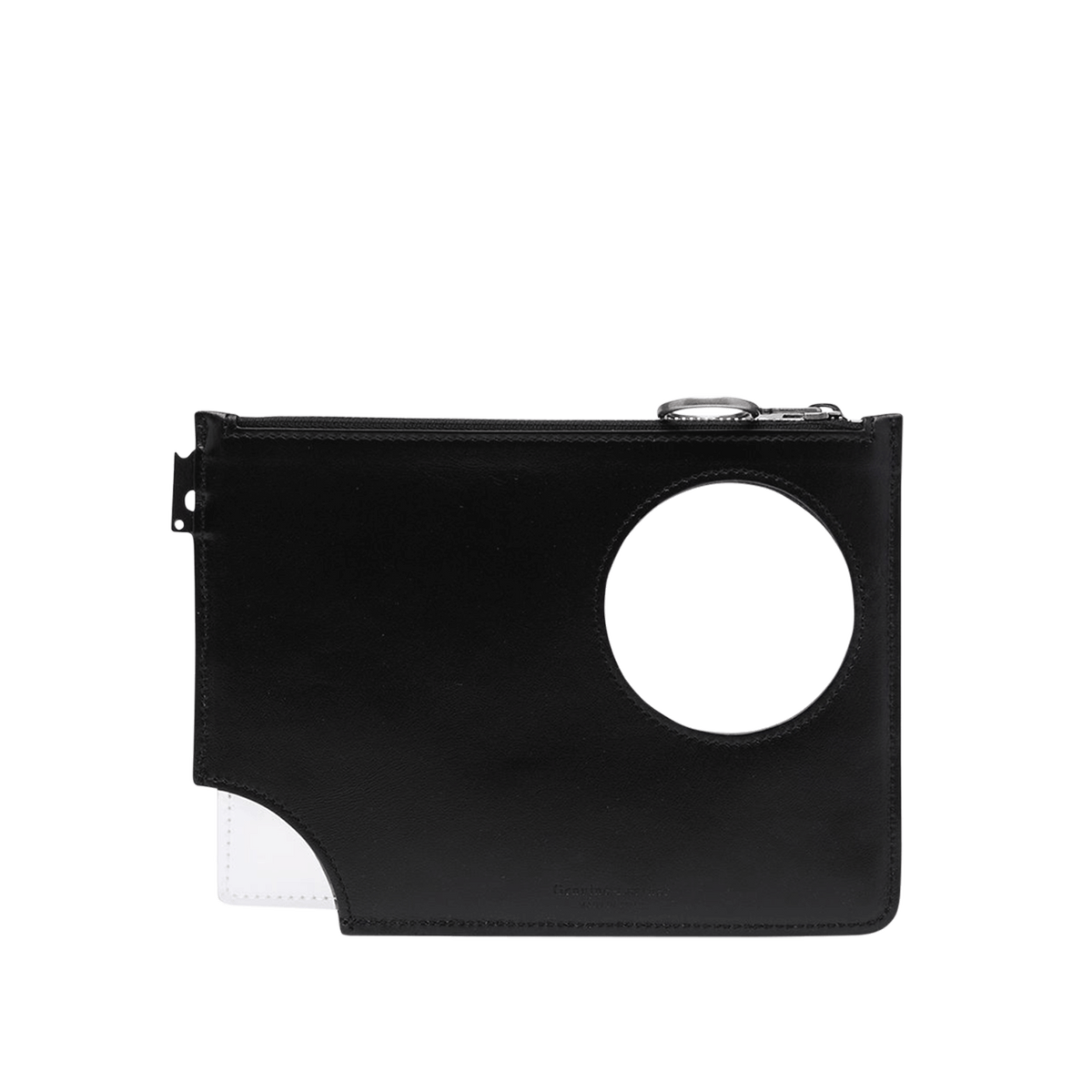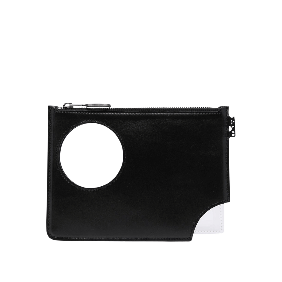 Leather pouch featuring "Meteor" hole design details. Crafted in Italy from premium black leather, zip top fastening, and lined with clear plastic to prevent contents from escaping.