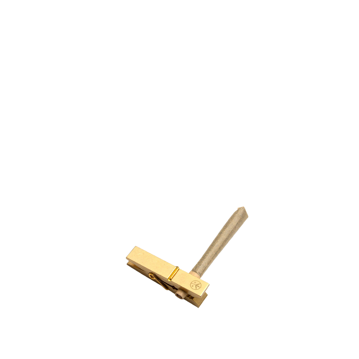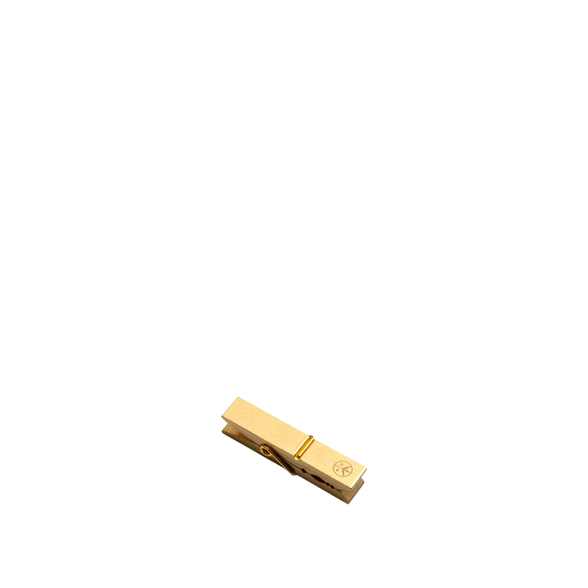 Polished brass clothes peg with inscribed Mister Green Peace logo.