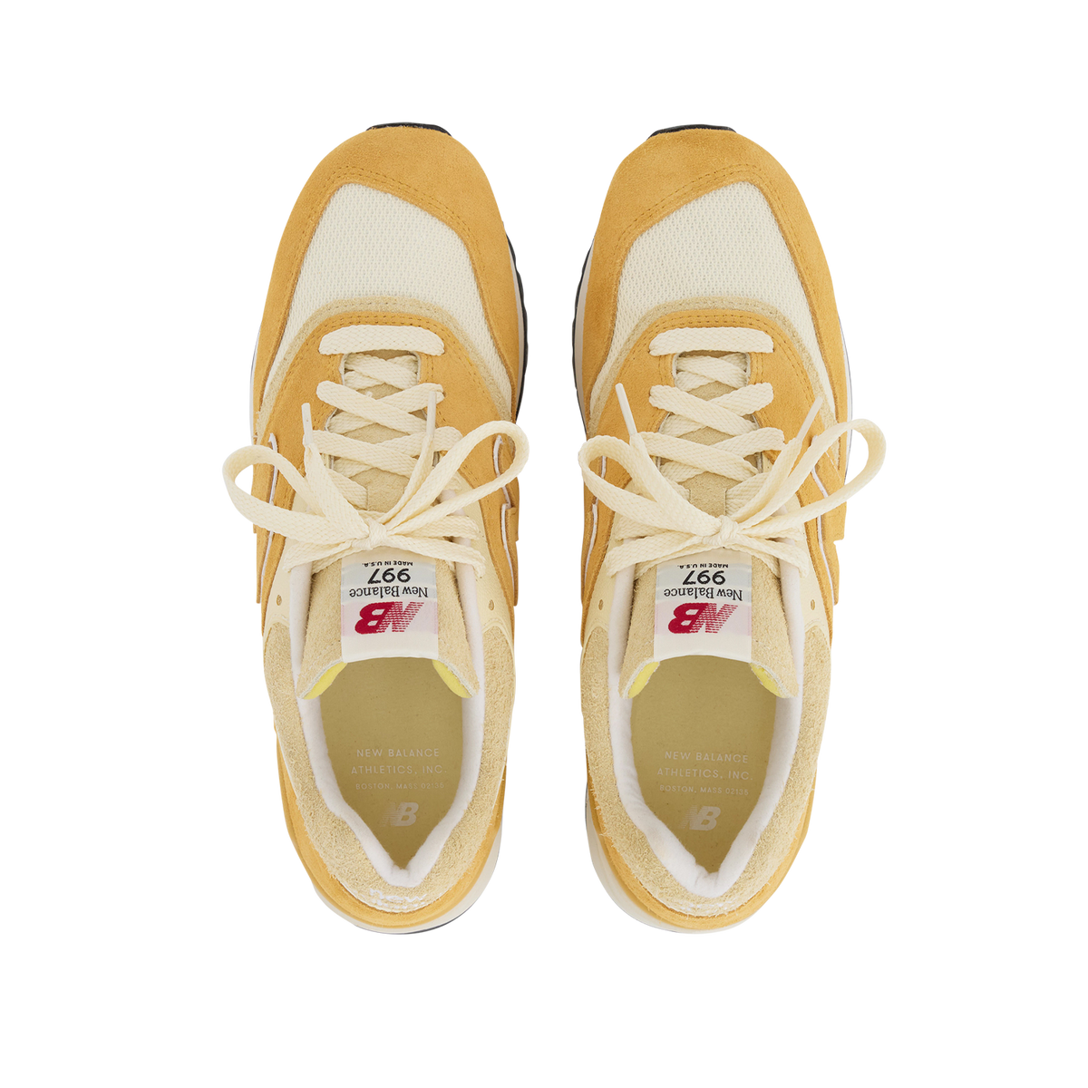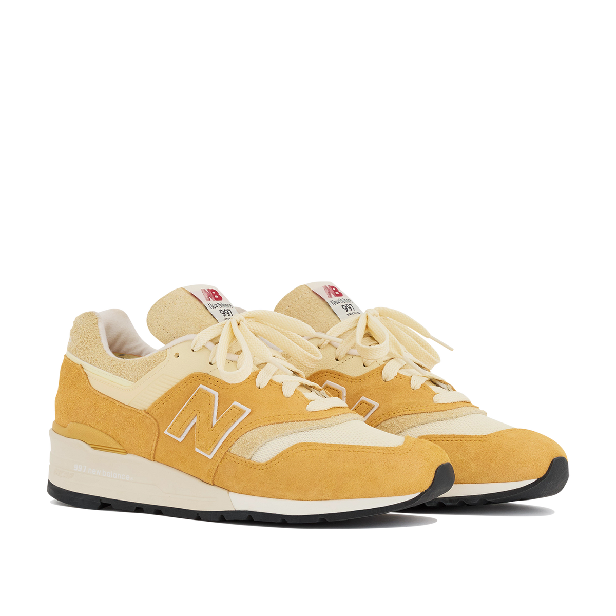 The iconic 997 returns to the Made in USA Collection for Fall/Winter '25. The classic wedge-shaped silhouette, featuring a distinctive high set heel pad, is outfitted with premium suede, mesh, and hairy suede construction and features a sophisticated neutral palette of dried apricot and calcium.