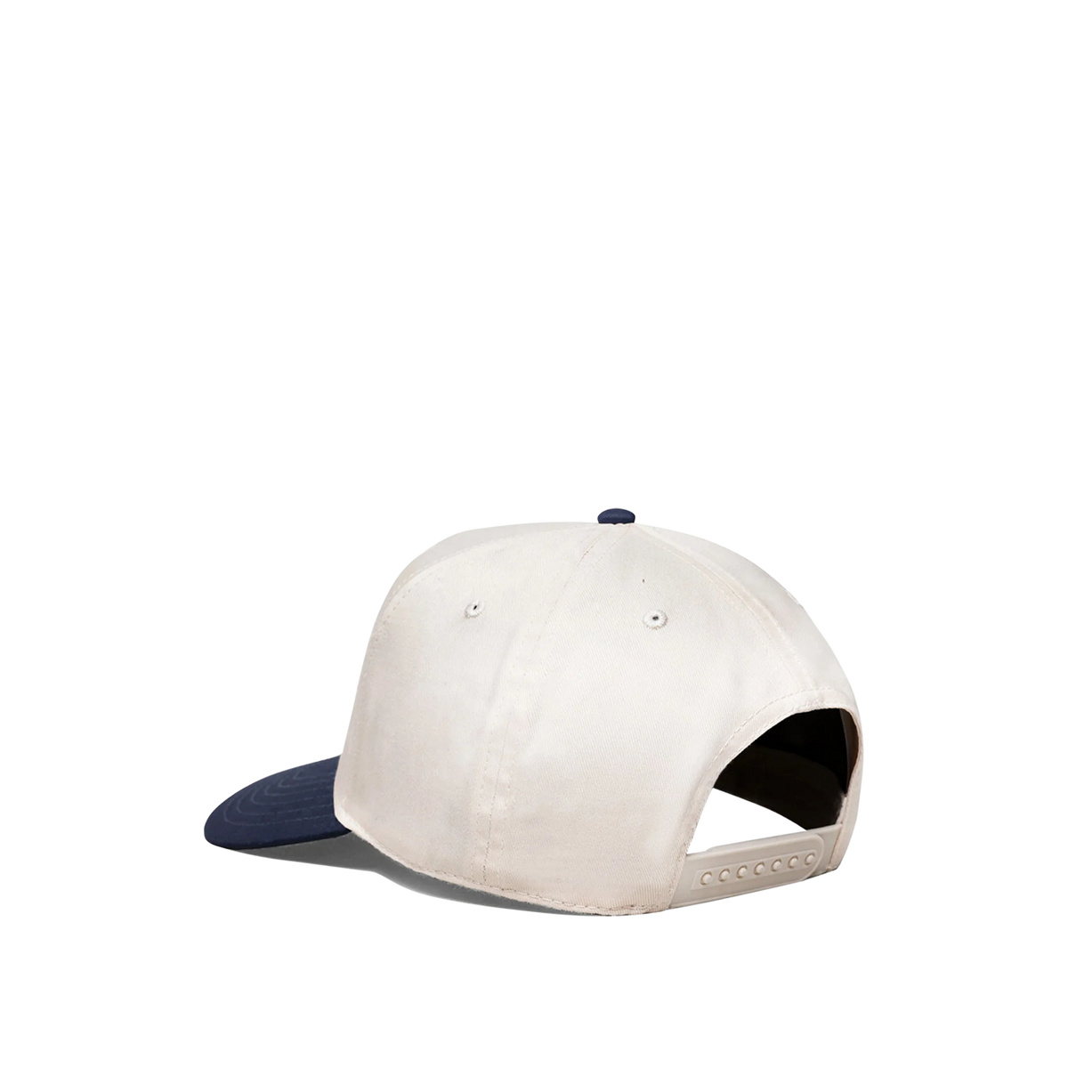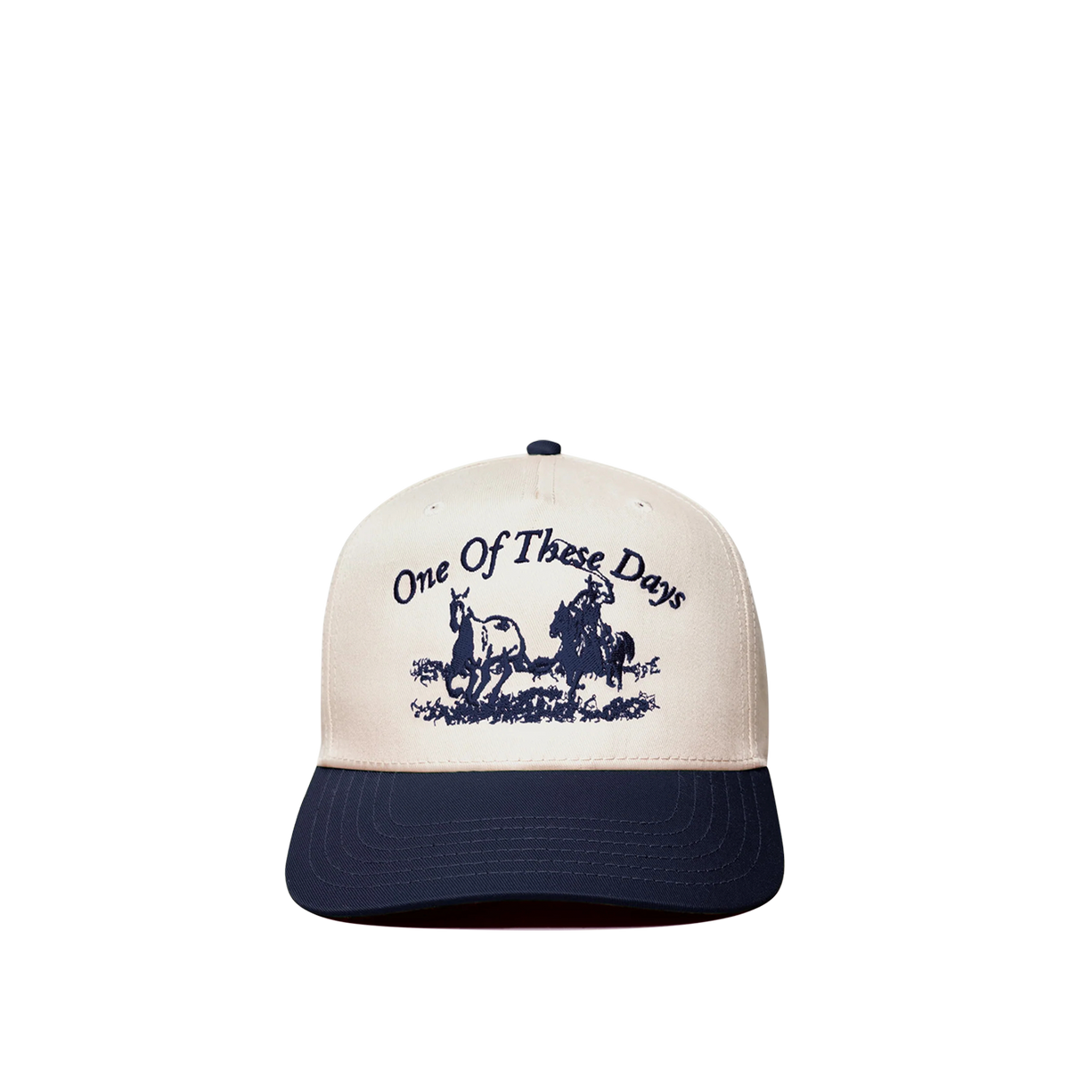 This snapback cap is constructed from natural cotton twill with a navy brim, features an embroidered graphic, and is finished with a snapback closure.