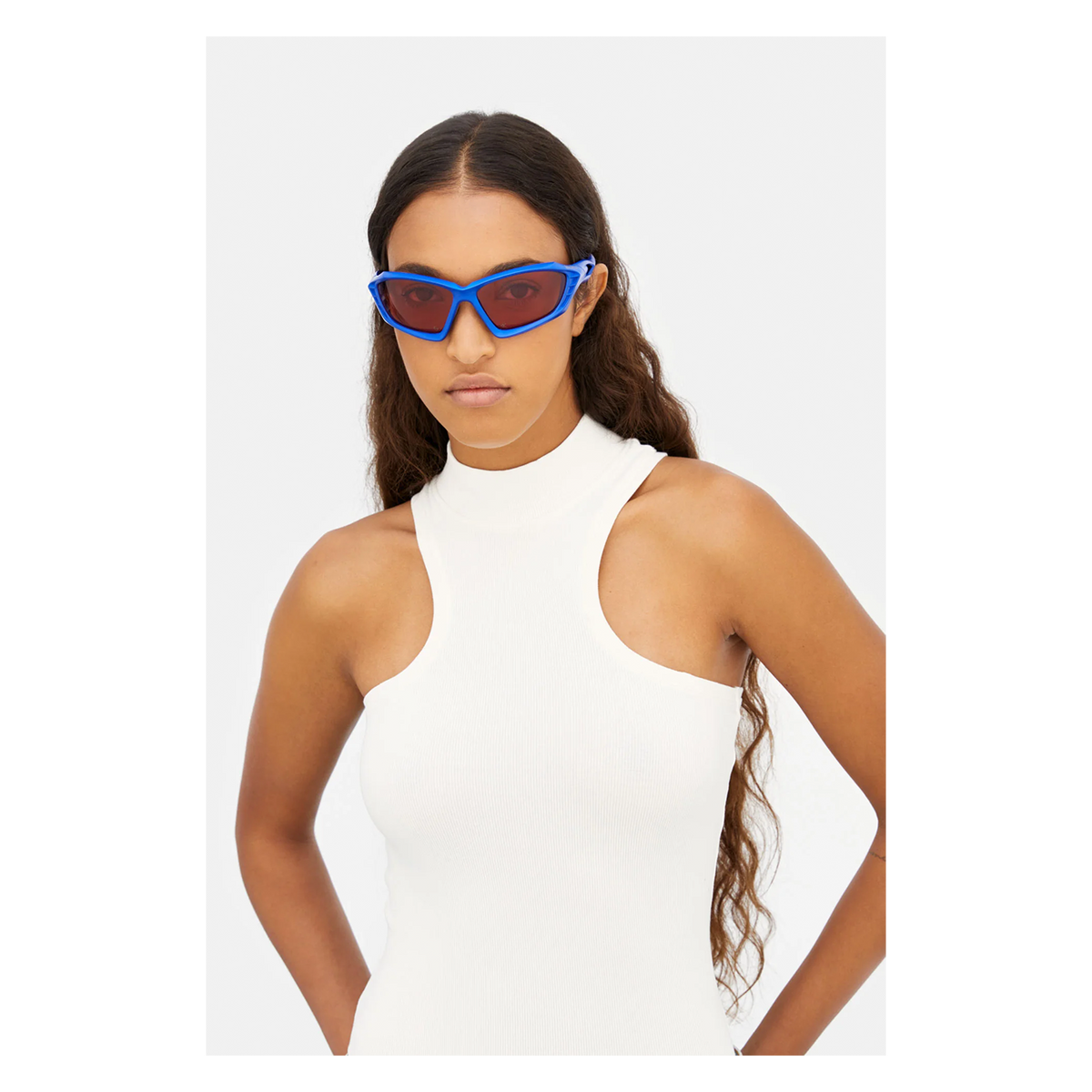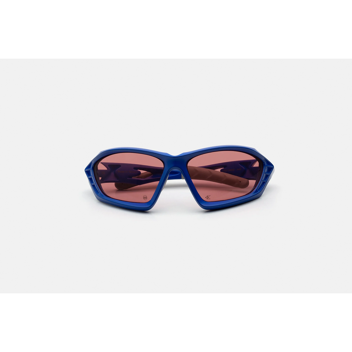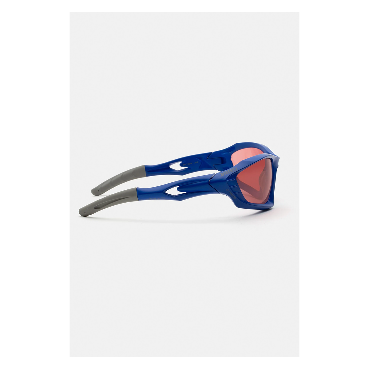 The model features a wrap-around silhouette with sharp angles and a streamlined design. Its deeply set lenses give the shape a badass character, while its structure is crafted for lightness and comfort in daily use. This is a unique shape that reinterprets Briko’s technical know-how for contemporary lifestyle. This version comes in a blue finish with contrasting bordeaux lenses.