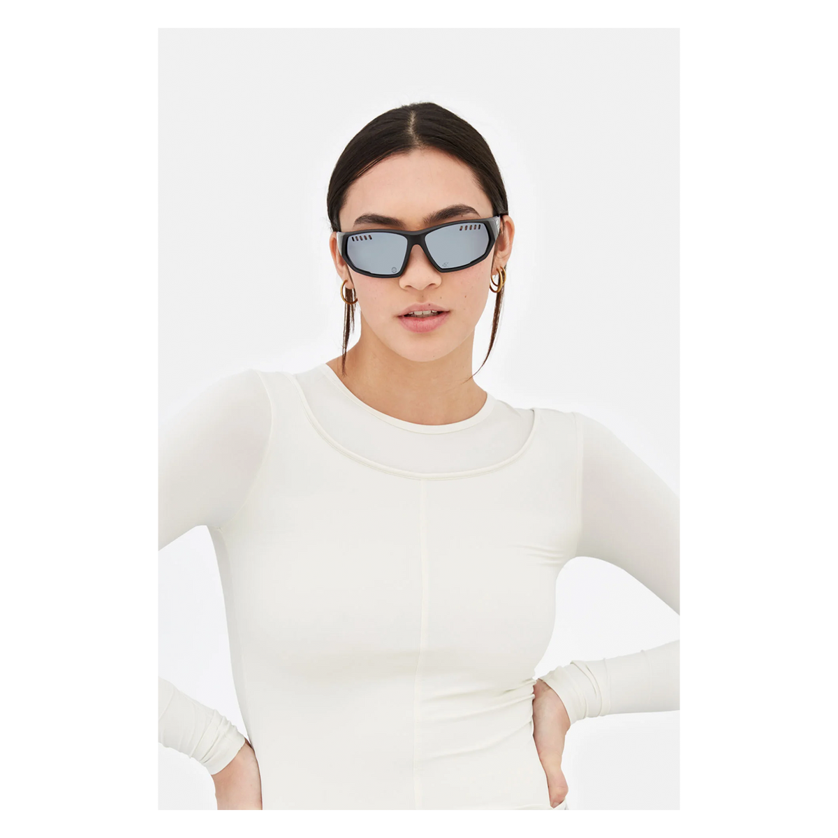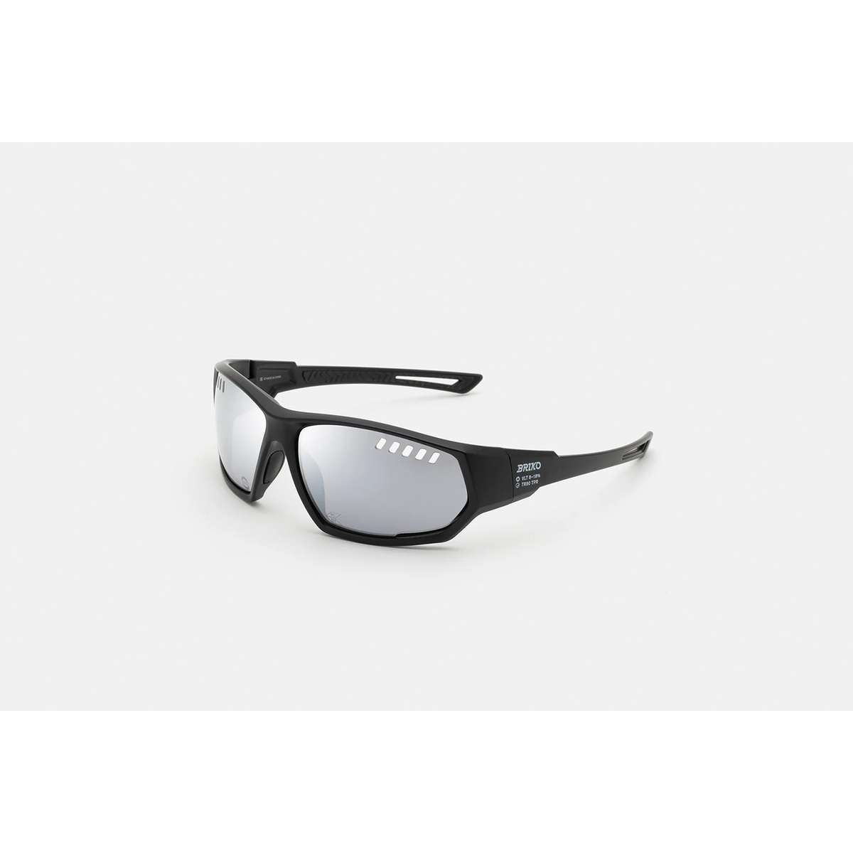 The model’s squared lenses are encased within streamlined rims, characterised by a wrap-around design. The lenses feature ventilation slits for high-end performance, while rubberised tips guarantee a perfect fit for this bold yet compact silhouette. This model comes with a black finish with grey lenses. 3M storage sleeve included.