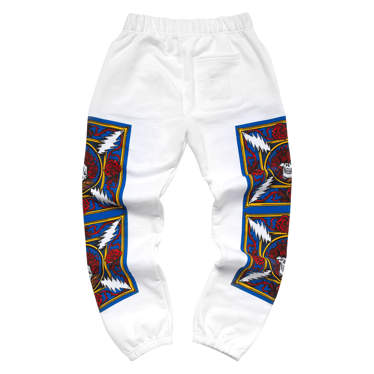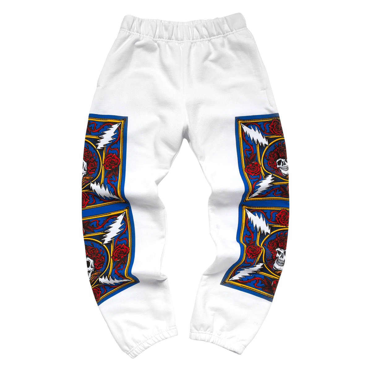 Chinatown Market and The Grateful Dead link up again, bringing you a capsule inspired by a bandana design that incorporates motifs synonymous with the legendary band. These sweatpants make a feature of bold bandana prints down each leg, highlighting the skull. rose and lightning bolt design.