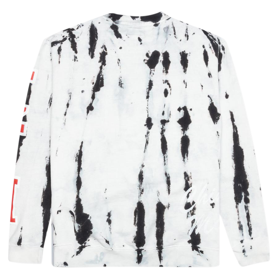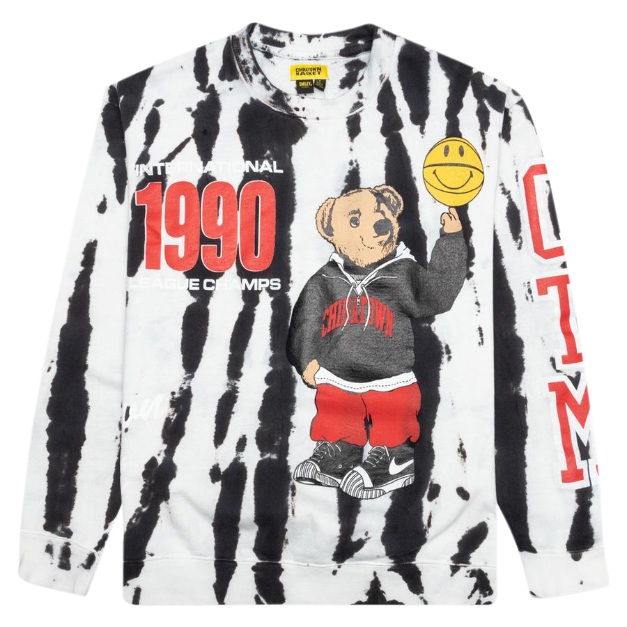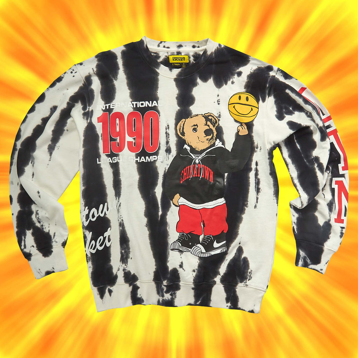 Chinatown Market crew neck sweatshirt with tie dye treatment and prints on front and sleeve. Featuring the Varsity Bear icon, complete with Smiley basketball and vintage sports inspired graphics.