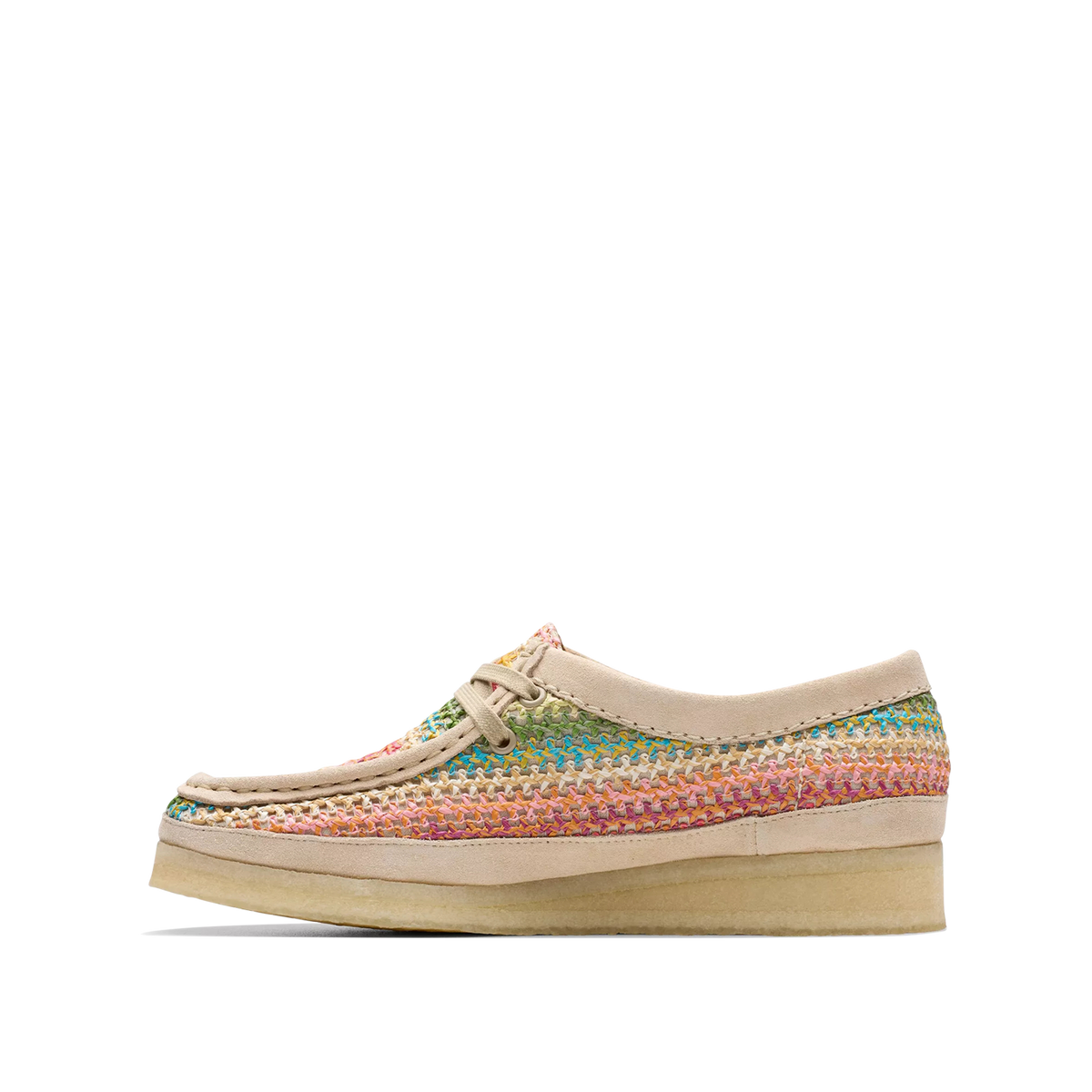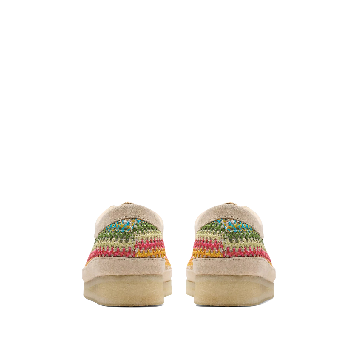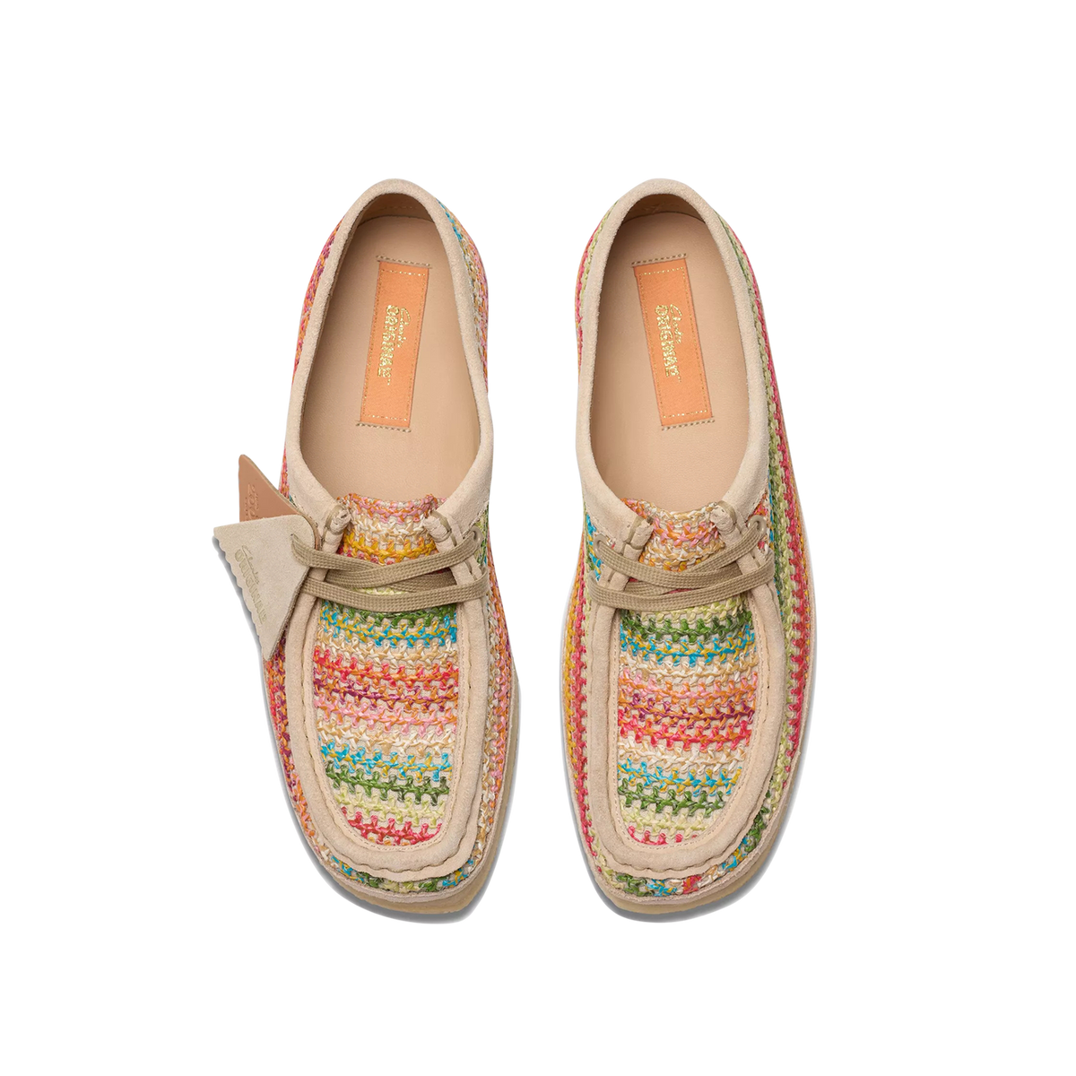 Inspired by local basket weaving, it features a hand-woven raffia upper in a bright multi-coloured palette, complemented by a natural pebble crepe sole and hand-stitched apron seam for a truly unique look.
