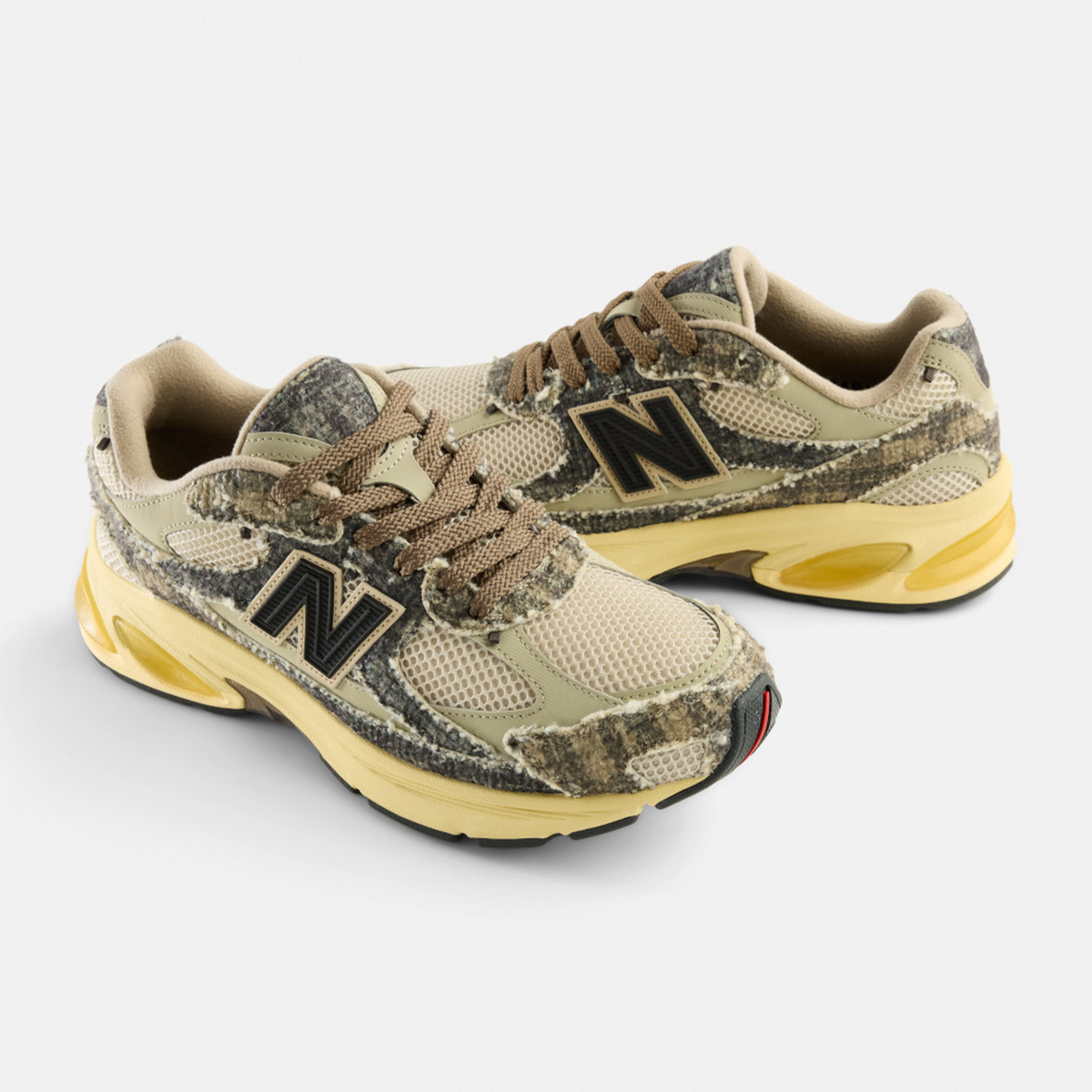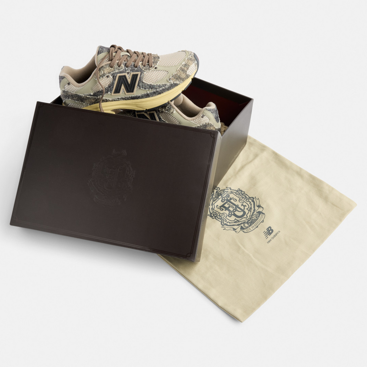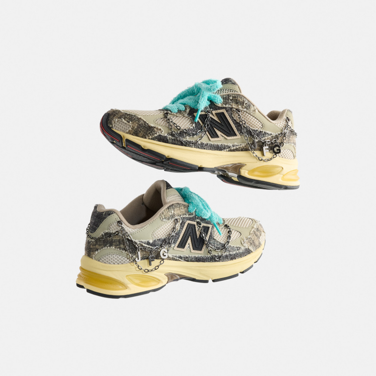 Built from recycled wool-blend textiles and mesh, the upper brings rugged yet cosy energy, accented by patent leather hits and a black molded ’N’ logo. Underfoot, a faux-sunfaded ABZORB midsole keeps things comfortable - complete with SBS cushioning and a translucent Stability Web. Light pops of red break up the neutral base and round out the pair - which comes with two standard and two fluffy textured sets of laces, optional custom JFG lace chains, a custom dust bag and co-branded custom shoe box.