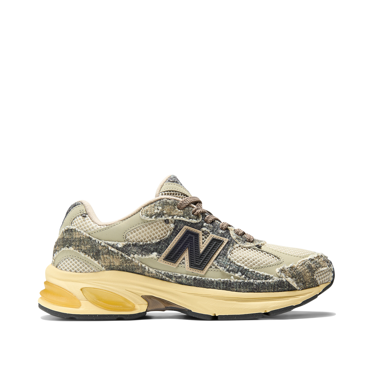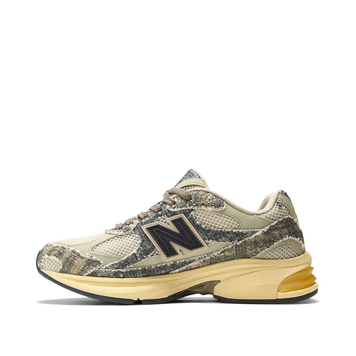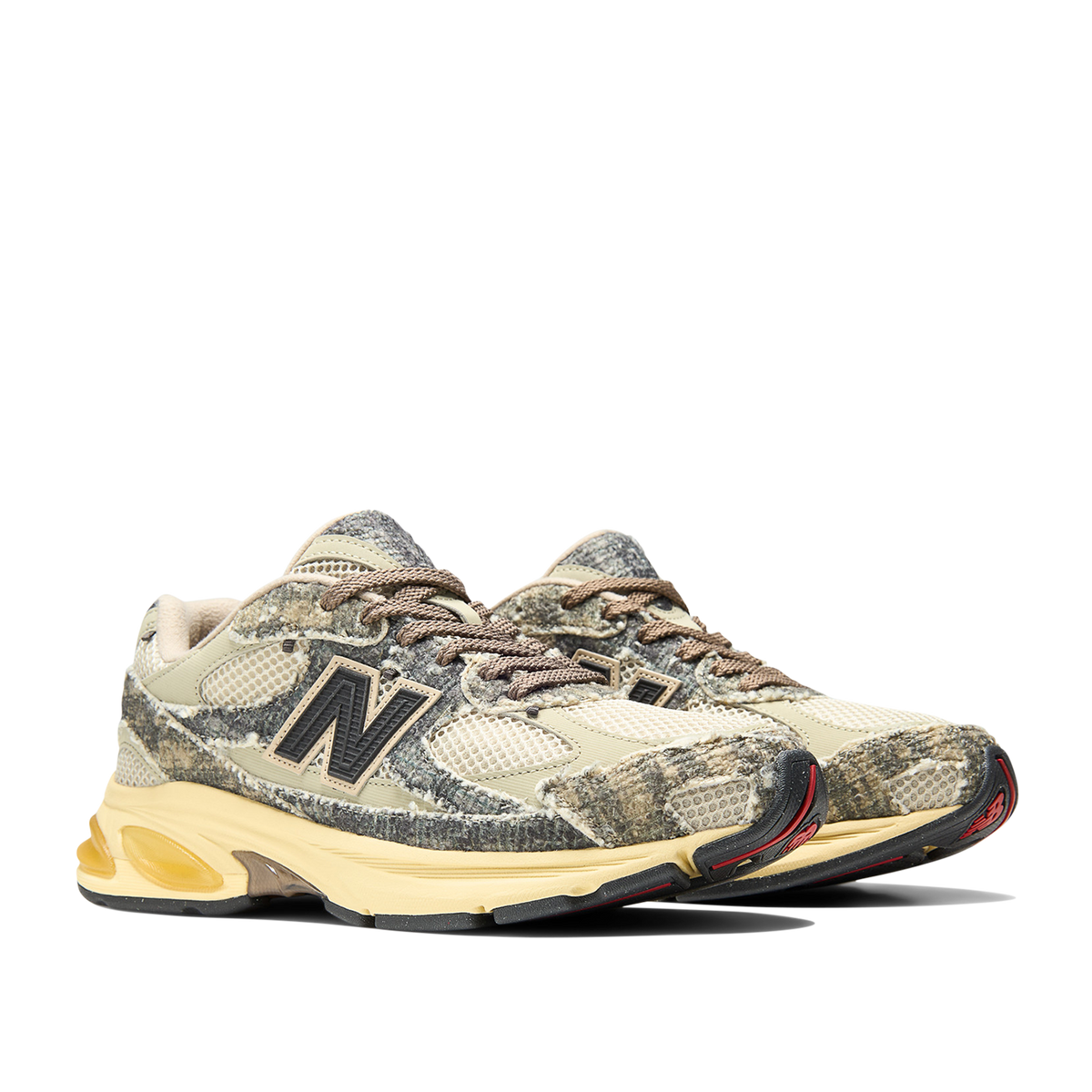 Built from recycled wool-blend textiles and mesh, the upper brings rugged yet cosy energy, accented by patent leather hits and a black molded ’N’ logo. Underfoot, a faux-sunfaded ABZORB midsole keeps things comfortable - complete with SBS cushioning and a translucent Stability Web. Light pops of red break up the neutral base and round out the pair - which comes with two standard and two fluffy textured sets of laces, optional custom JFG lace chains, a custom dust bag and co-branded custom shoe box.