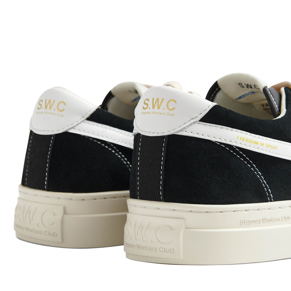 The ‘S-Strike’ features a trailing ‘S’ identifier panel on quarters and heel spoiler in contrast colour leather. Both have a neat gold foil branding and small brand messages ‘Freedom of Sport’ (right shoe) and Freedom of Thought’ (left shoe).