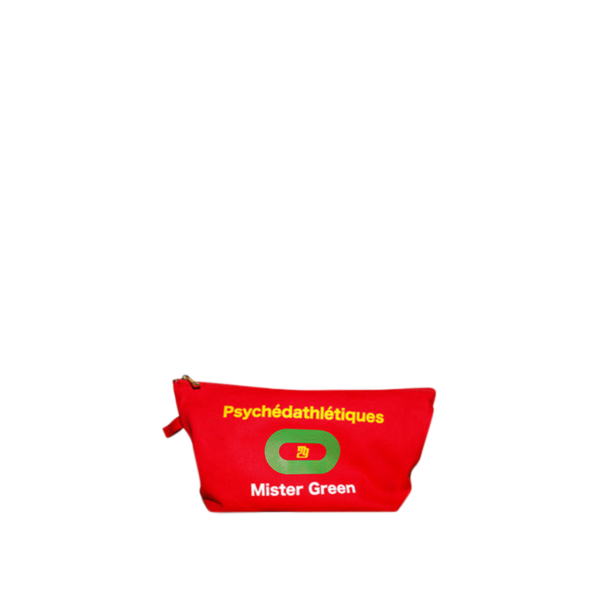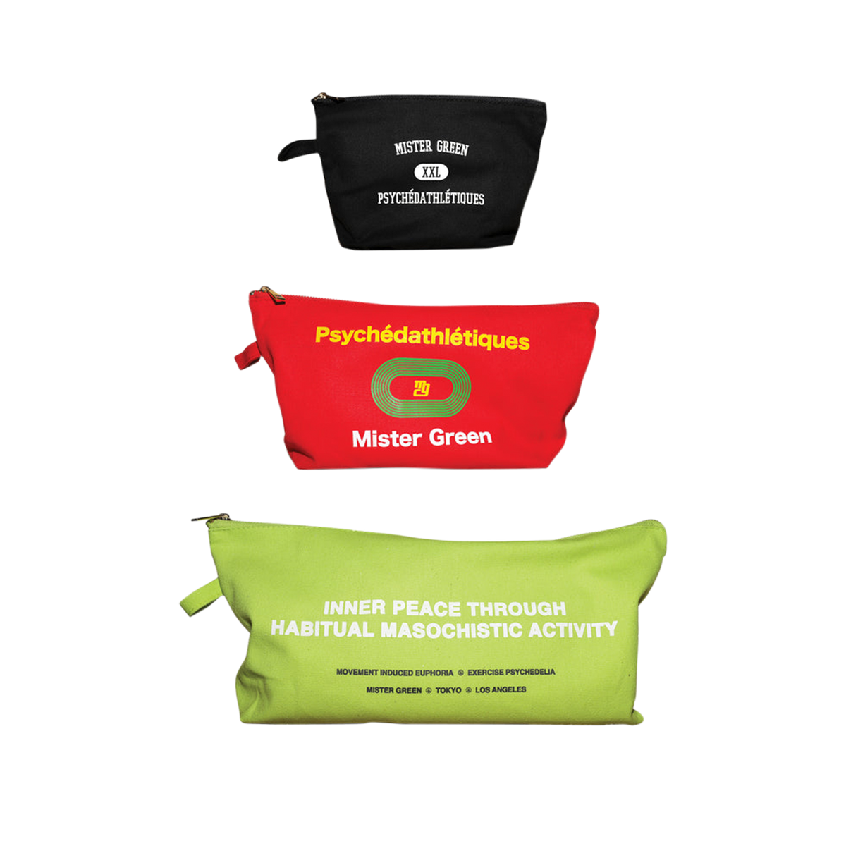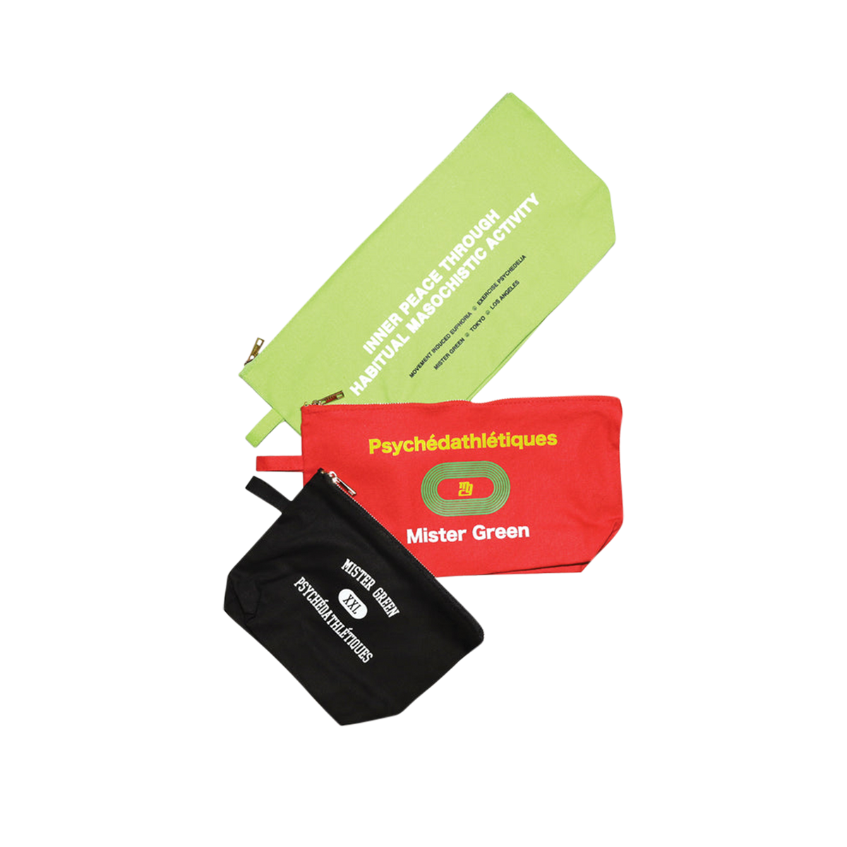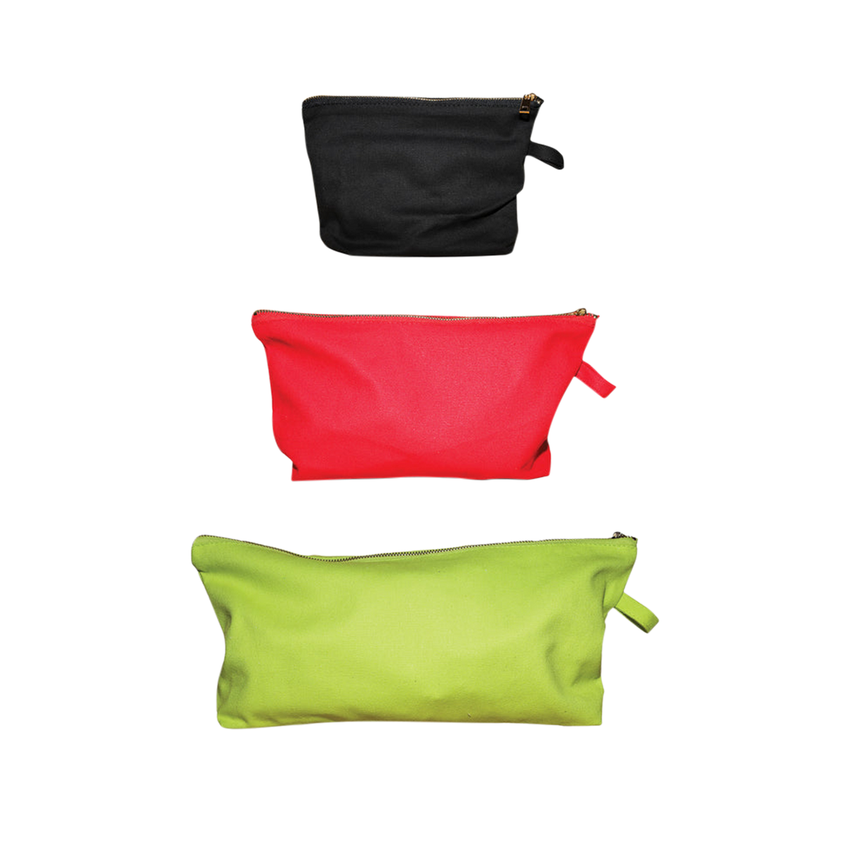 Set of three canvas tool pouches with brass zippers. Screen printed graphics on the front.