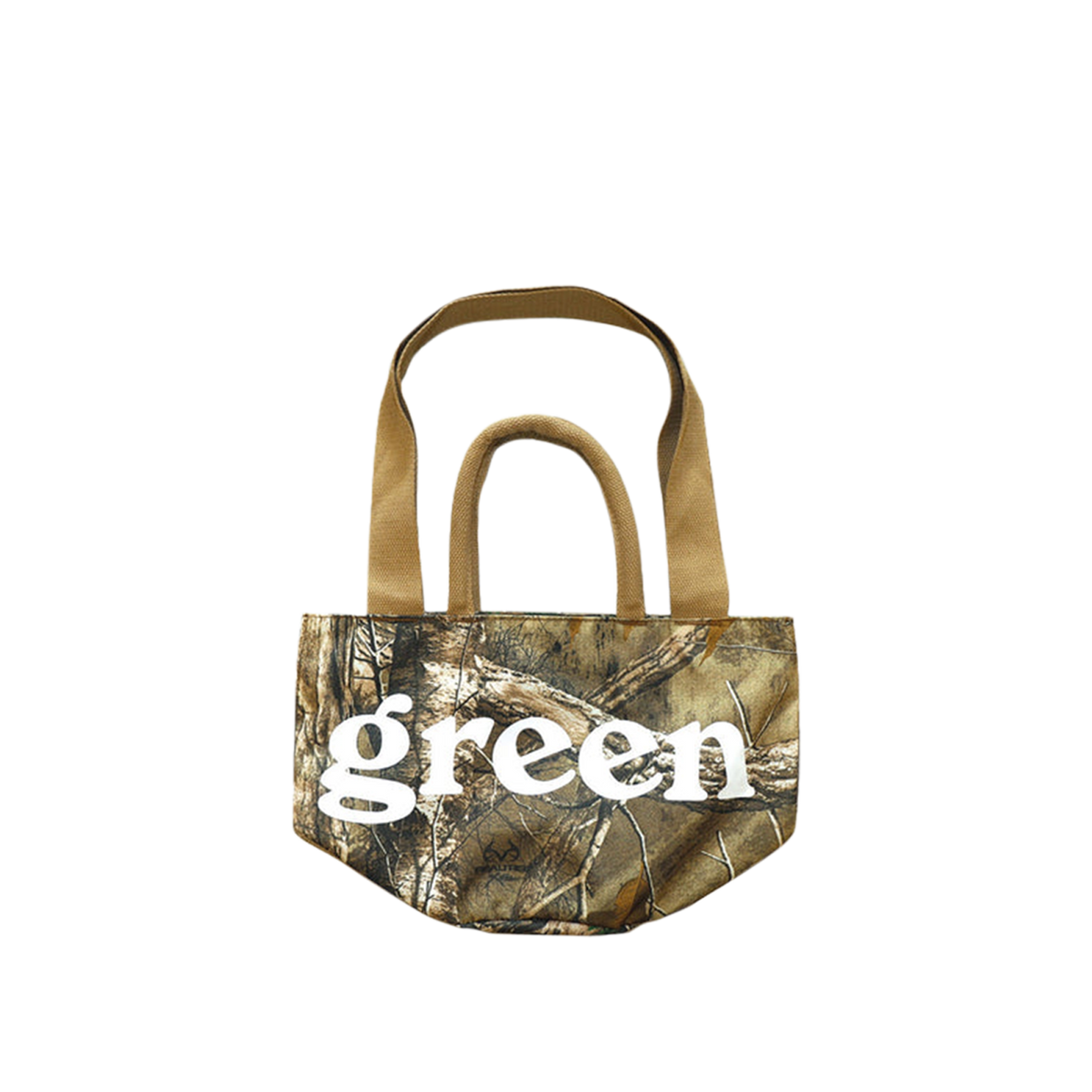 Screen printed graphics on circular real-tree nylon ripstop grow/tote bag. Lined with cotton.