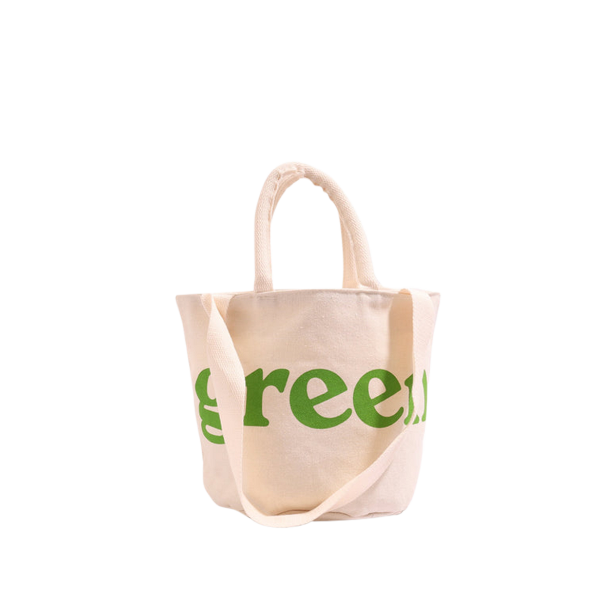 Screen printed graphics on circular canvas grow/tote bag. 6" diameter.