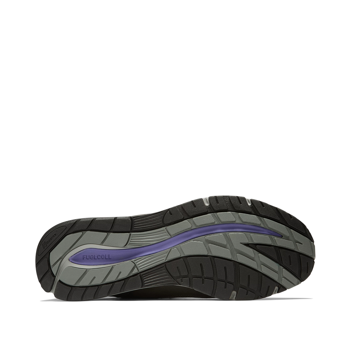 An upper featuring mesh, velvety nubuck overlays, and synthetic nubuck details is outfitted in dark neutral tones of grey, black, and olive. Brighter, lavender purple hits around the collar, ‘N’ logos, and on the sole’s ABZORB SBS pods provide contrasting colour pops infused with the unpredictable energy of the 1990s.