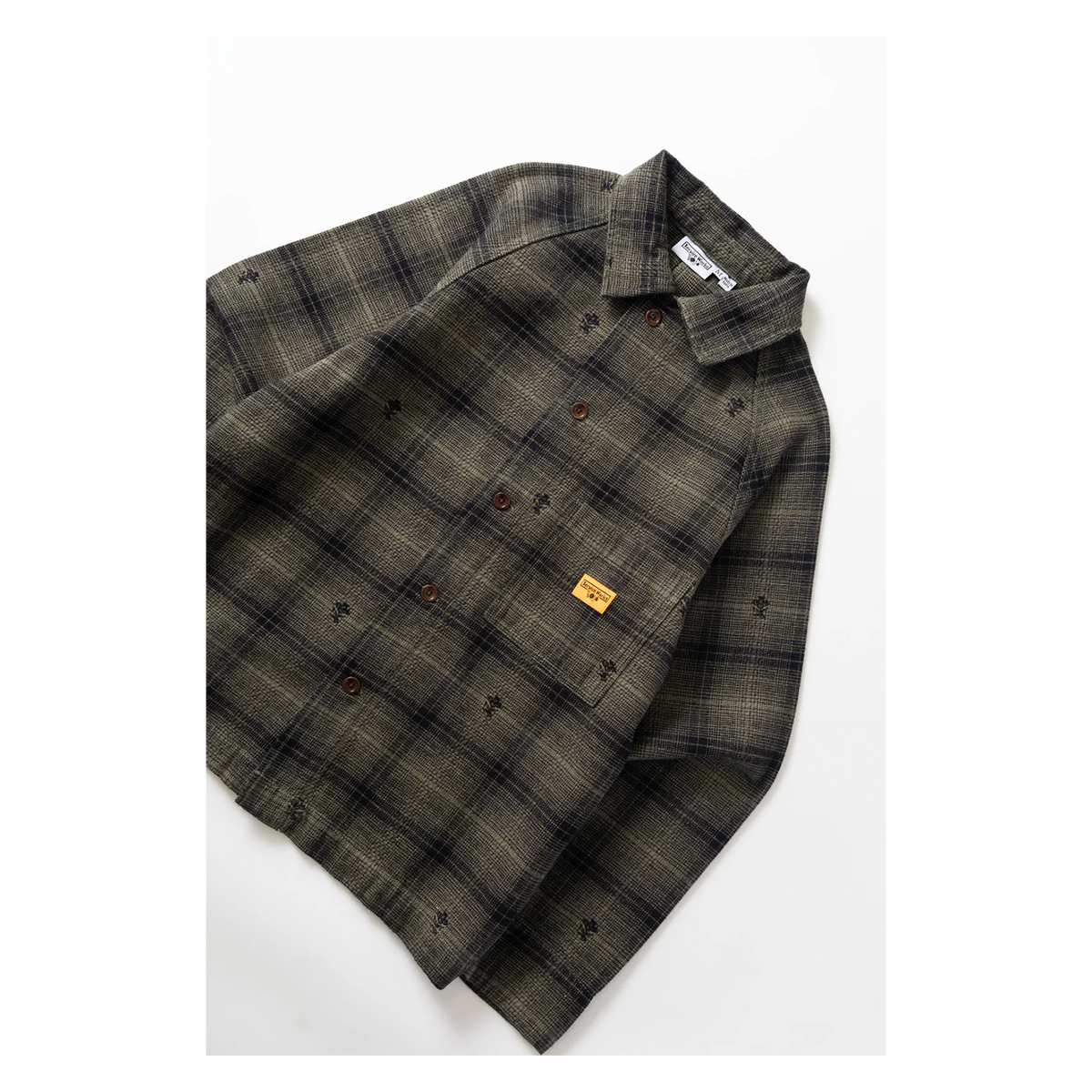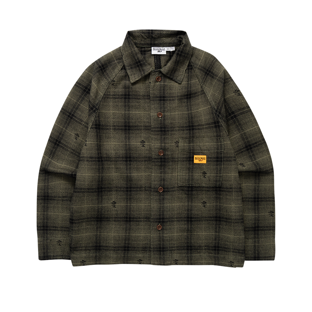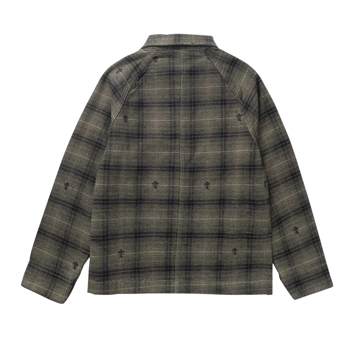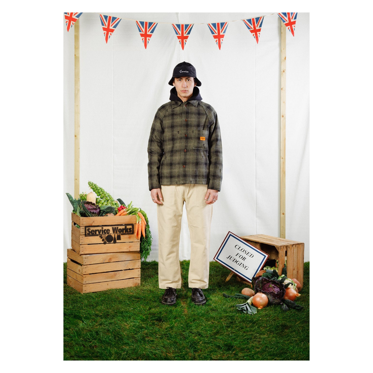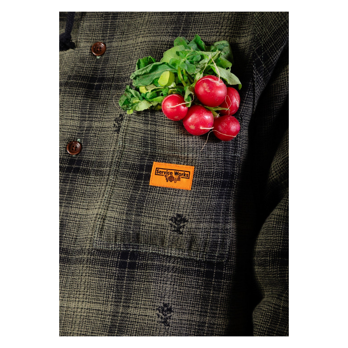 The Front of House Jacket in organic cotton flannel is cut from a custom yarn-dyed thistle plaid to a regular fit.