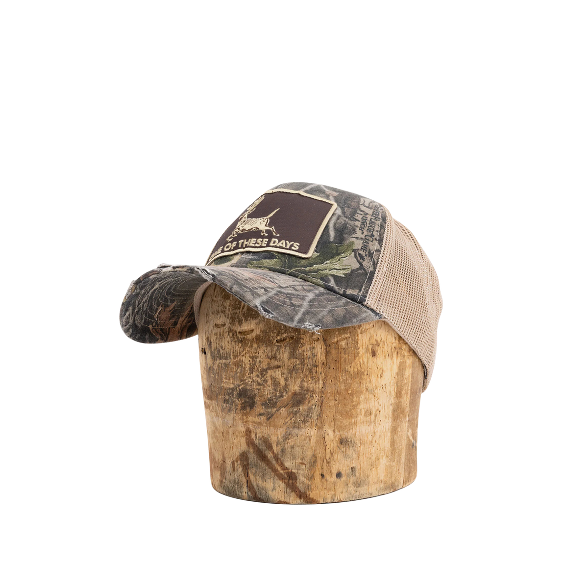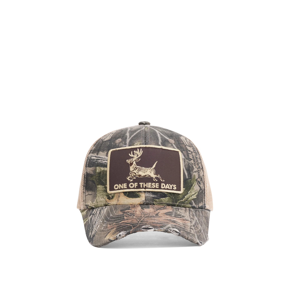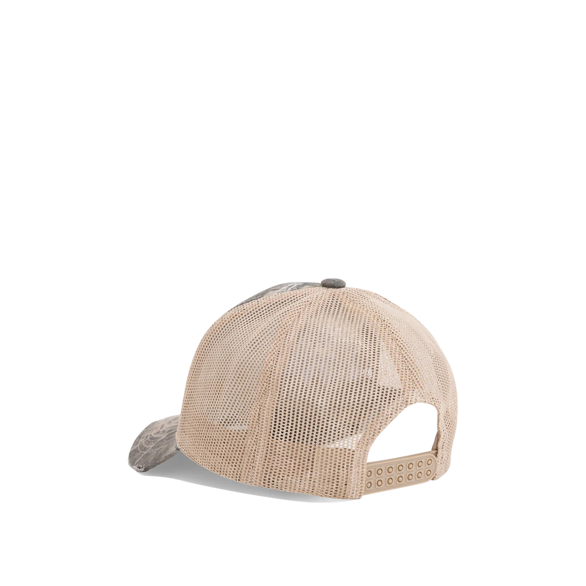 This trucker hat is constructed from tree-camo cotton twill with tan mesh back and sides. It features an applique artwork, contrast stitching, distressed details and is finished with a snapback closure.