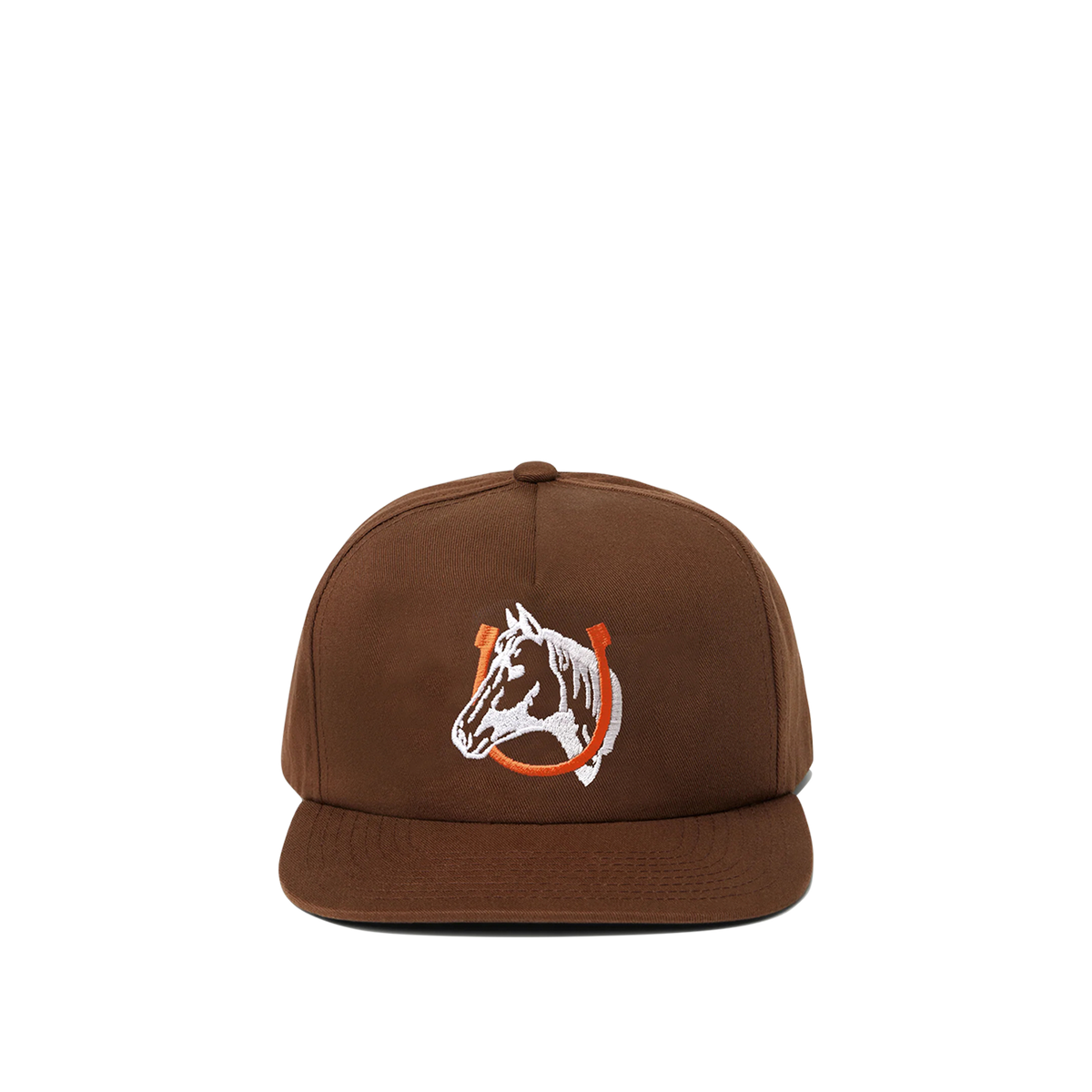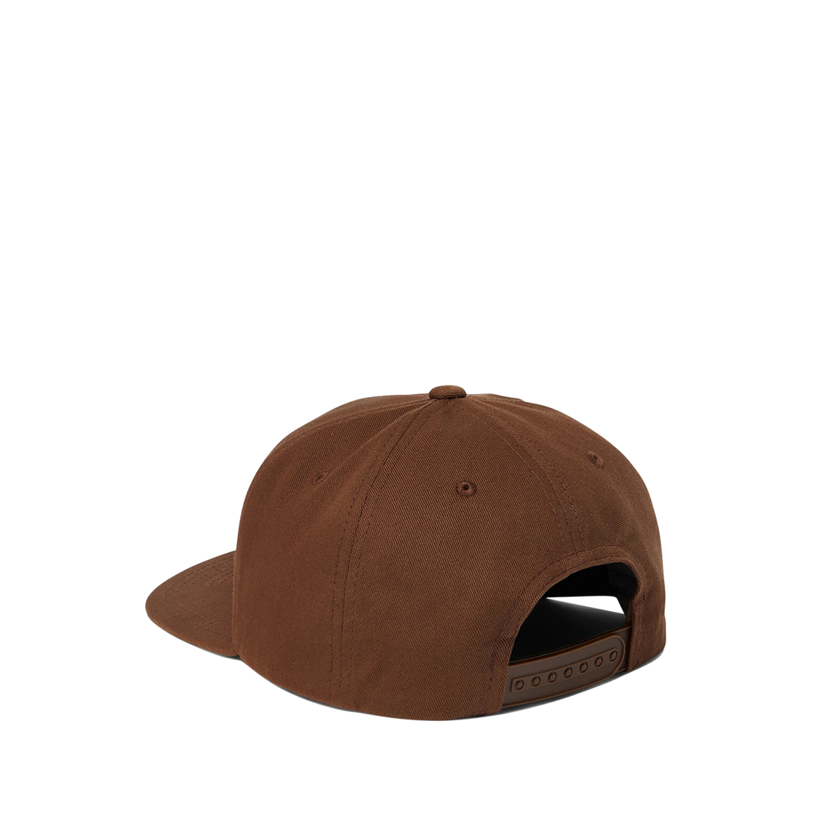 This snapback cap is constructed from brown cotton twill, features an embroidered graphic, and is finished with a snapback closure.
