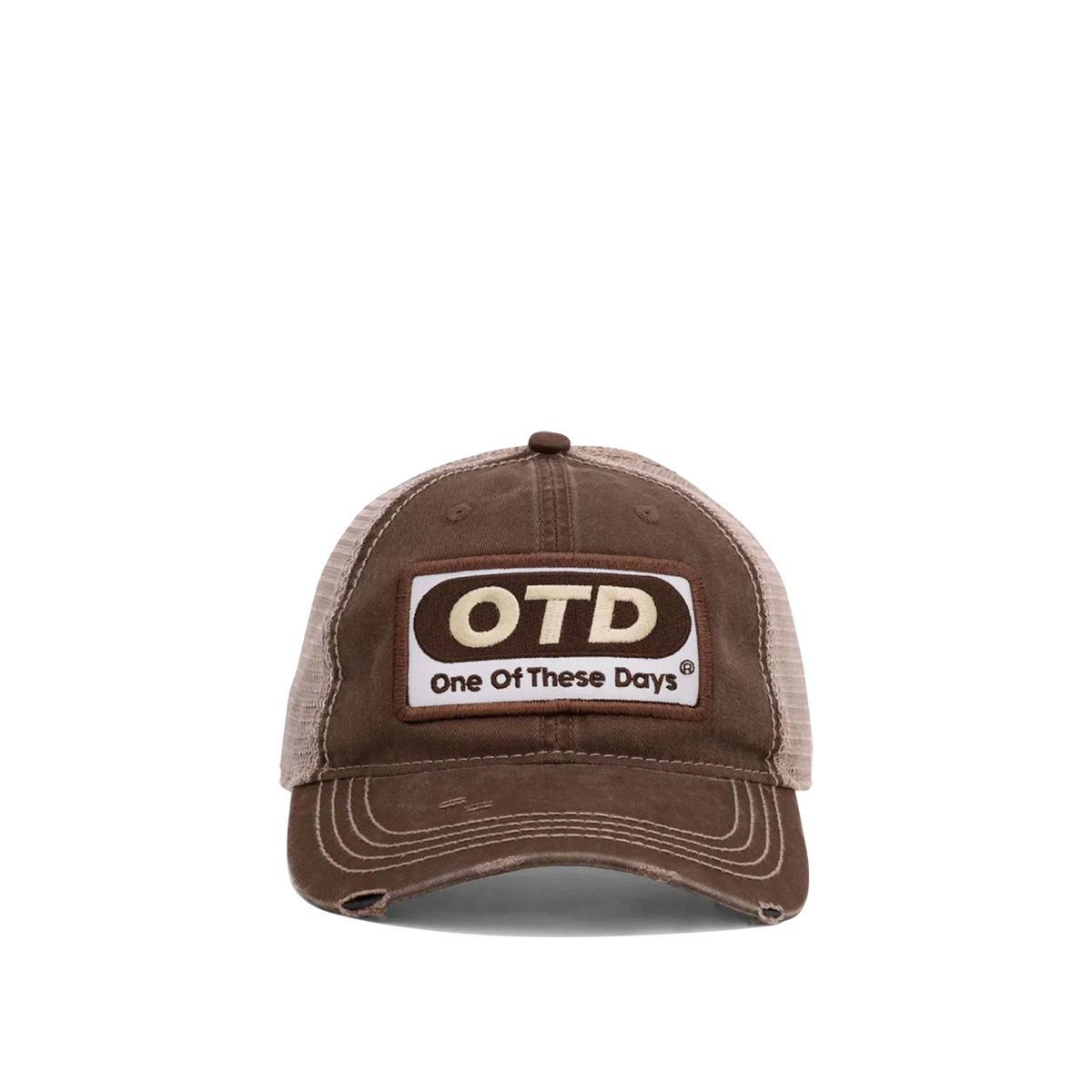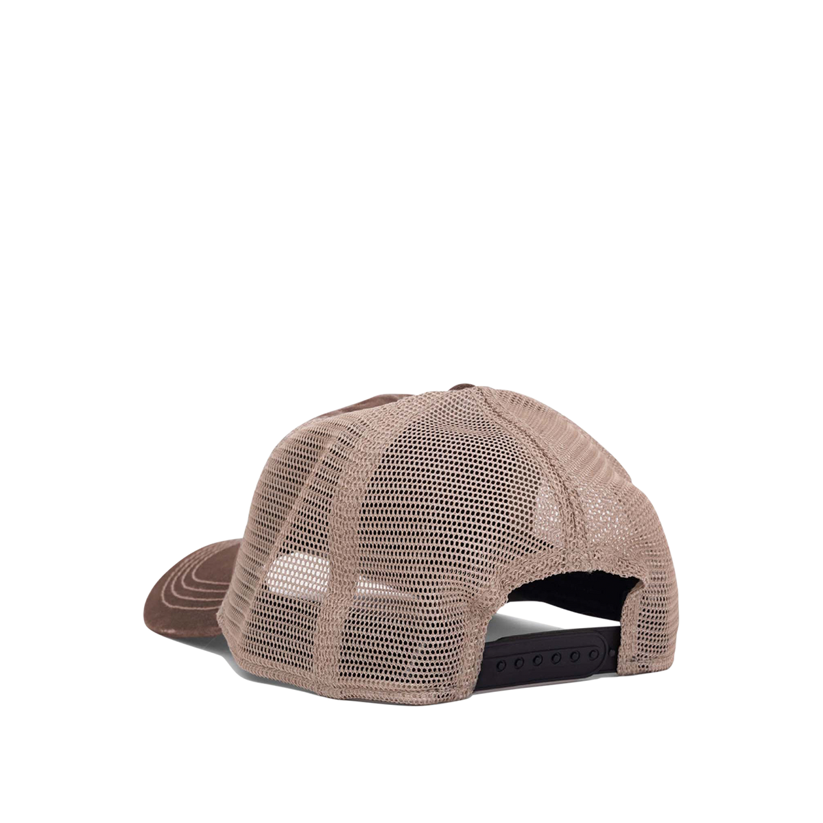 This trucker hat is constructed from brown cotton twill with tan mesh back and sides. It features an applique artwork, contrast stitching, distressed details and is finished with a snapback closure.