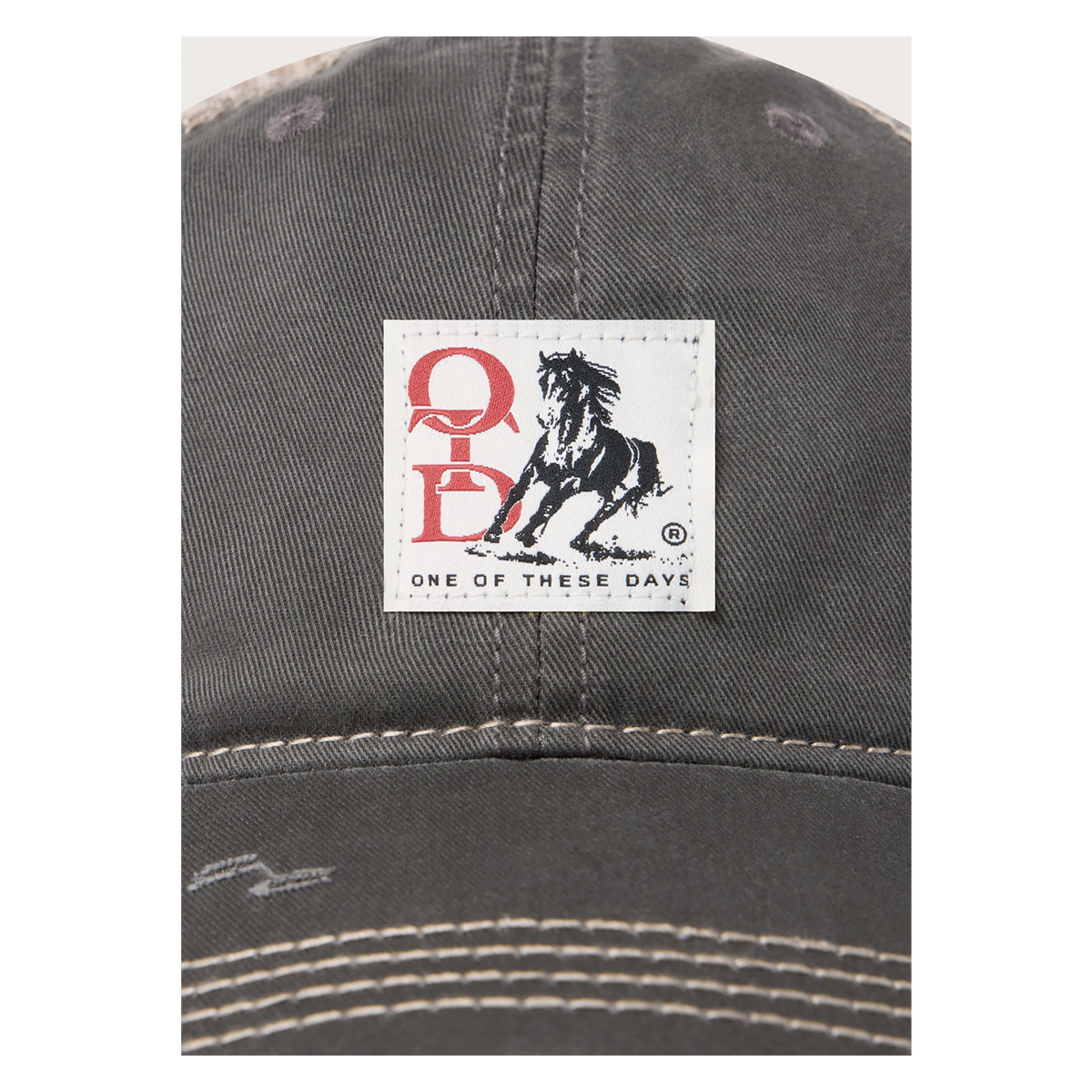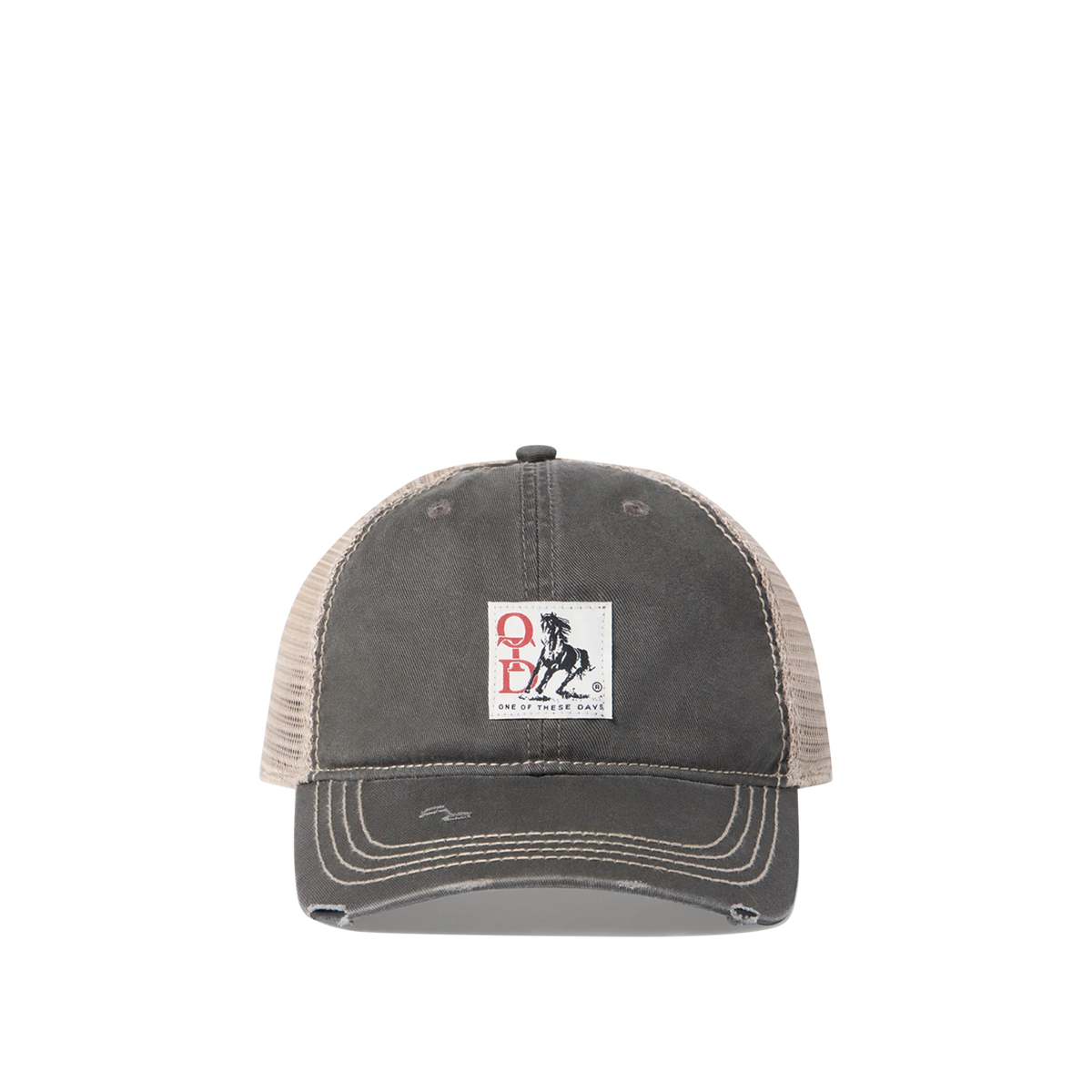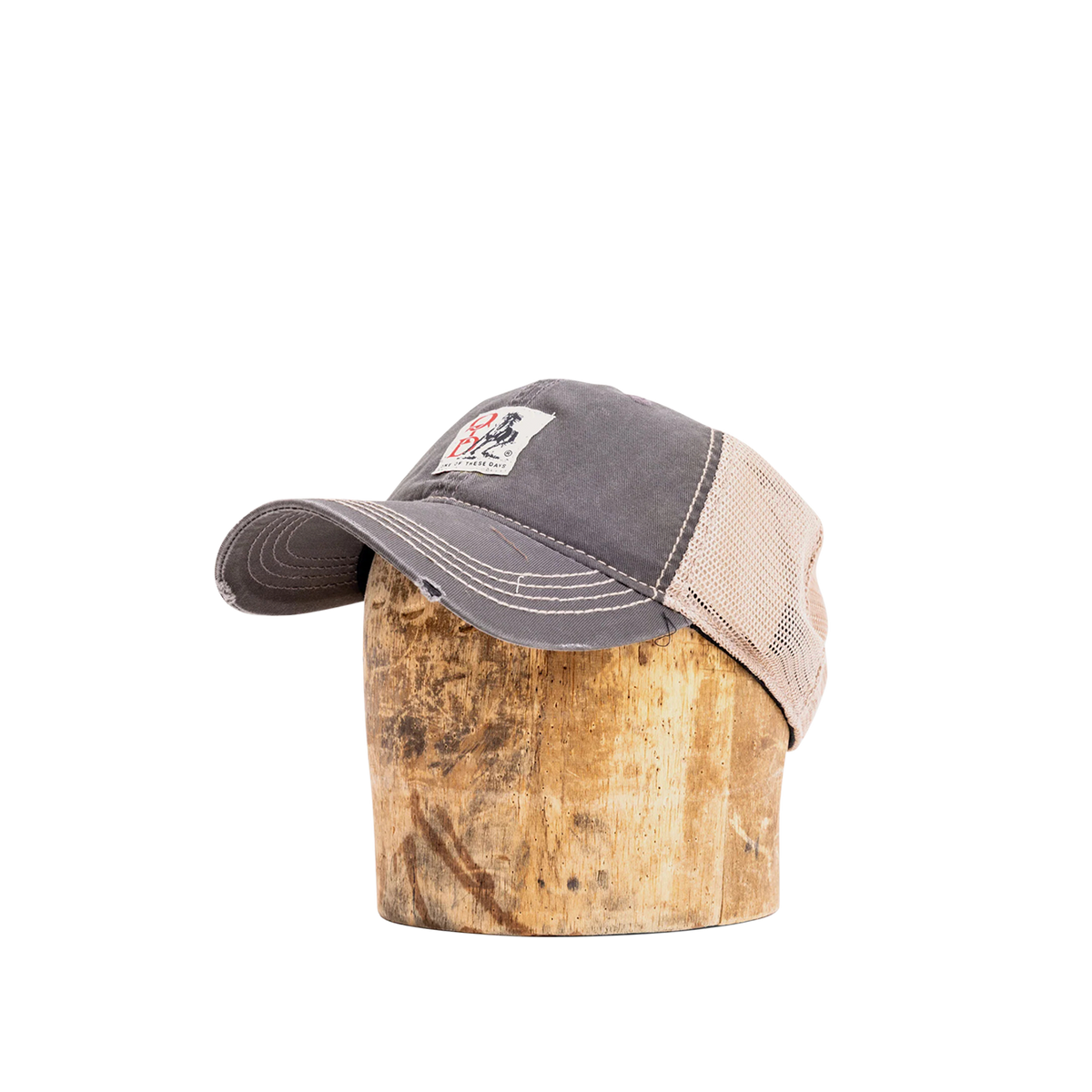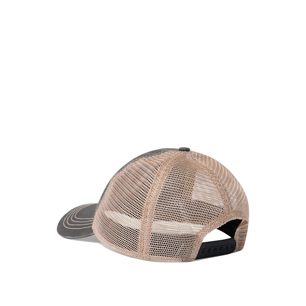 This trucker hat is constructed from brown cotton twill with tan mesh back and sides. It features a woven label, contrast stitching, distressed details and is finished with a snapback closure.