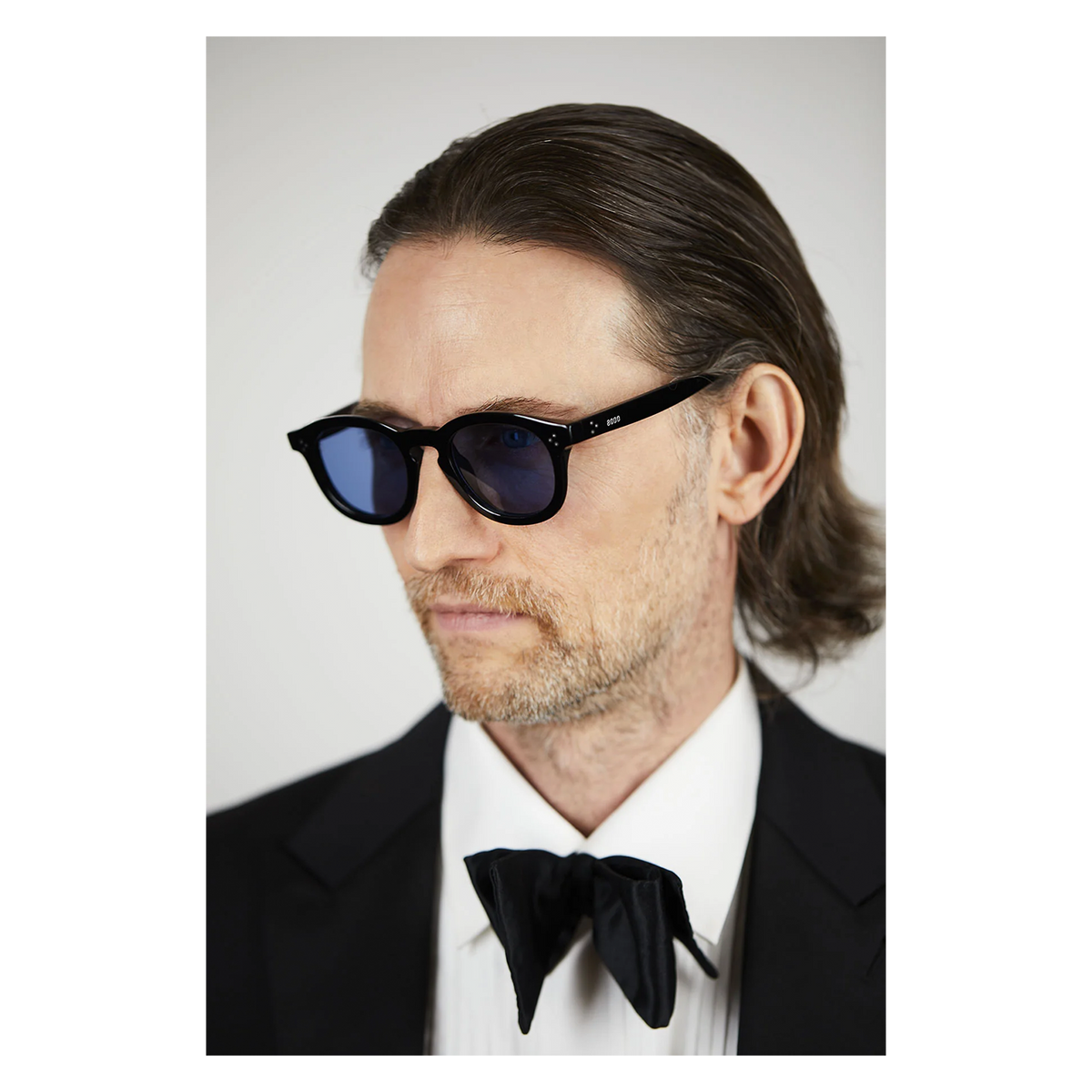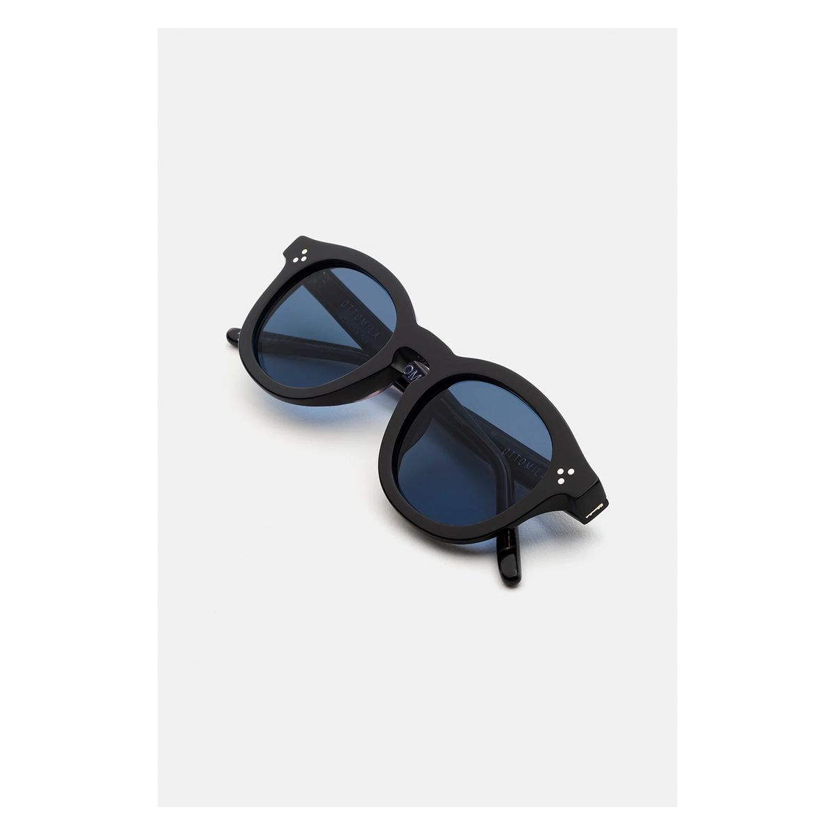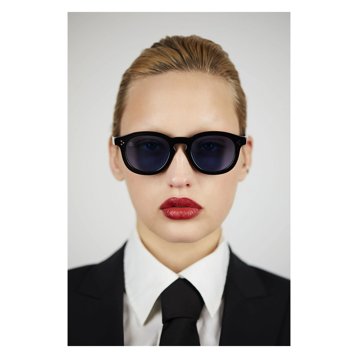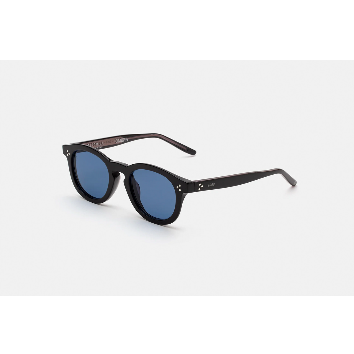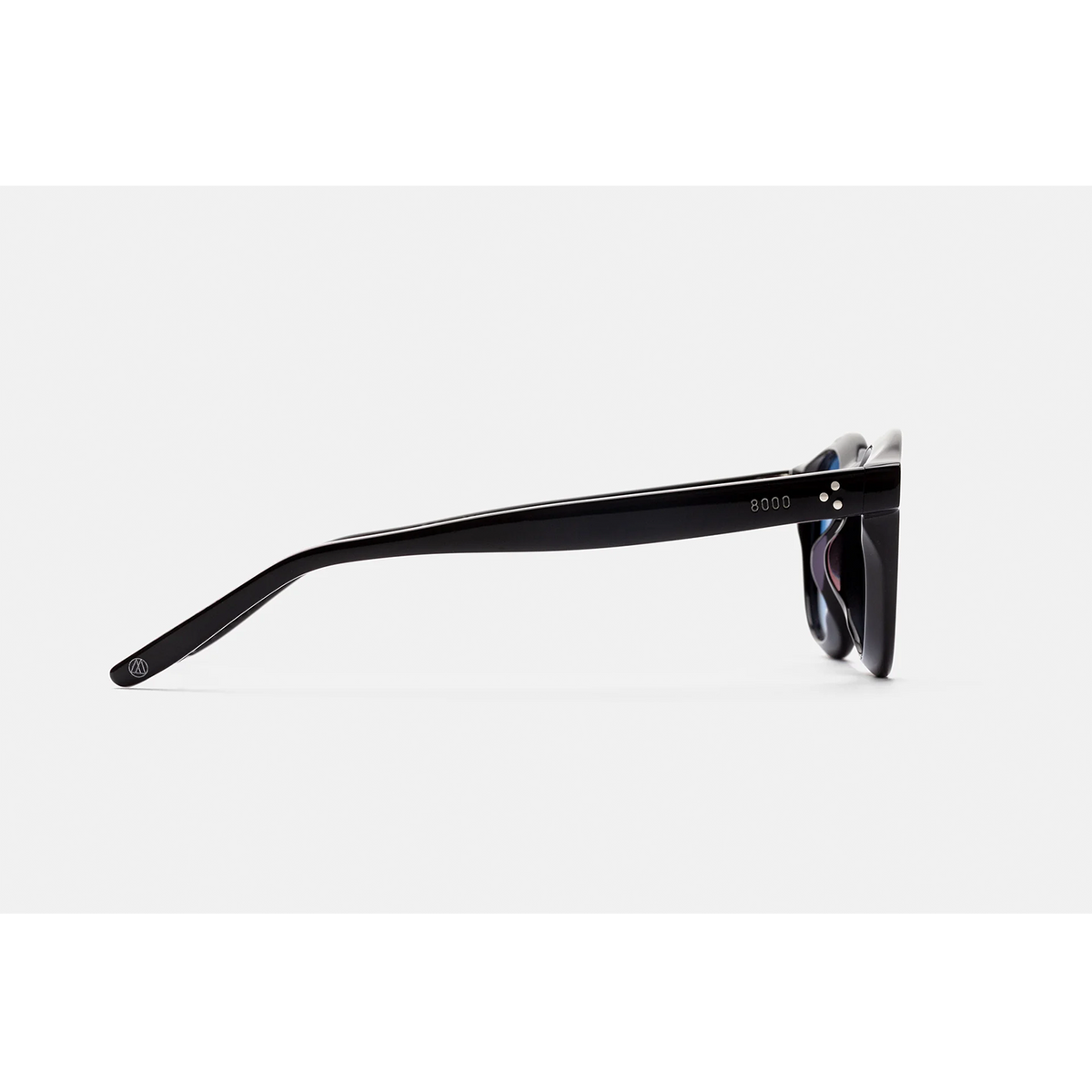 This version comes in a shiny black acetate and deep blue tinted Zeiss lenses.