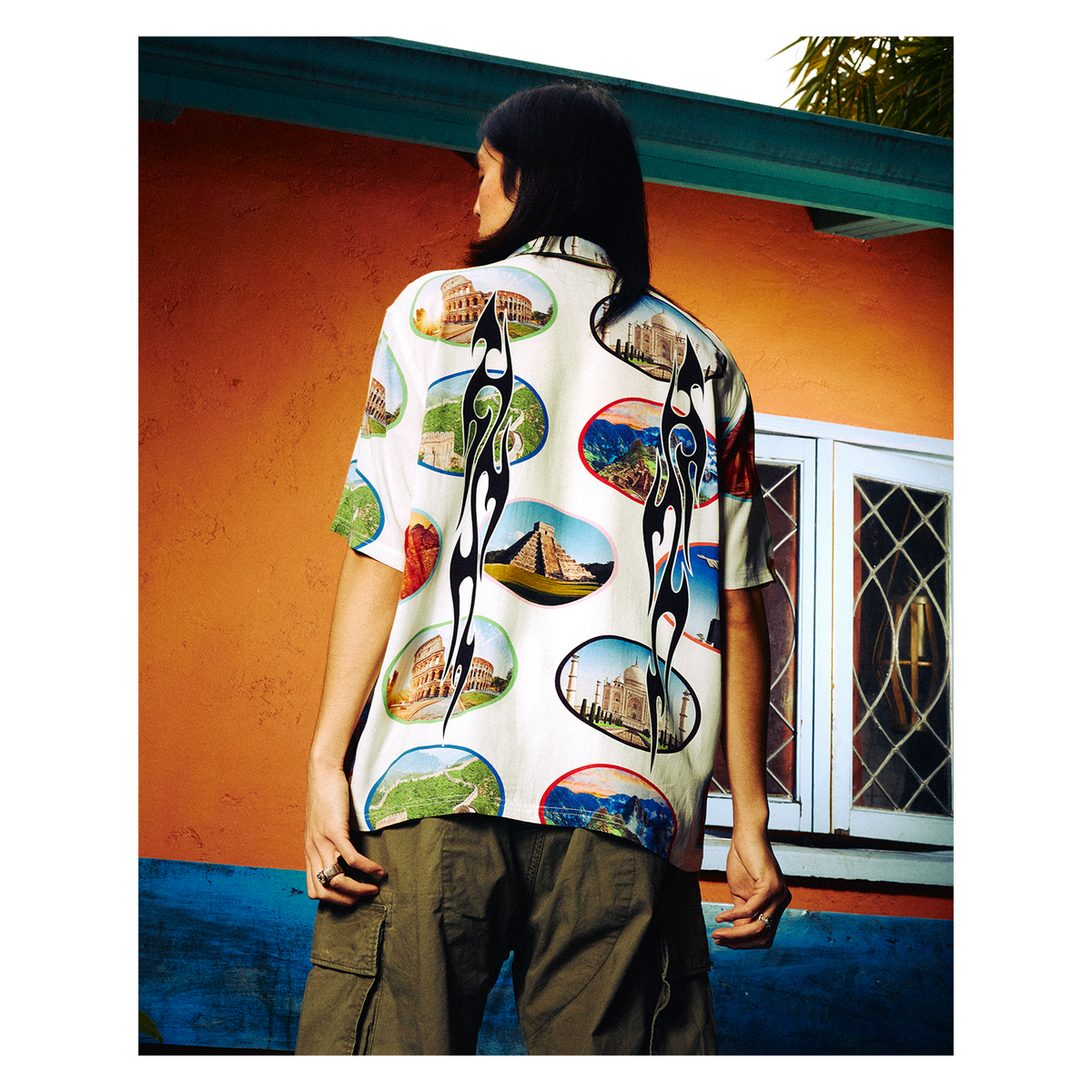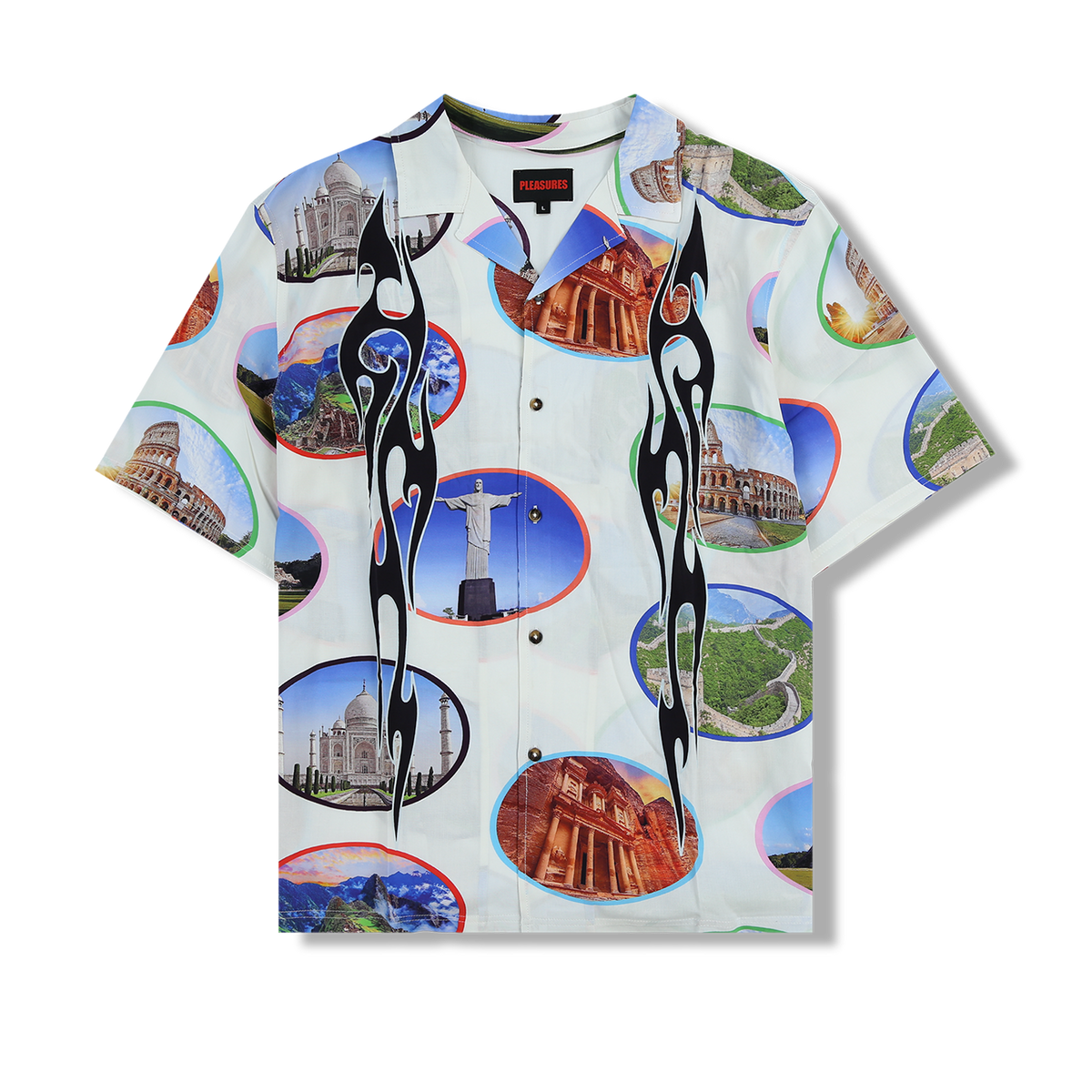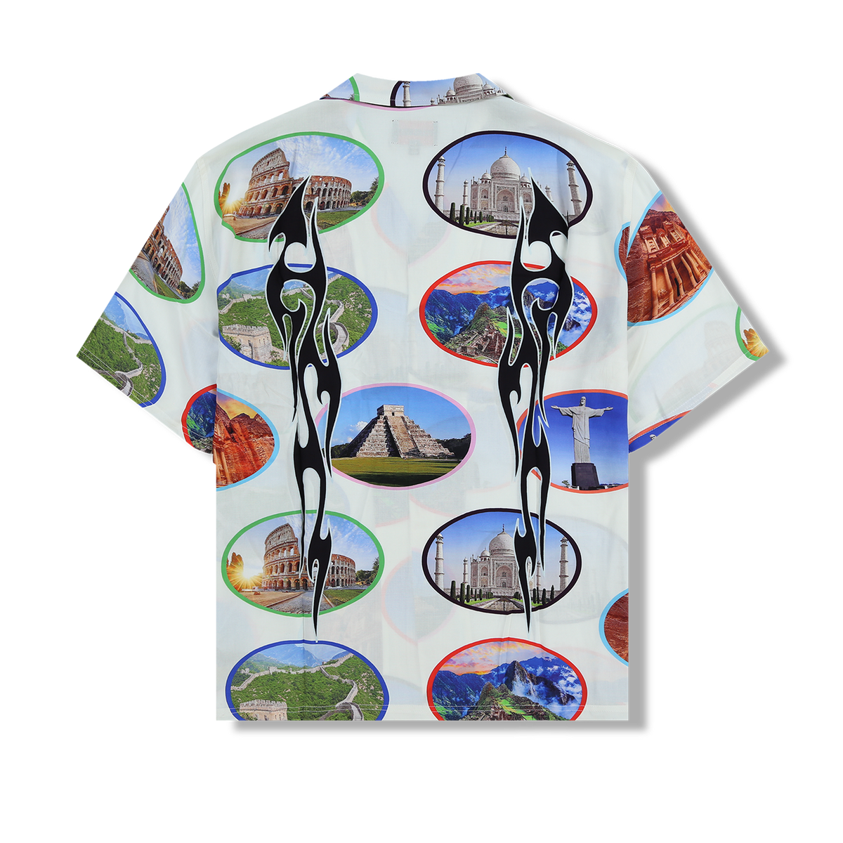 This vibrant camp collar shirt is cut from pure rayon with a bold graphic all-over print featuring the seven wonders of the world, with tribal flame designs laid over the top.