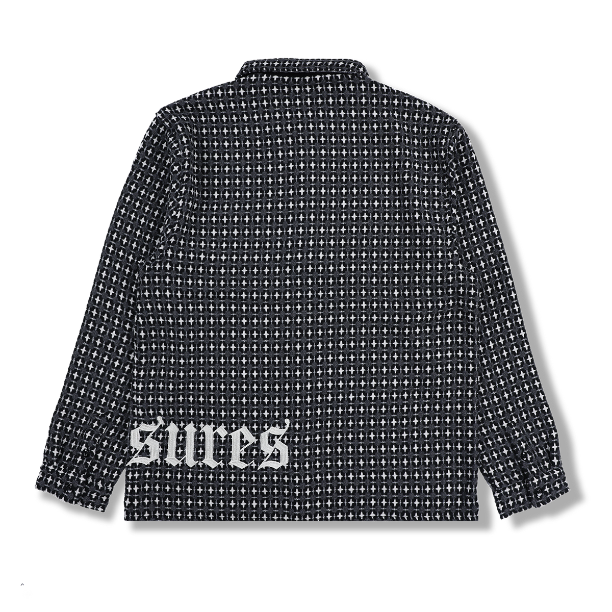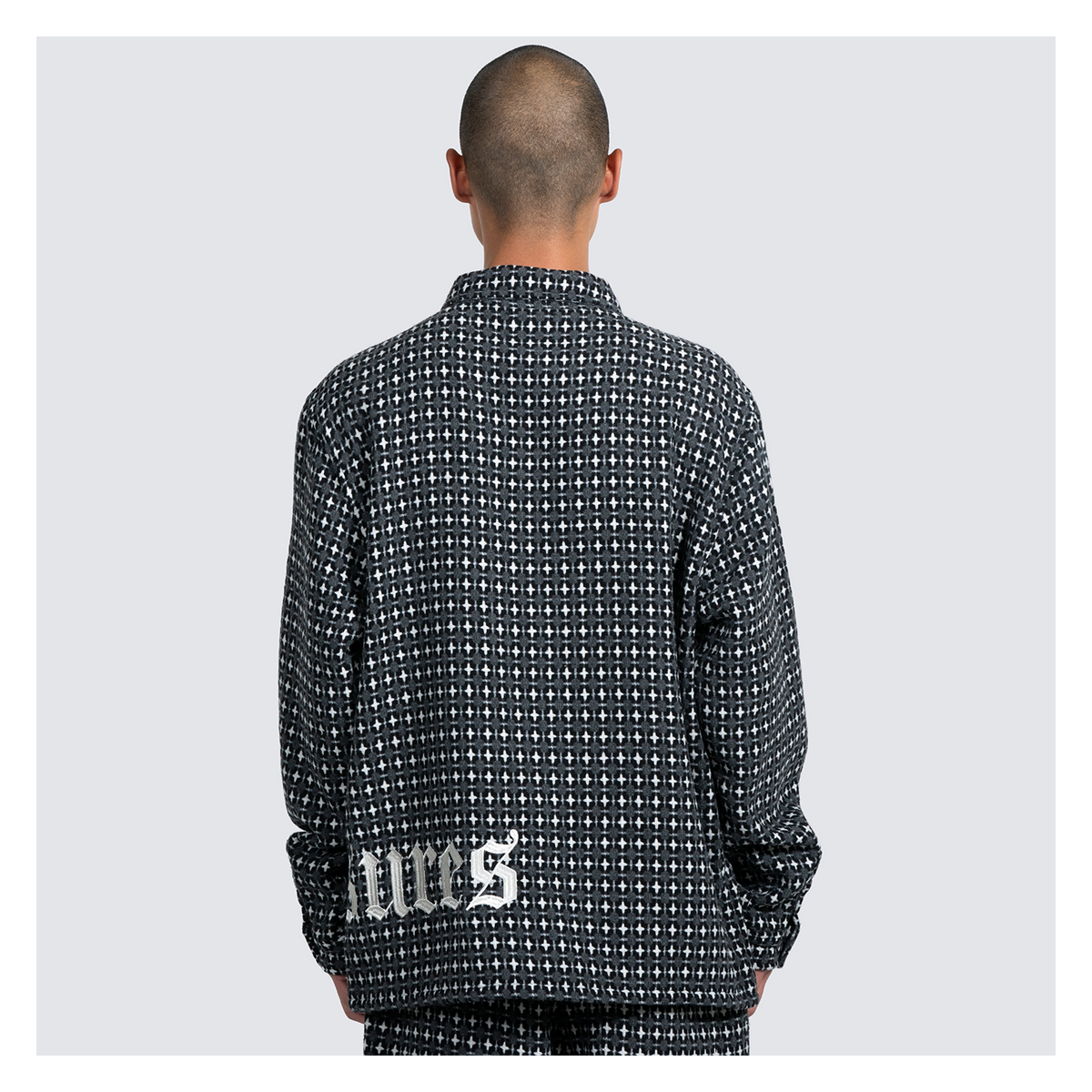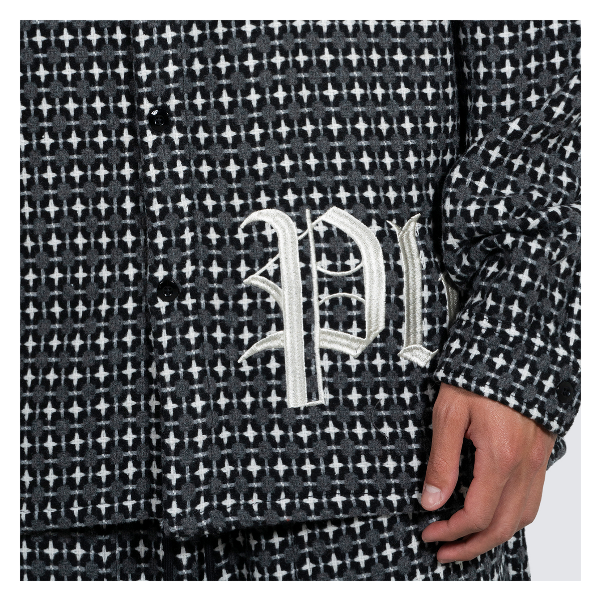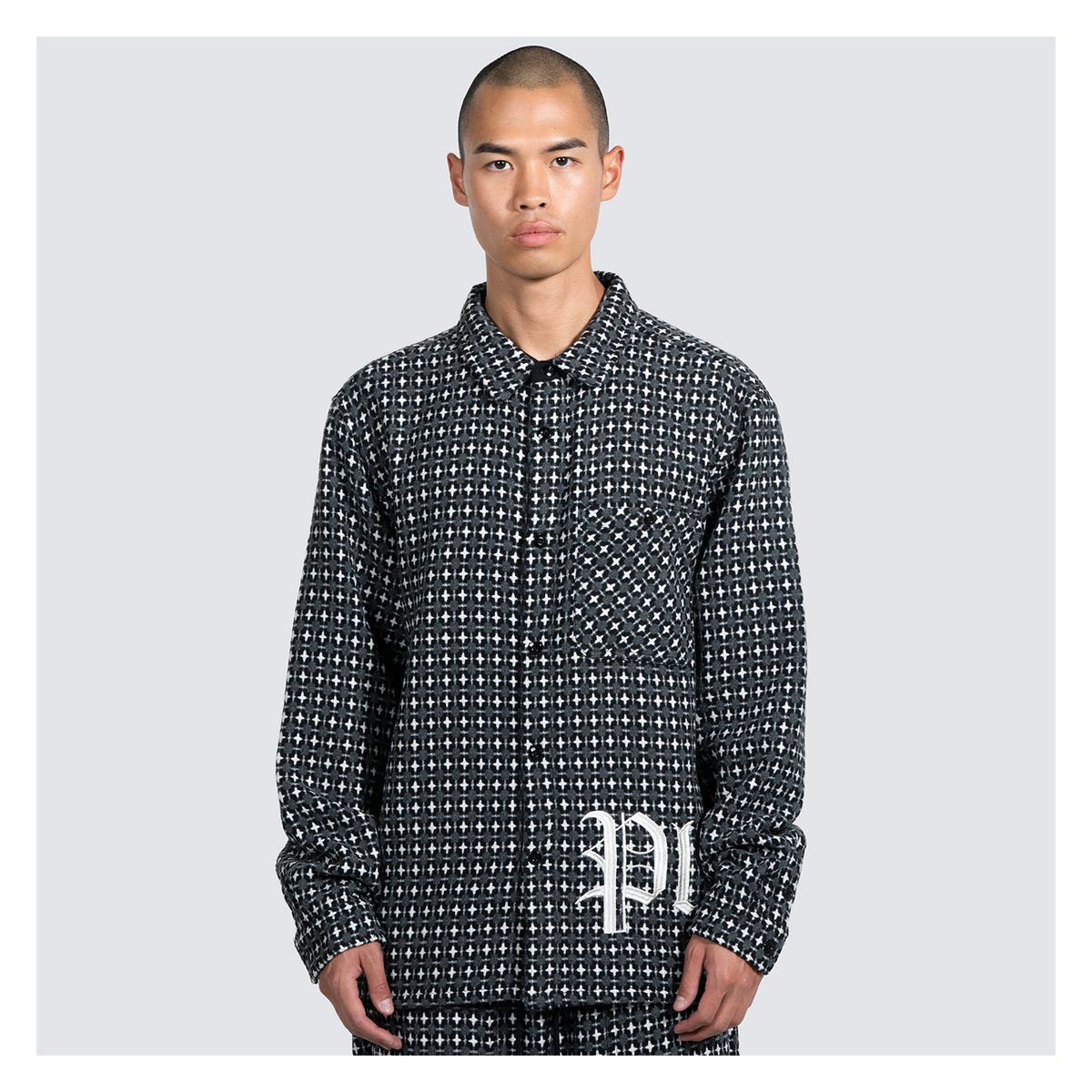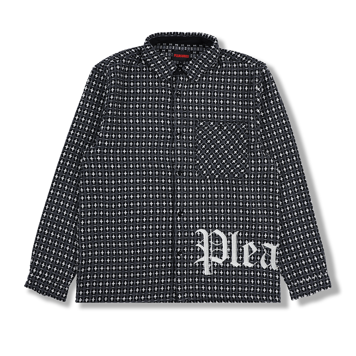 Made from a polyester and wool blend, the Pleasures Cross Work Shirt features a striking all-over cross pattern, complemented by an Old English logo embroidery for a sophisticated touch.