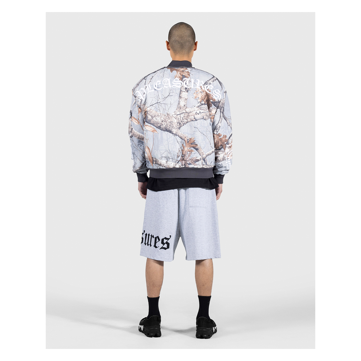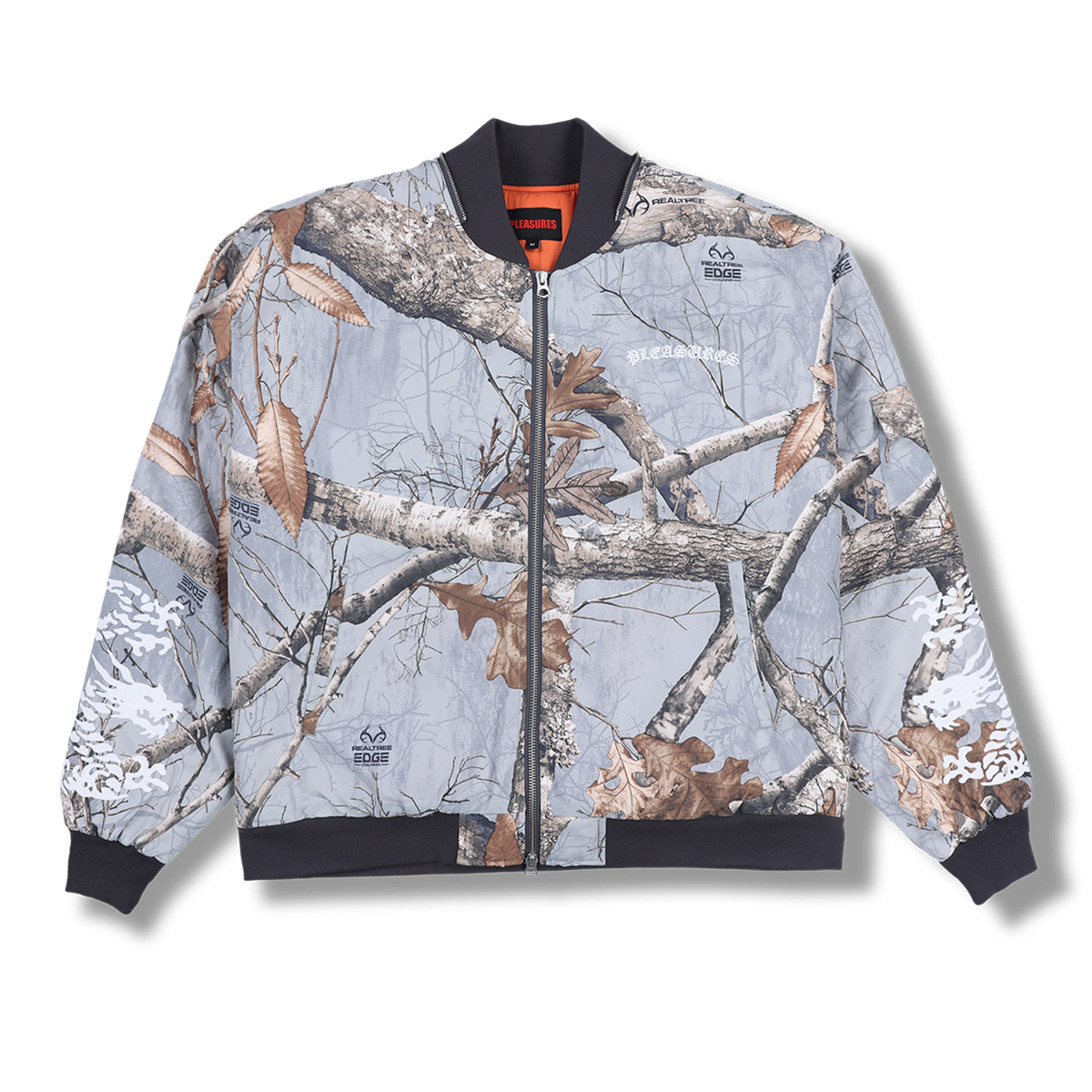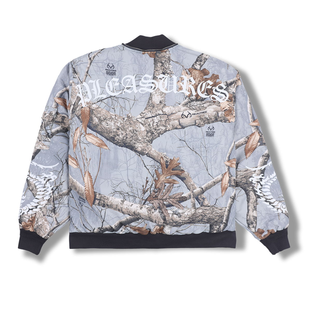 The Dragon Bomber in Grey Edge is an MA-1 style jacket featuring RealTree® Edge grey camo for a tactical, nature-inspired look. It showcases Pleasures’ signature Old English logo embroidered across the shoulder, and dragon artwork embroidered on each sleeve, offering a unique blend of rugged style and intricate design.