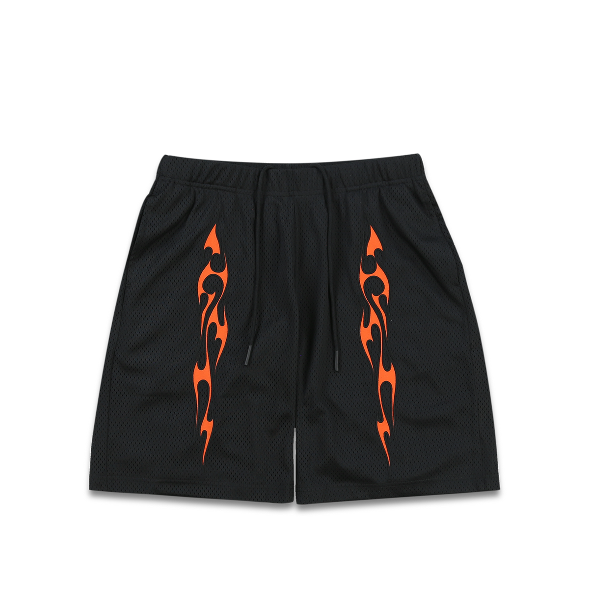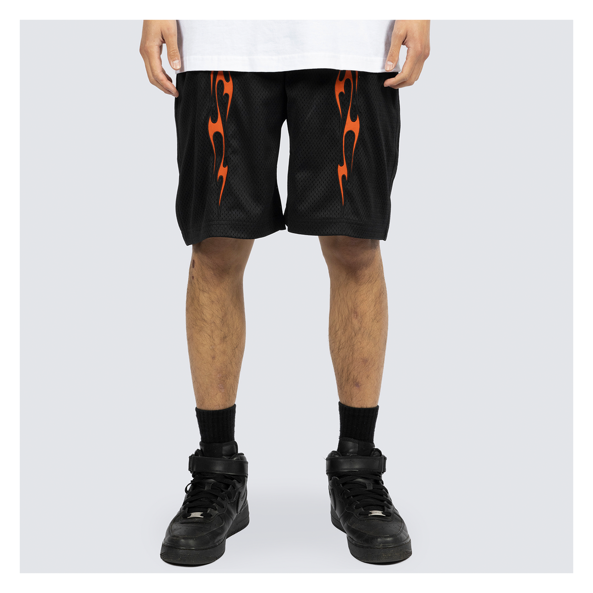 These relaxed fit Pleasures shorts are constructed from a sporty polyester mesh, with an elasticated waist, side and back pockets. Featuring a tribal style flame graphic applique on the front and back of each leg and finished with an embroidered logo above the rear pocket.