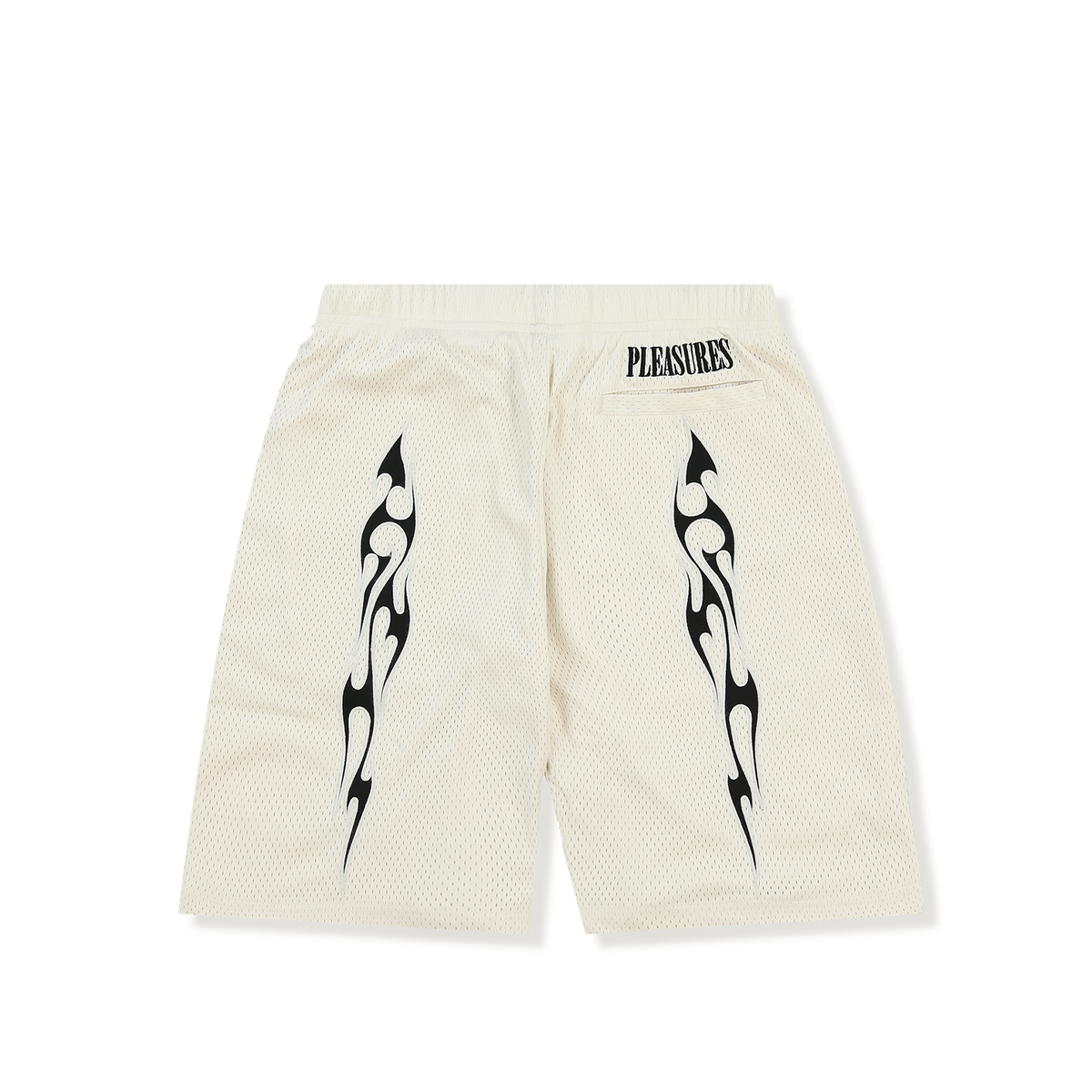 These relaxed fit Pleasures shorts are constructed from a sporty polyester mesh, with an elasticated waist, side and back pockets. Featuring a tribal style flame graphic applique on the front and back of each leg and finished with an embroidered logo above the rear pocket.