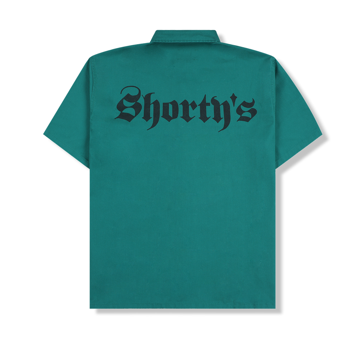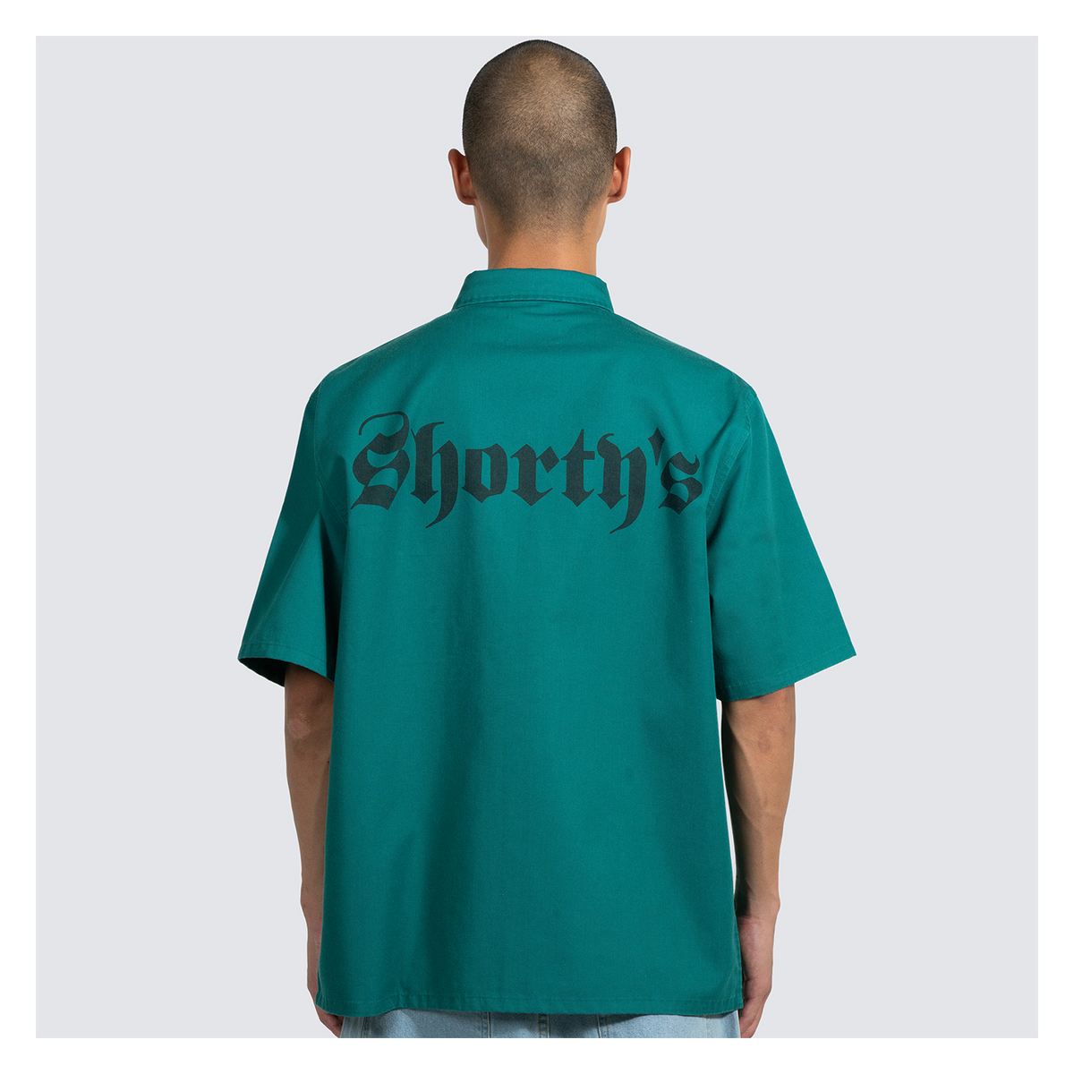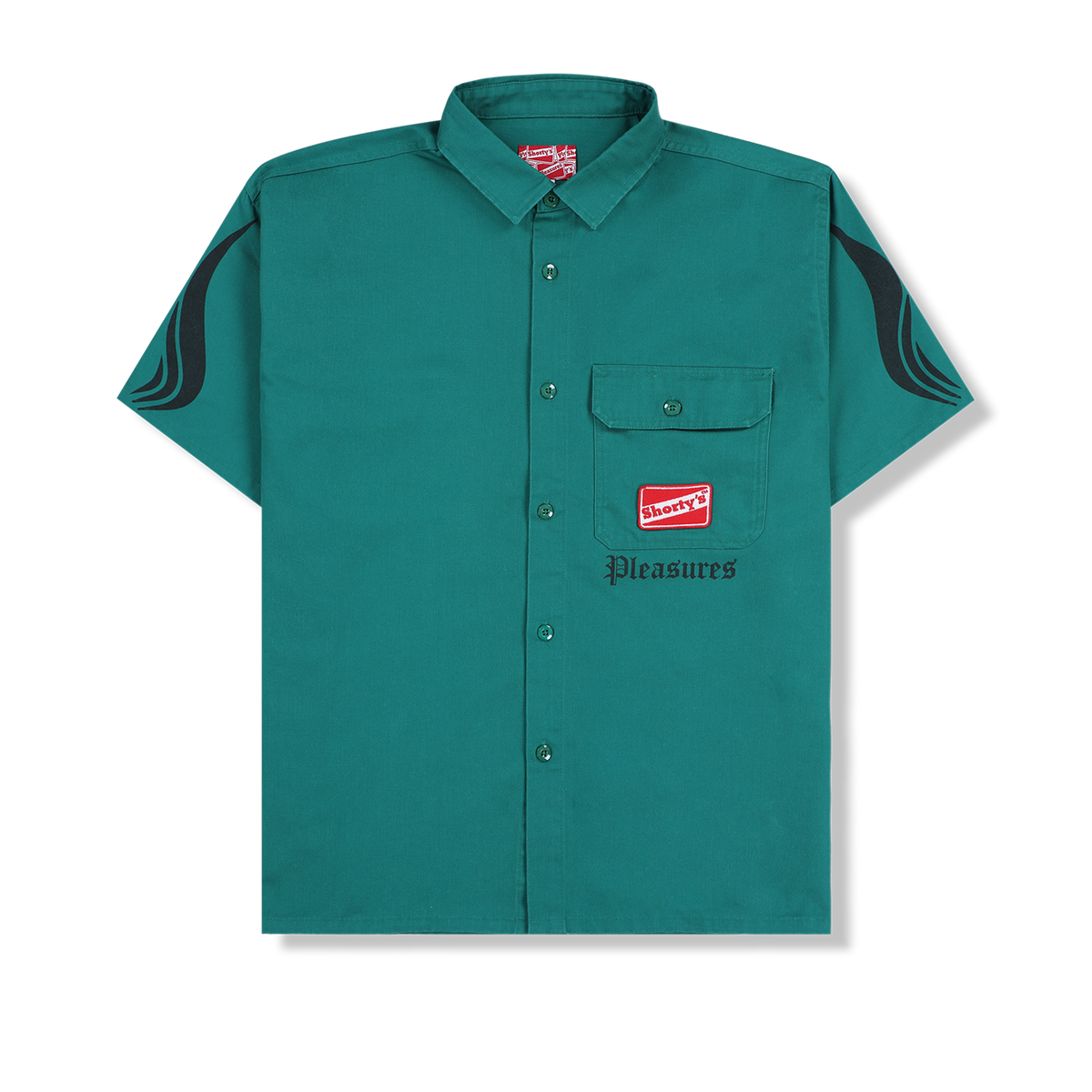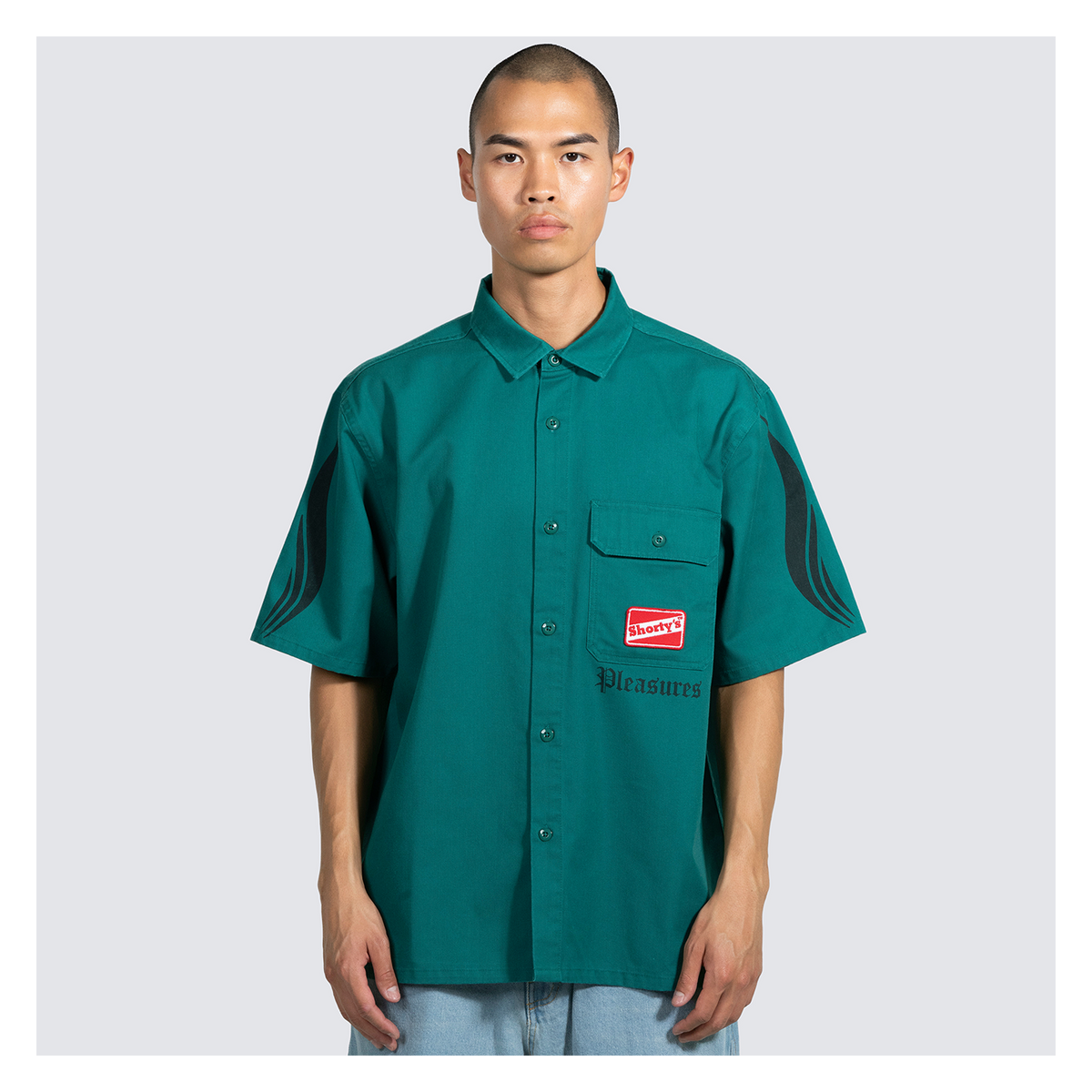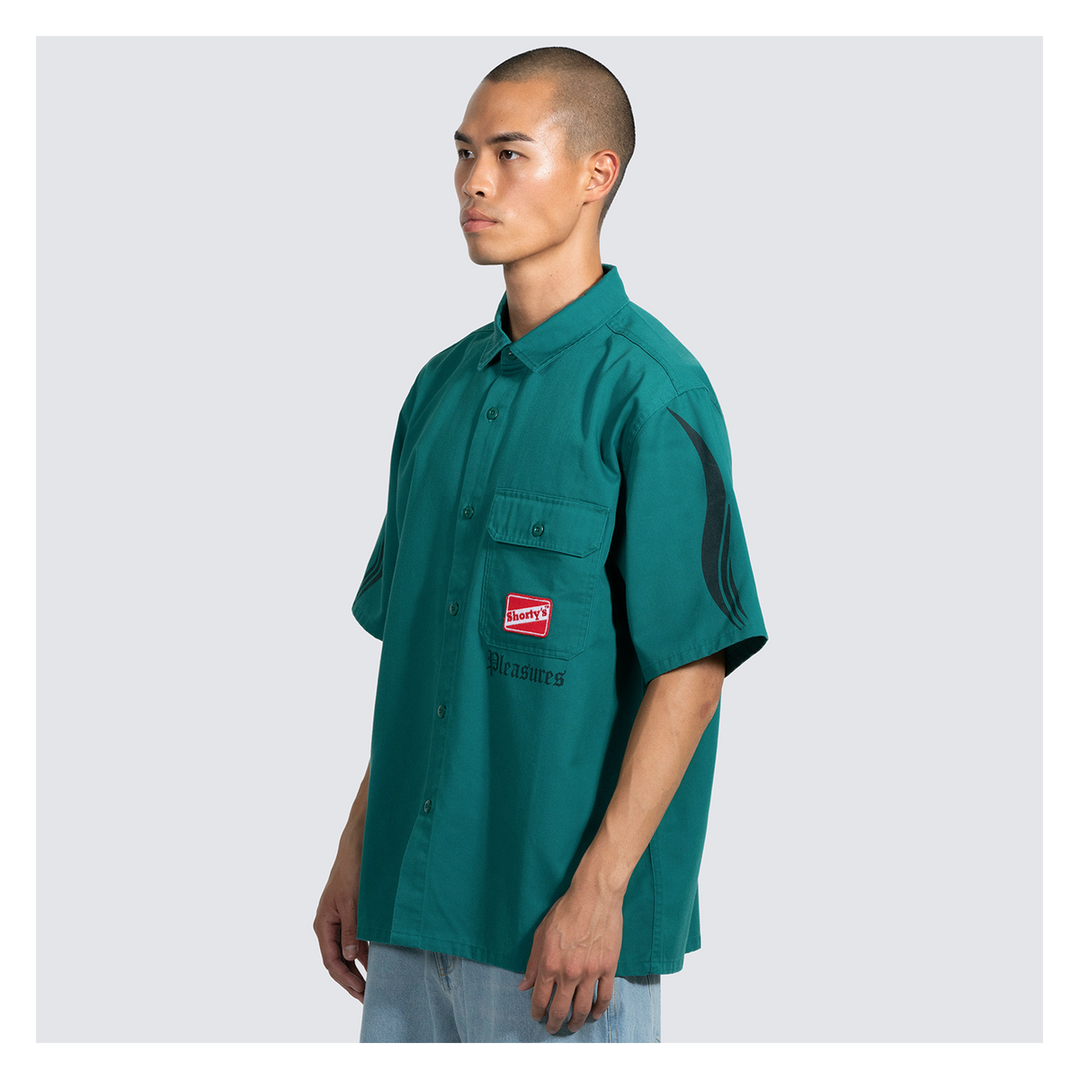 This relaxed fit work shirt from Pleasures is cut from breathable cotton blend twill and features a combination of Shorty's archive graphics and applique logo patch.