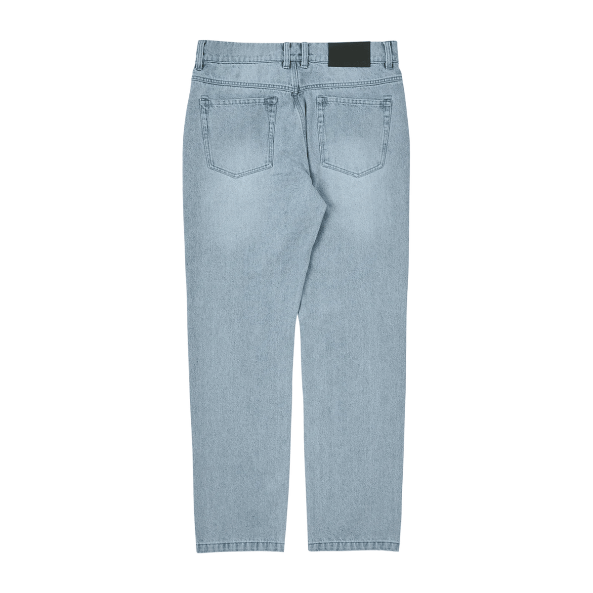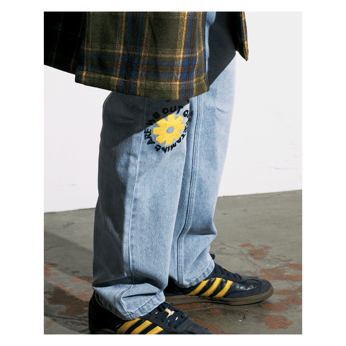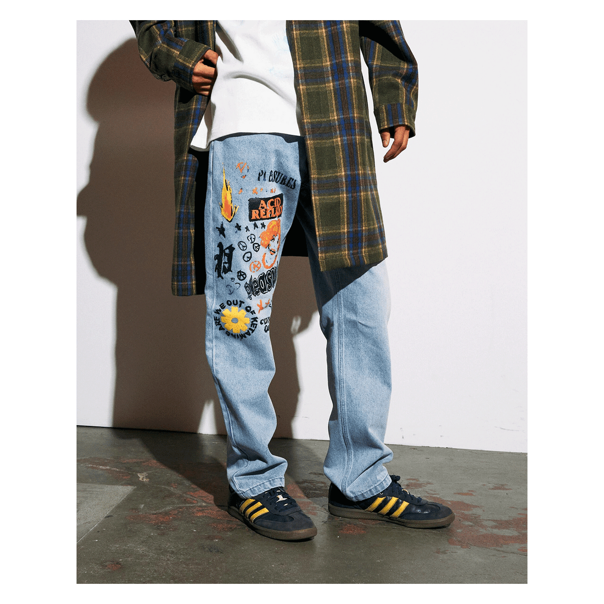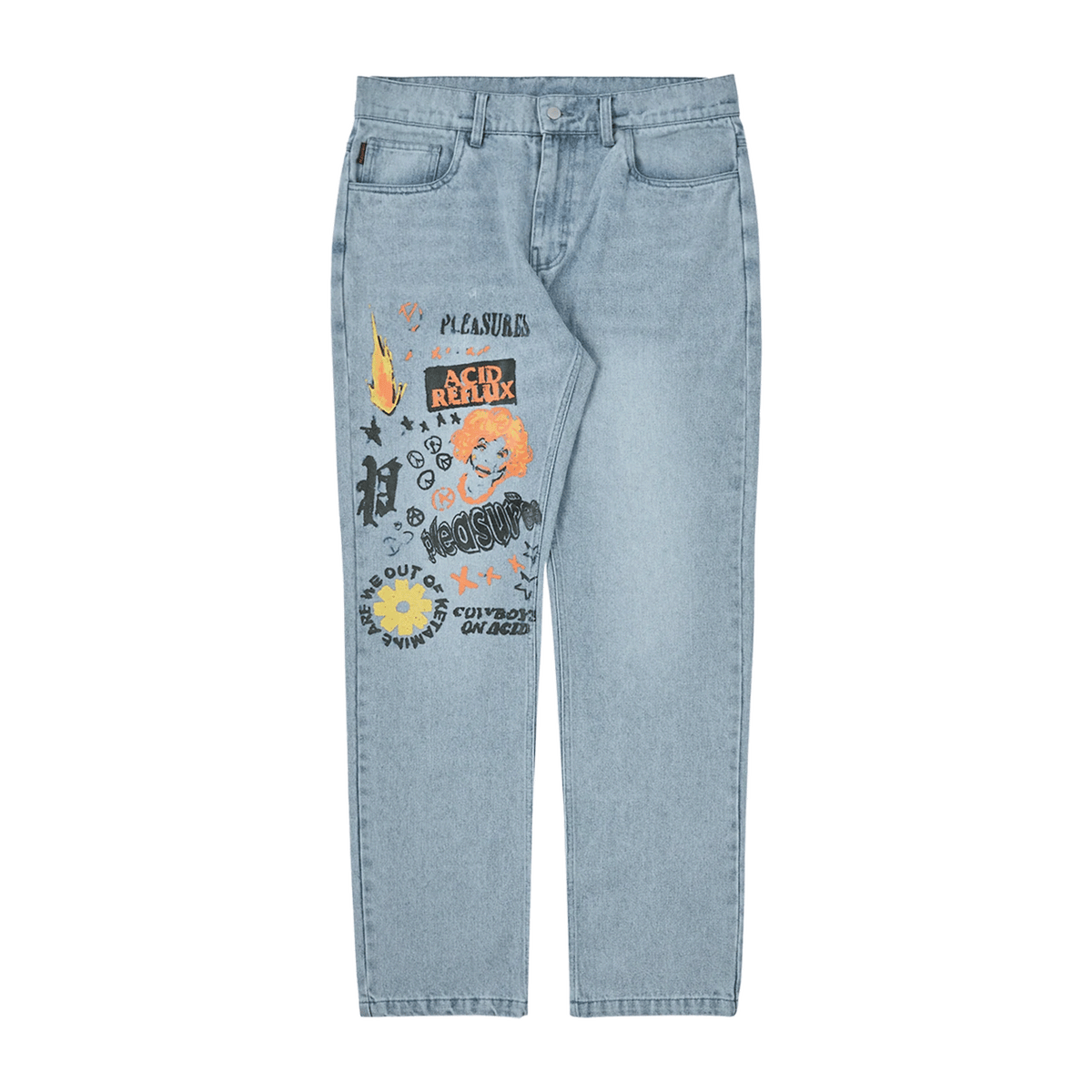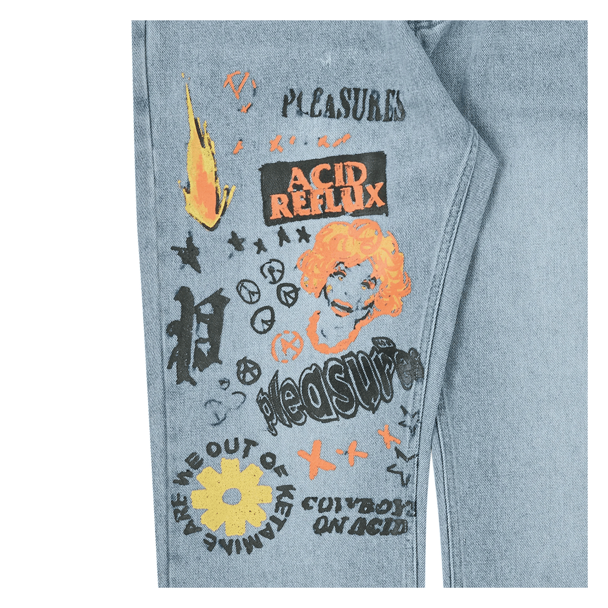 These light blue jeans are cut in a straight fit from cotton blend denim, and finished with a premium Pleasures leather brand patch at the back. They feature printed hand style art on the left leg.