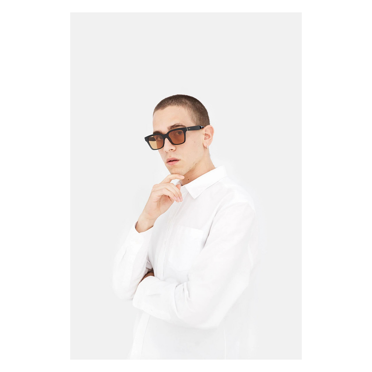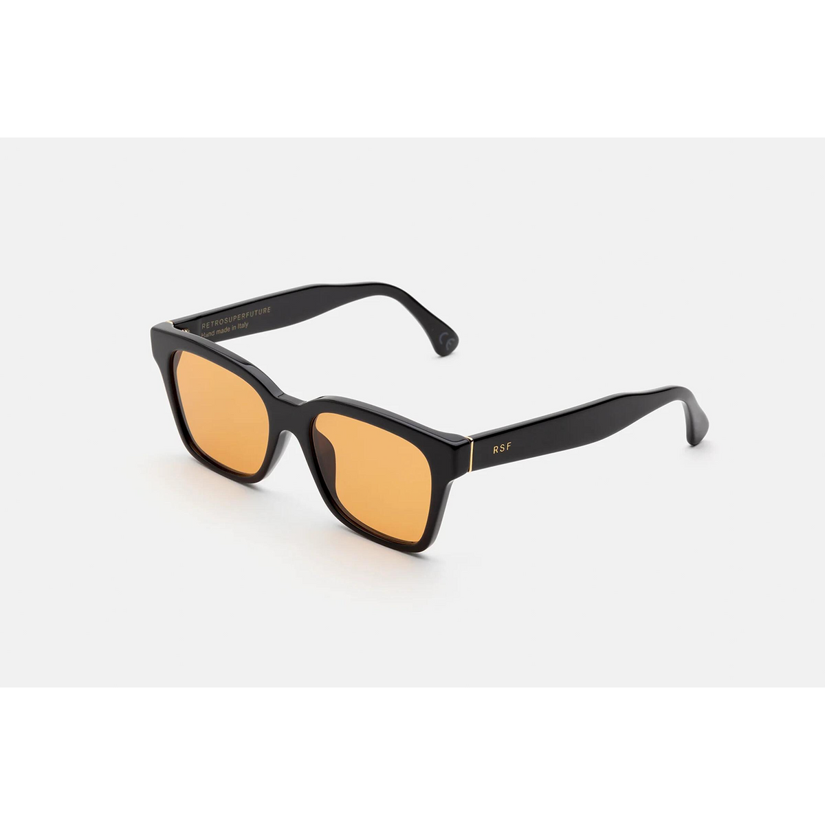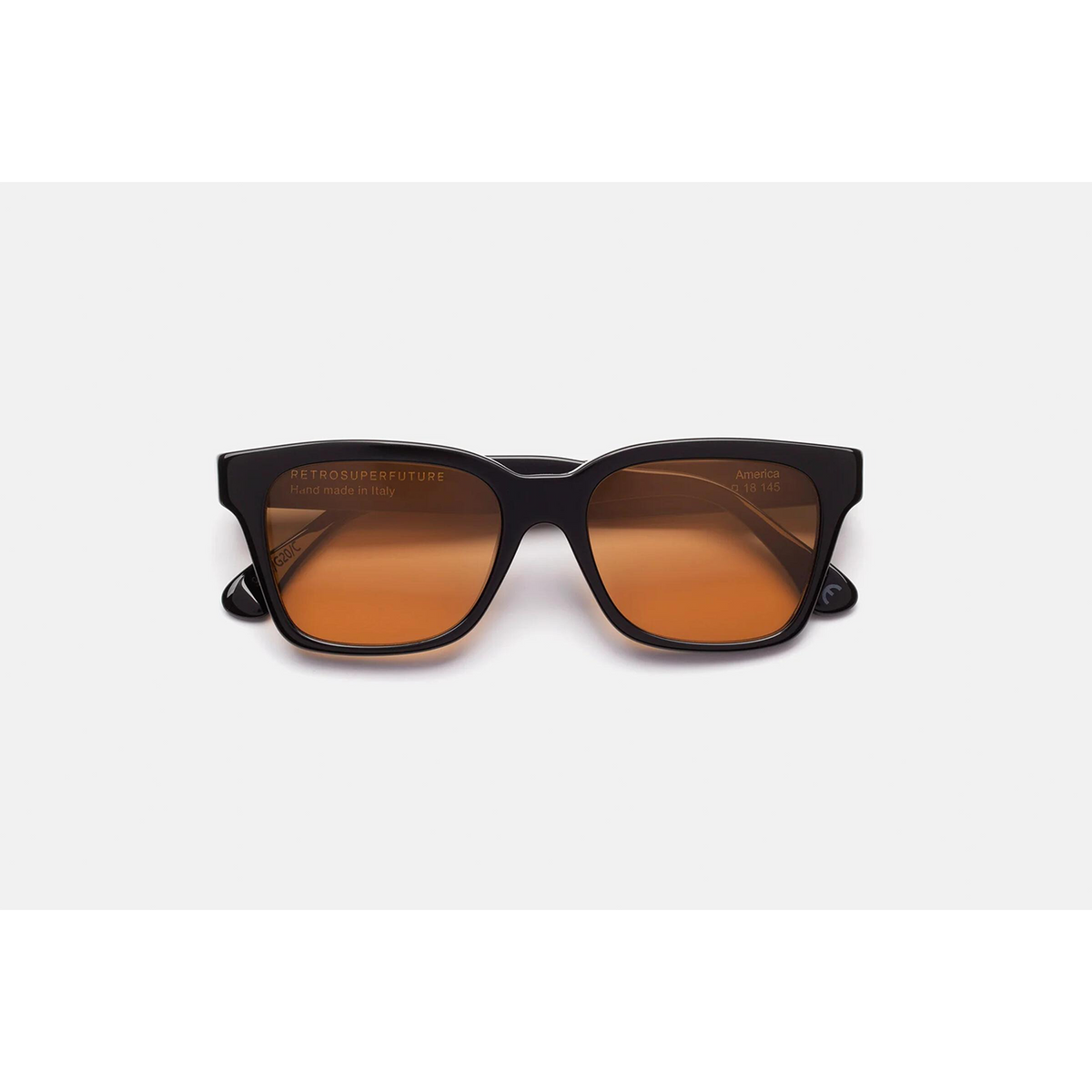 A classic angular design, America features sturdy rims, essential profile and wide lenses. This version of the silhouette was matched with warm brown tinted lenses, and a gloss black acetate. The box contains a semi-hard case and a cleaning cloth.