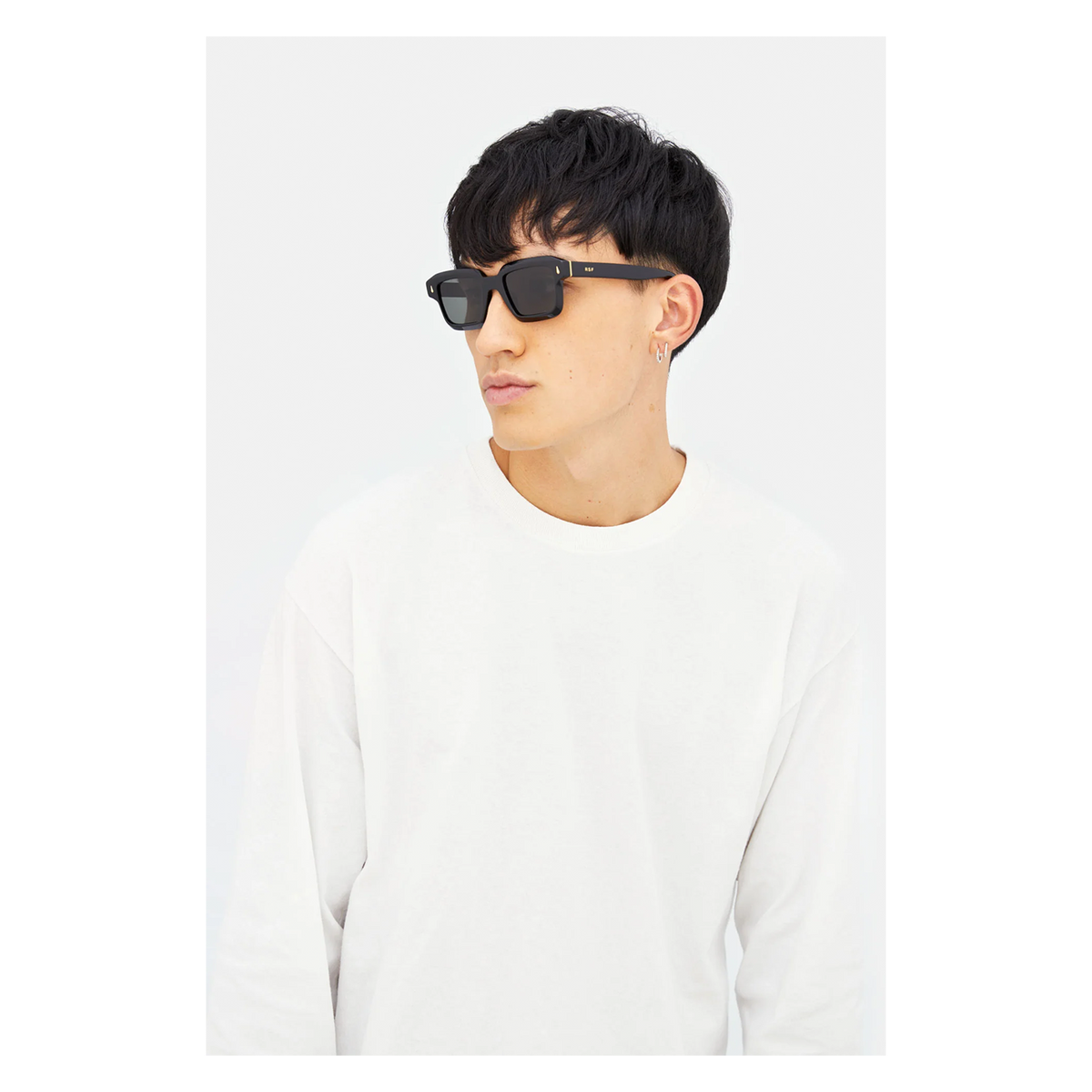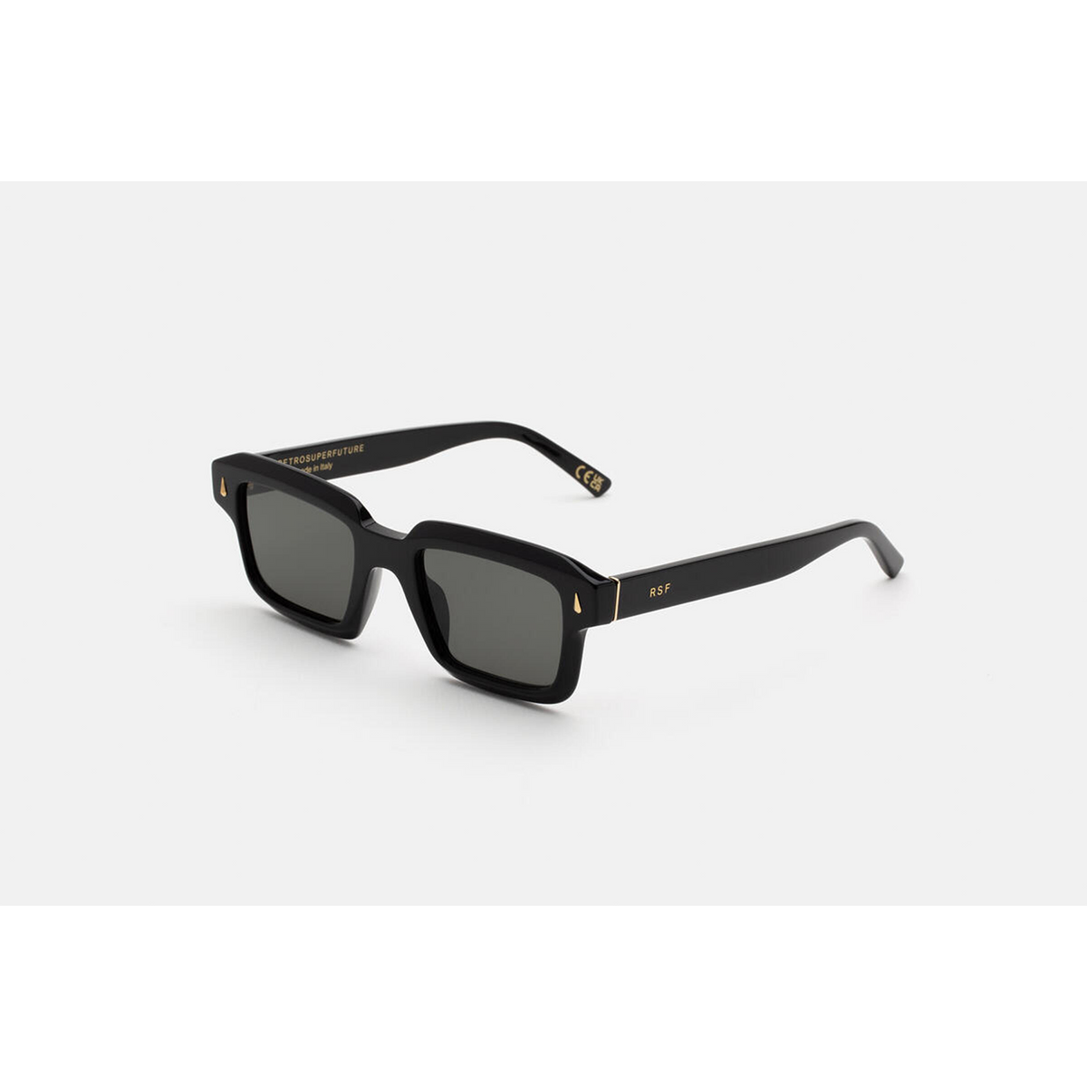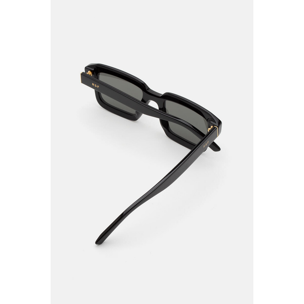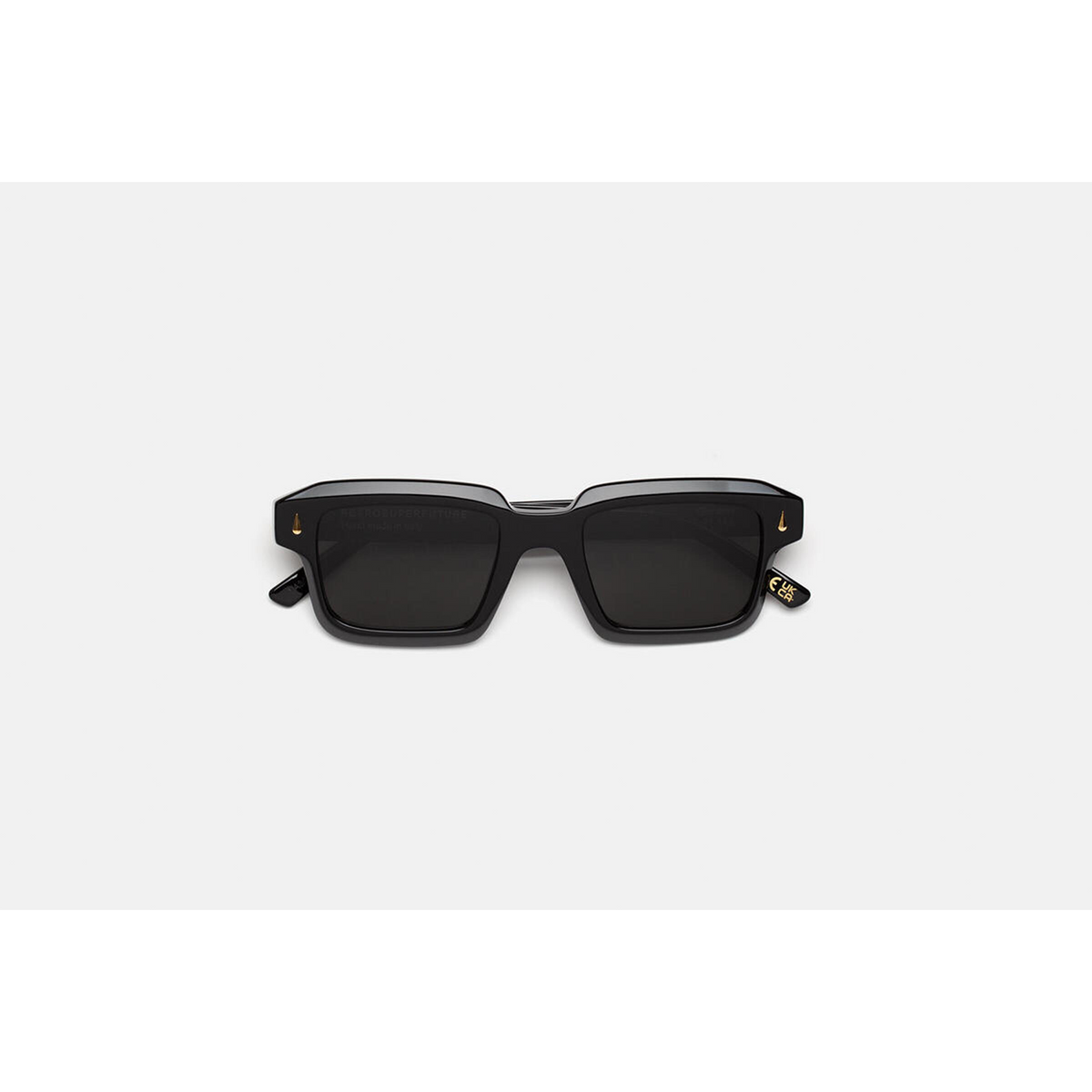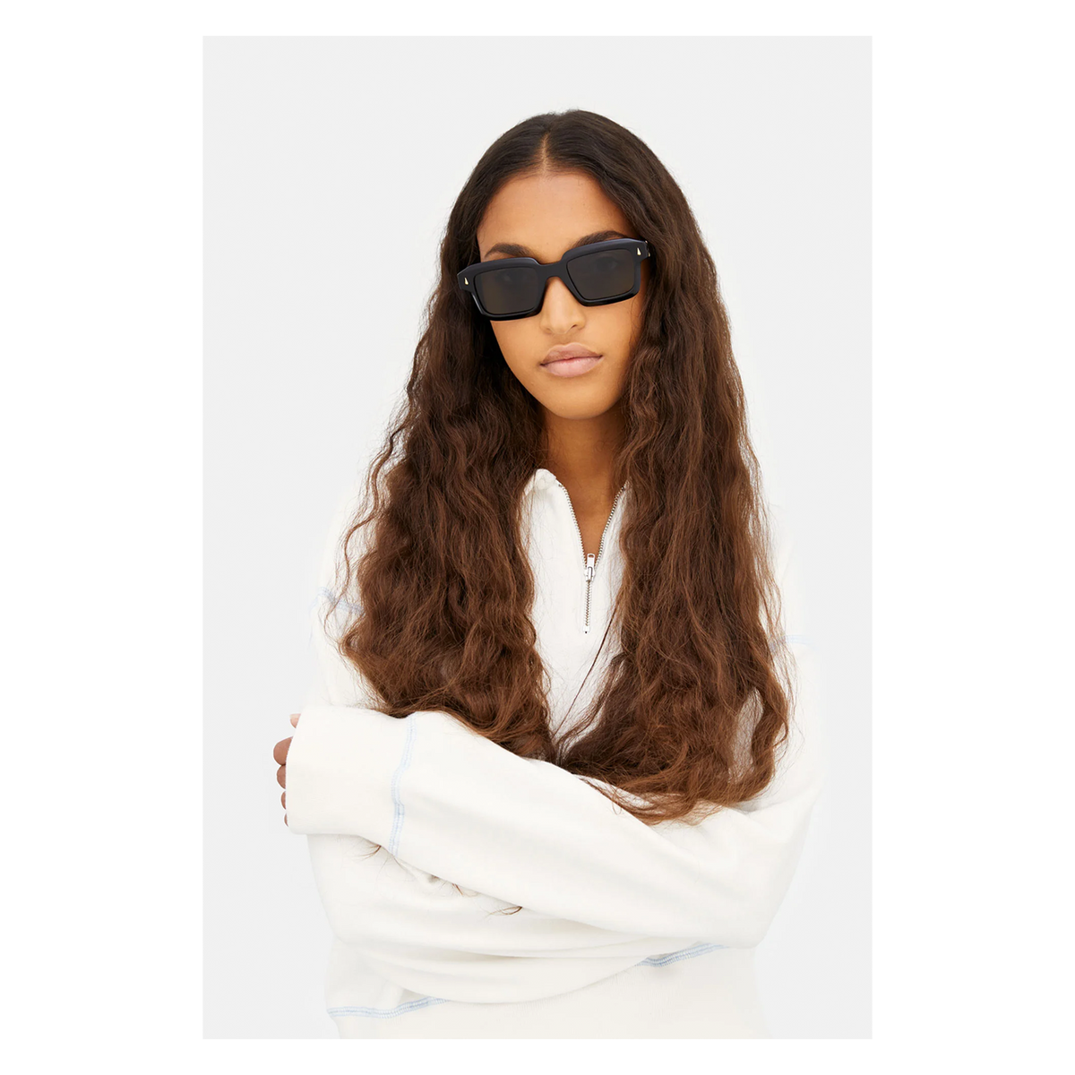 Characterised by wide rectangular lenses, the model is a reinterpretation of 1950s silhouettes, updated with an emphasis on sculpted acetate rims and essential geometries. Crafted from shiny black acetate, this is an elevated piece of eyewear to be worn day after day. This model comes with black lenses and gold decors. The box contains a semi-hard case and a cleaning cloth.