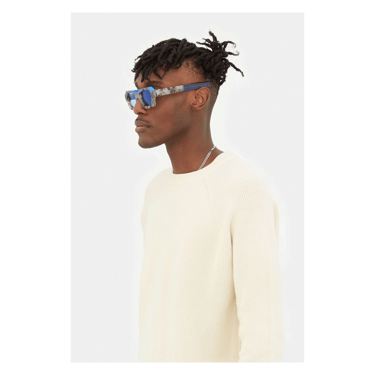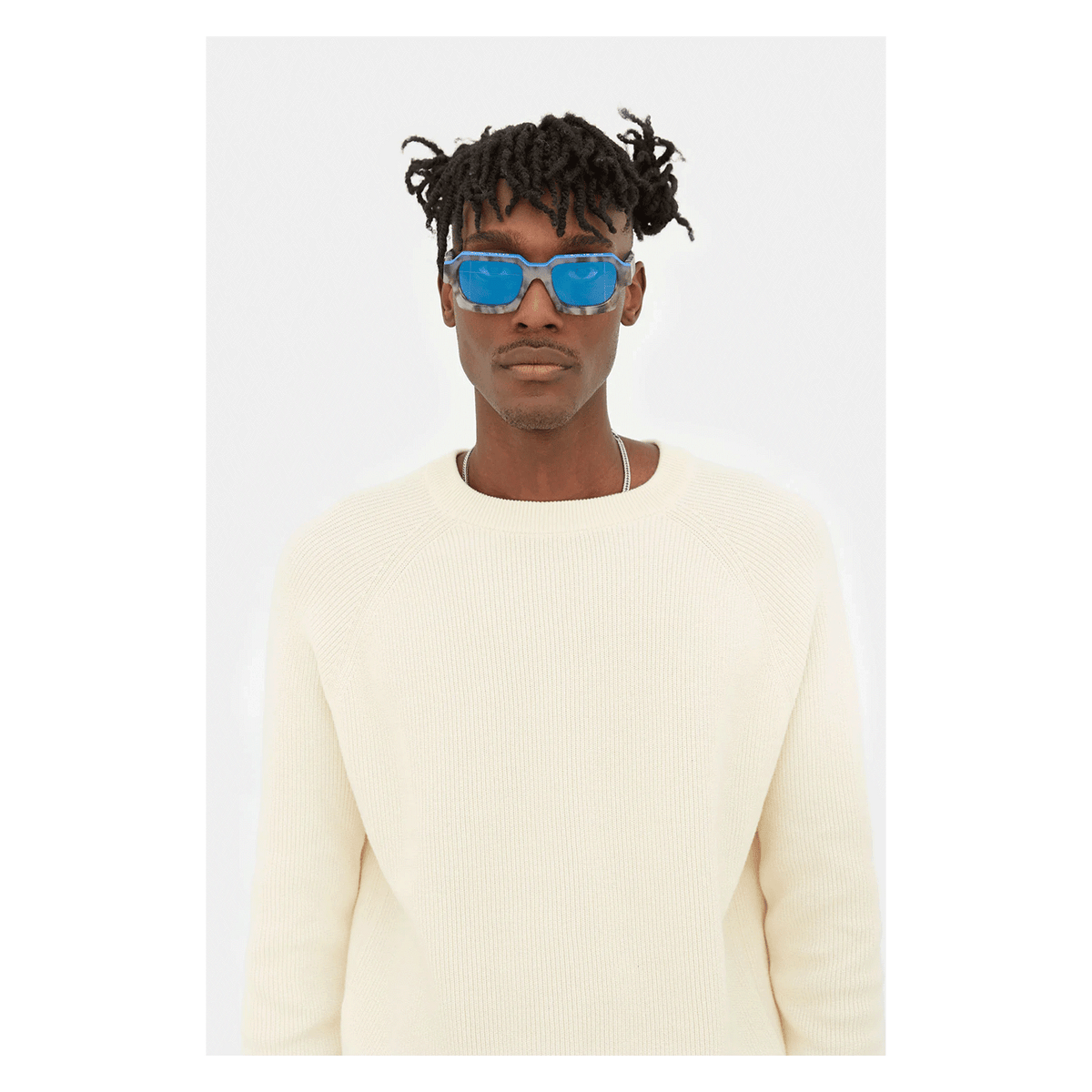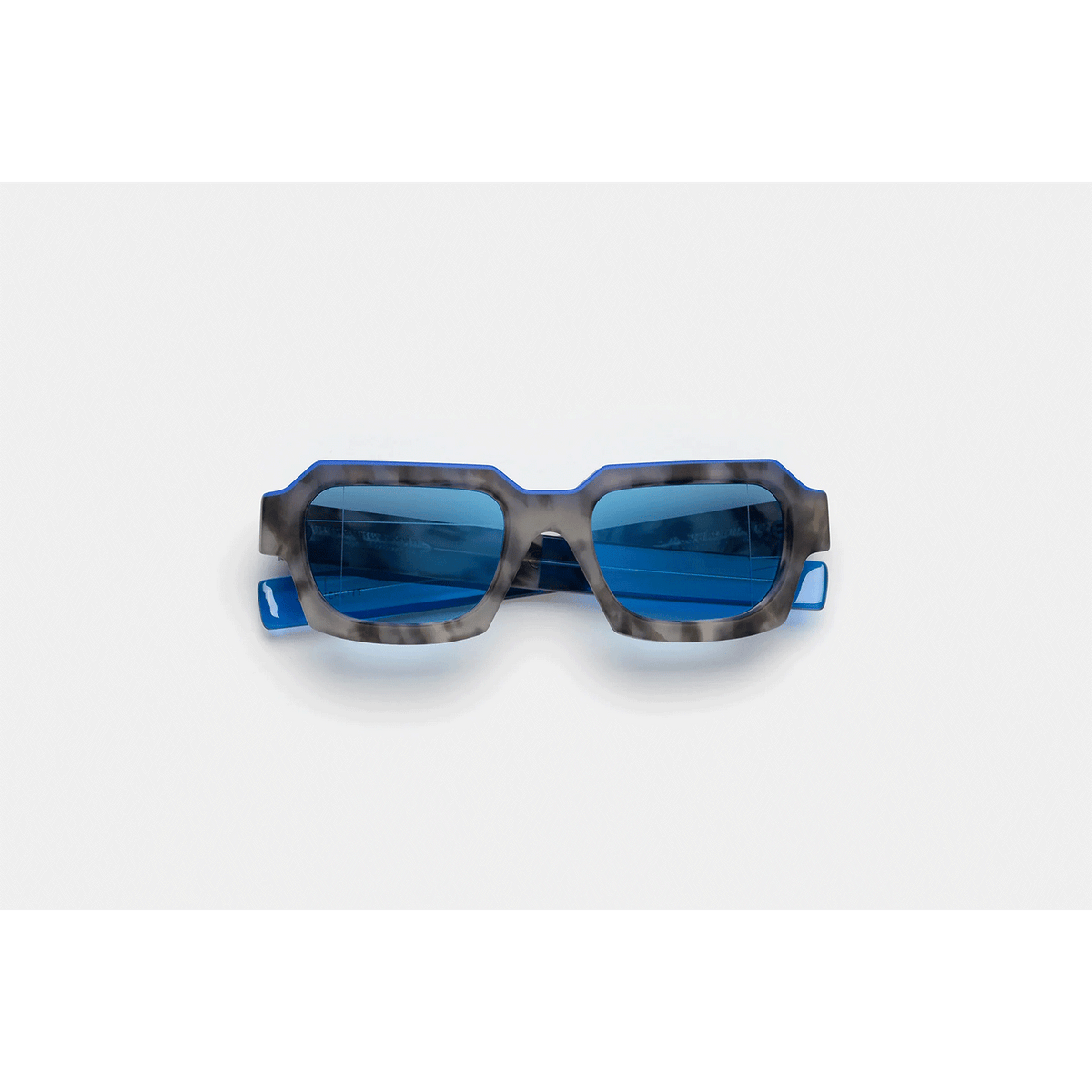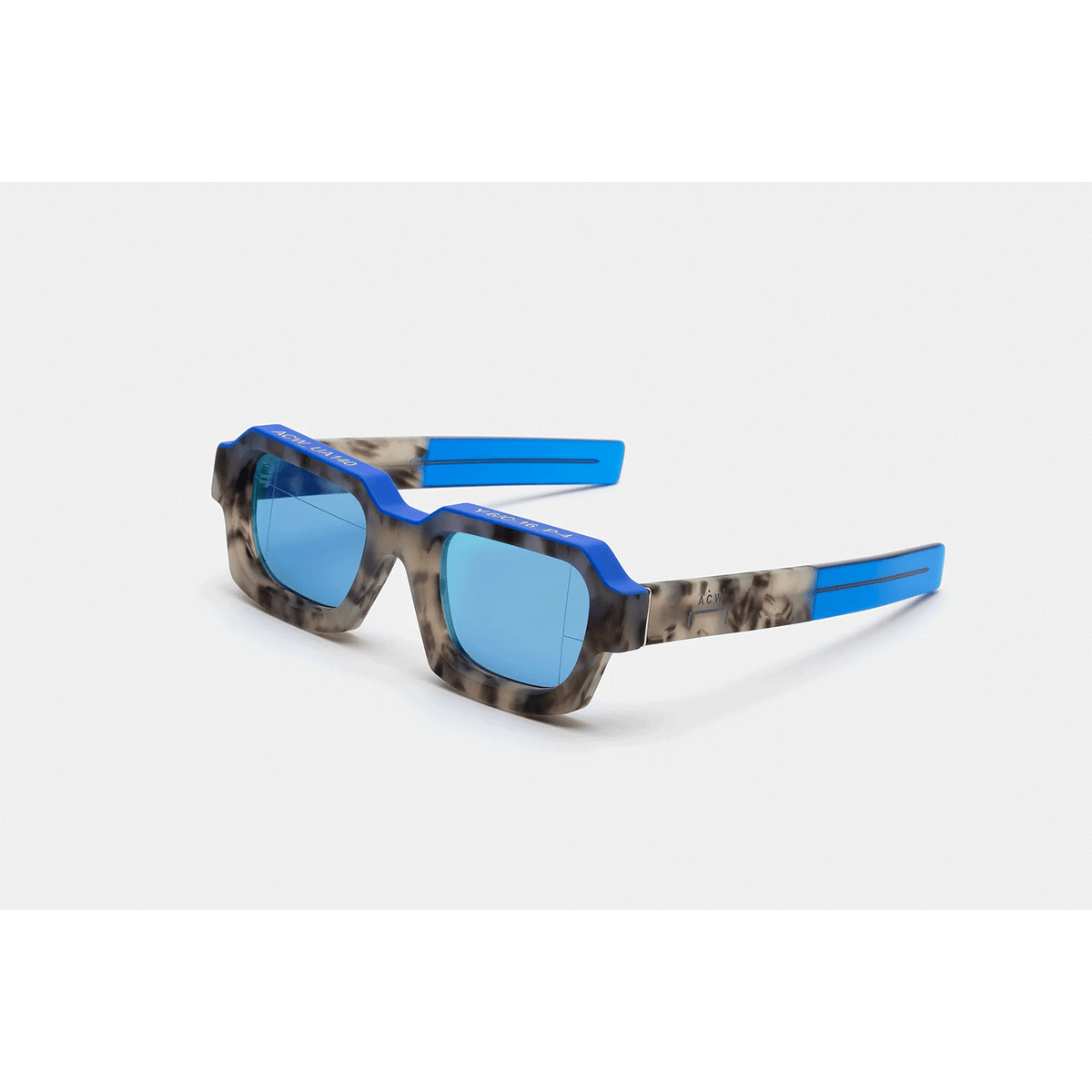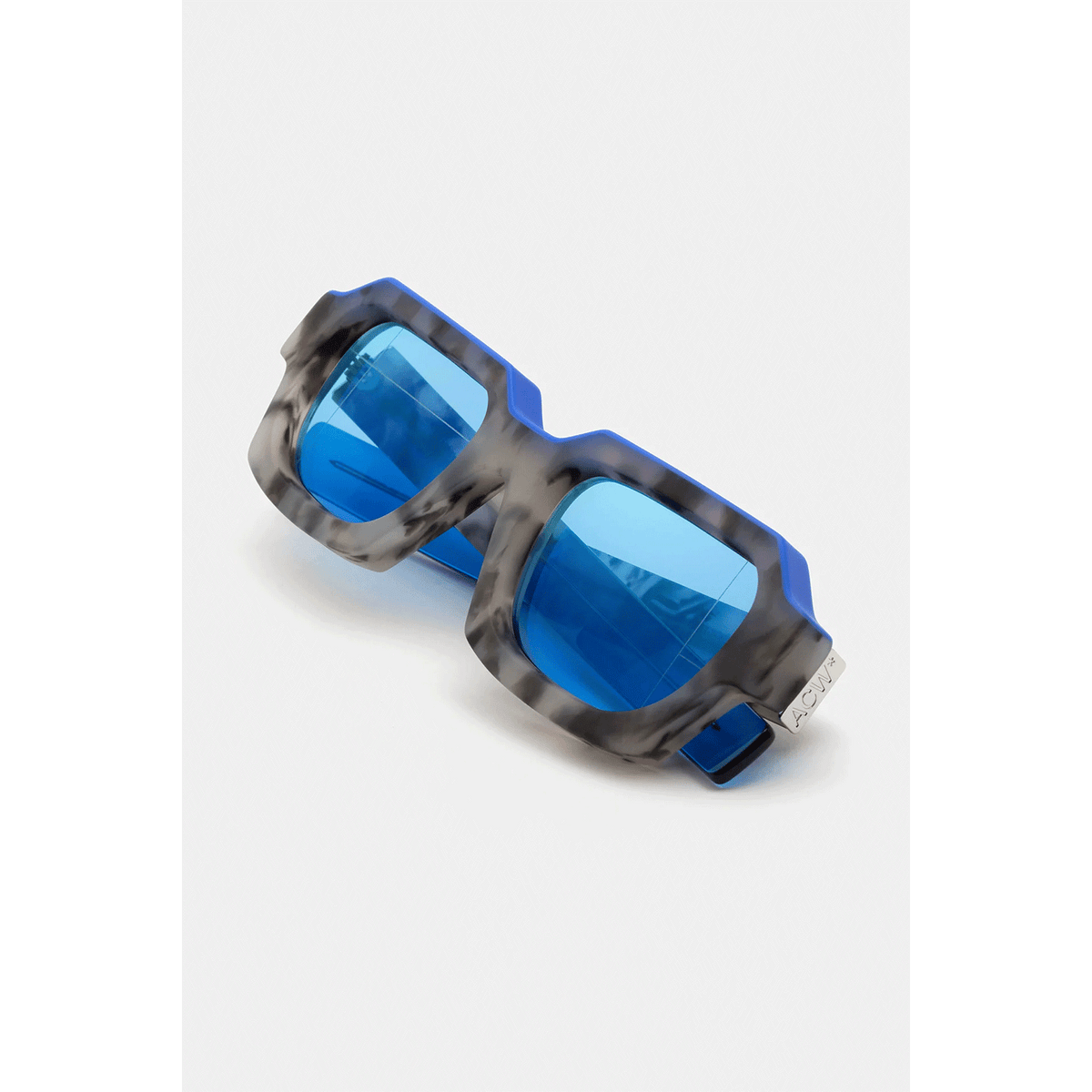 Designed for the cult British menswear brand A Cold Wall, this version of Caro is a statement piece of eyewear characterised by its ultra-thick profile and squared lenses. The model’s geometric design has been crafted from solid acetate to emphasise the materiality of the shape. This aesthetic language draws from ACW’s exploration of architectural design qualities, applying it to high-end fashion. This version features a matte grey marble finish on the frontal frame and temples, with bold electric blue detailing on the top. Matching tinted lenses and crystal temple tips complete the piece.