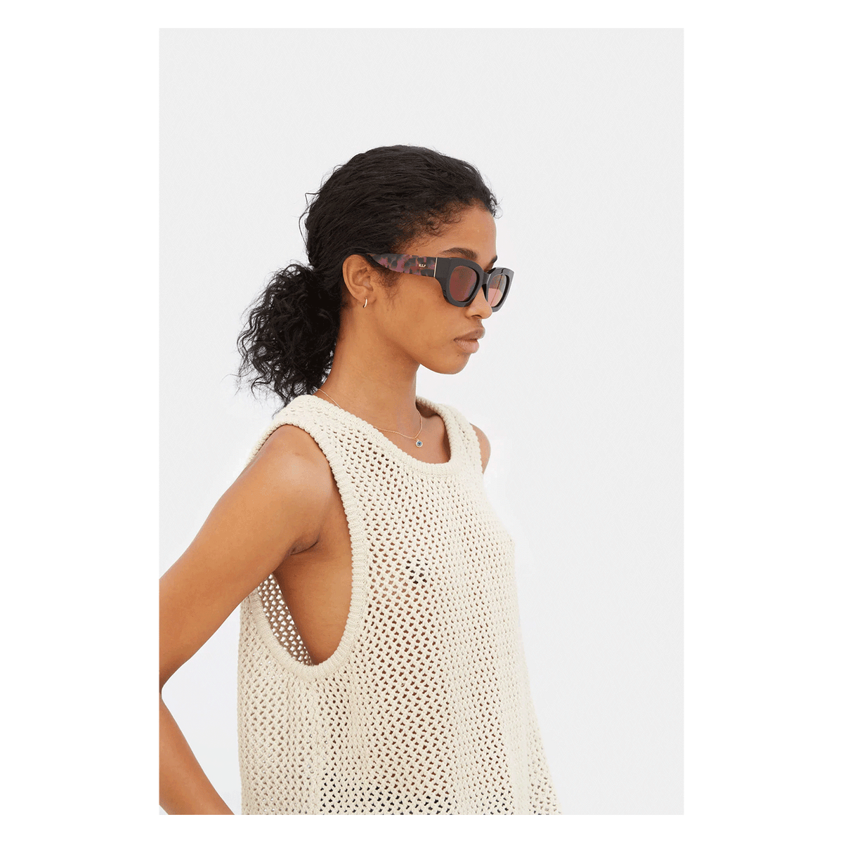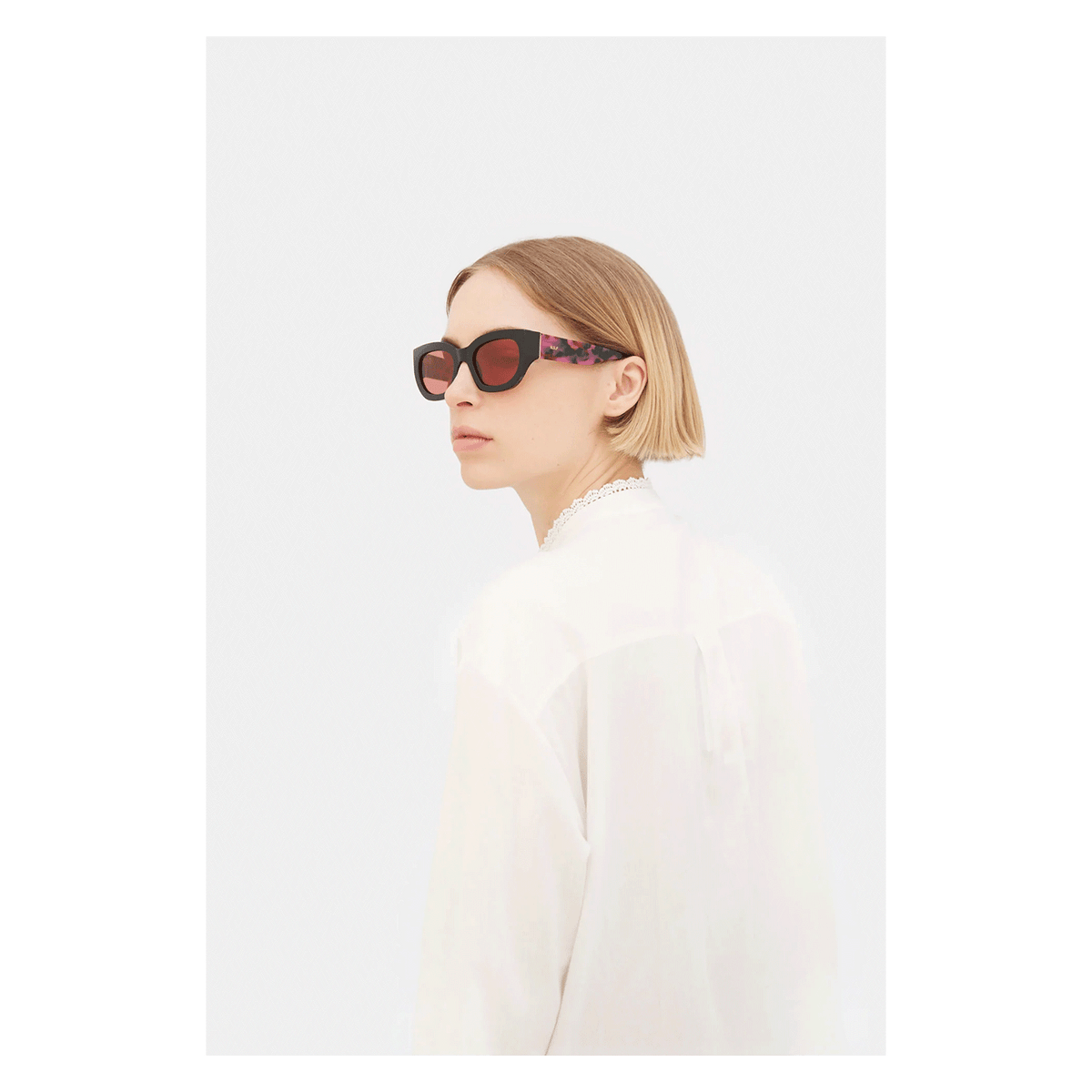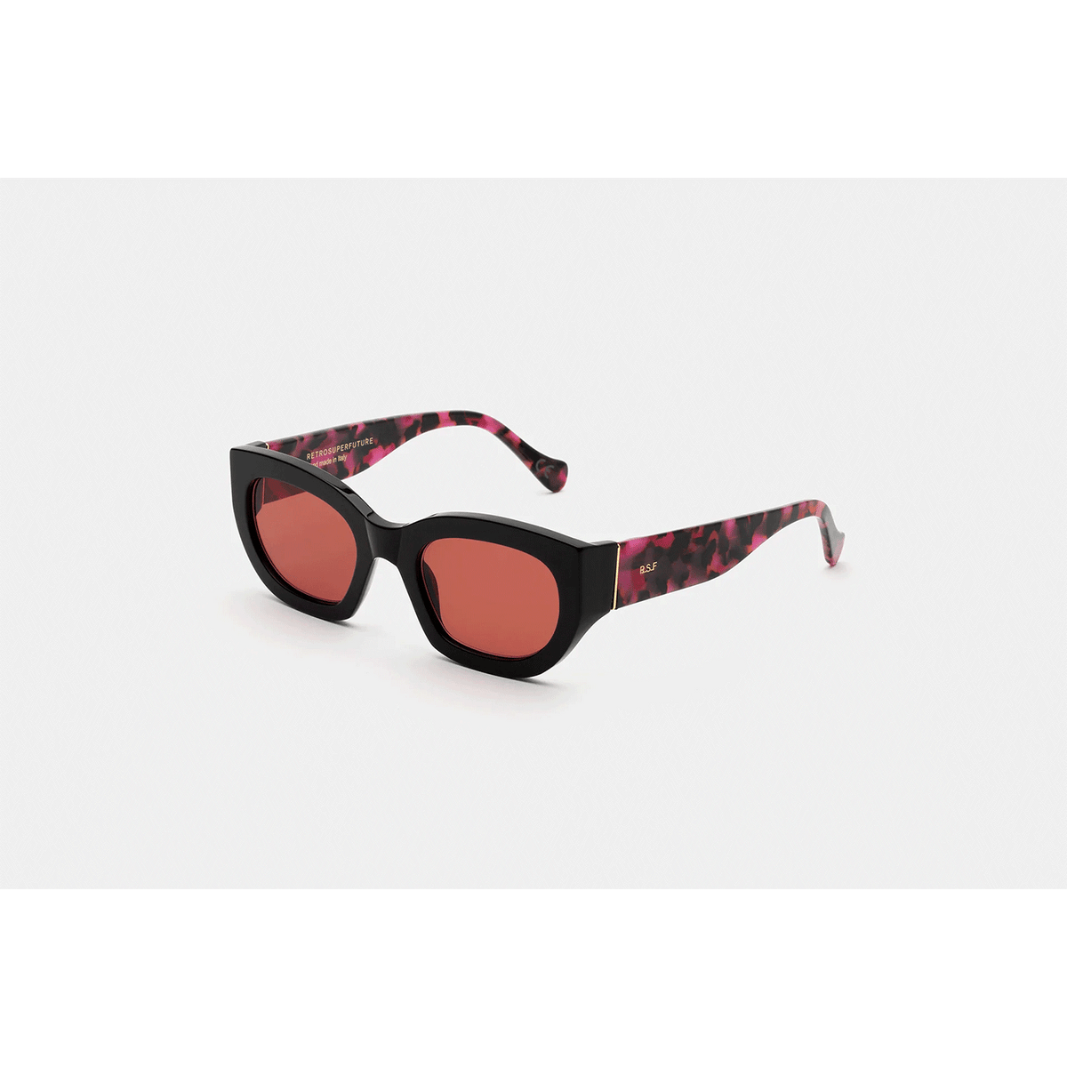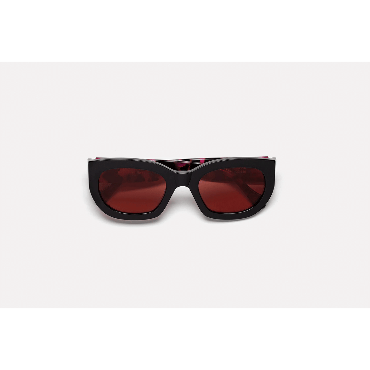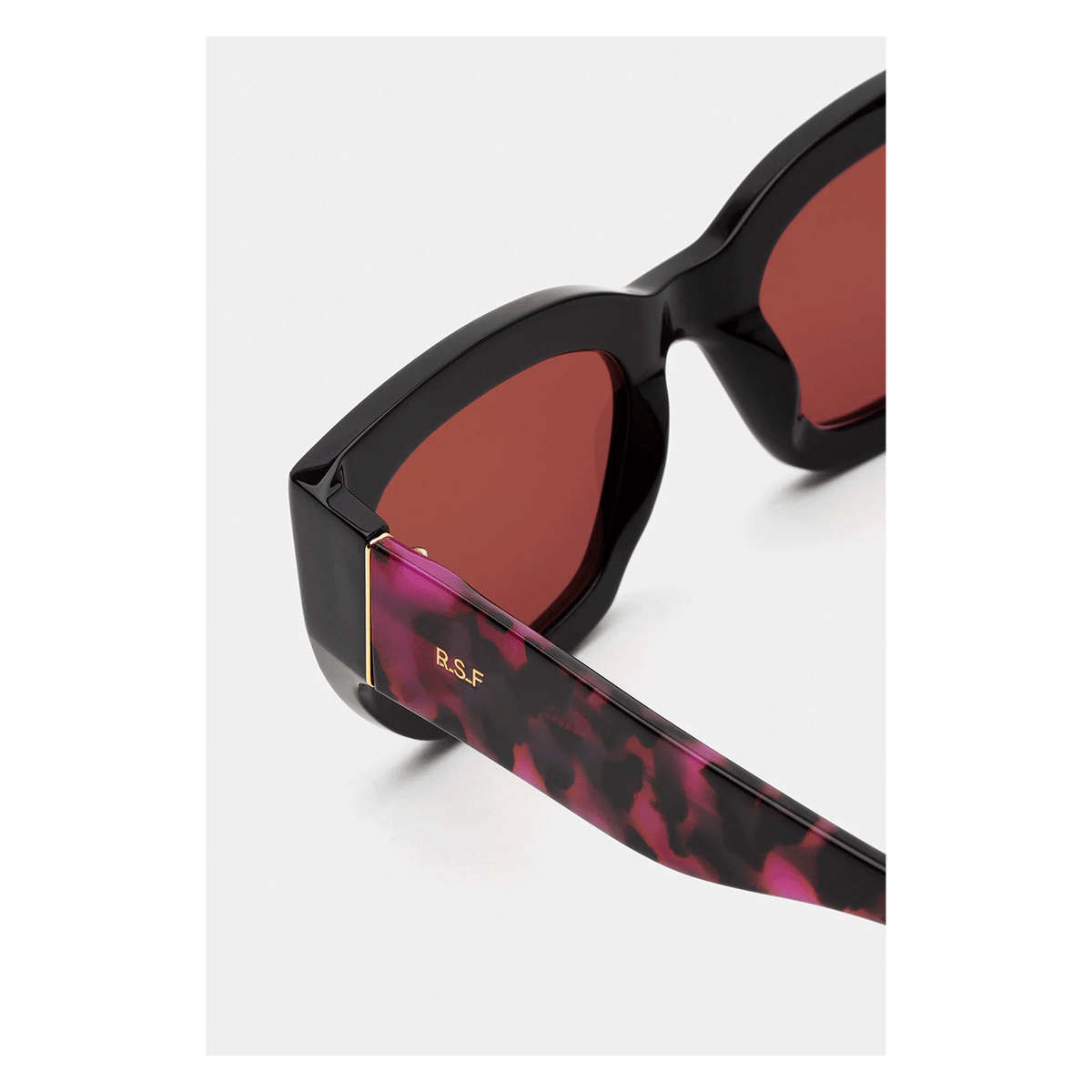 Eyewear design that transcends seasonal trends, capturing that sharp, timeless elegance with RSF’s thick acetate rims and a playful flair. Alva crosses over from the sunny Riviera to the busy streets of our cities. Day and night. Its angular temples and fresh design balances the rounded appeal of its broad lenses. This version comes in a black acetate frame, with a playful red Havana on the temples and tinted Bordeaux lenses.