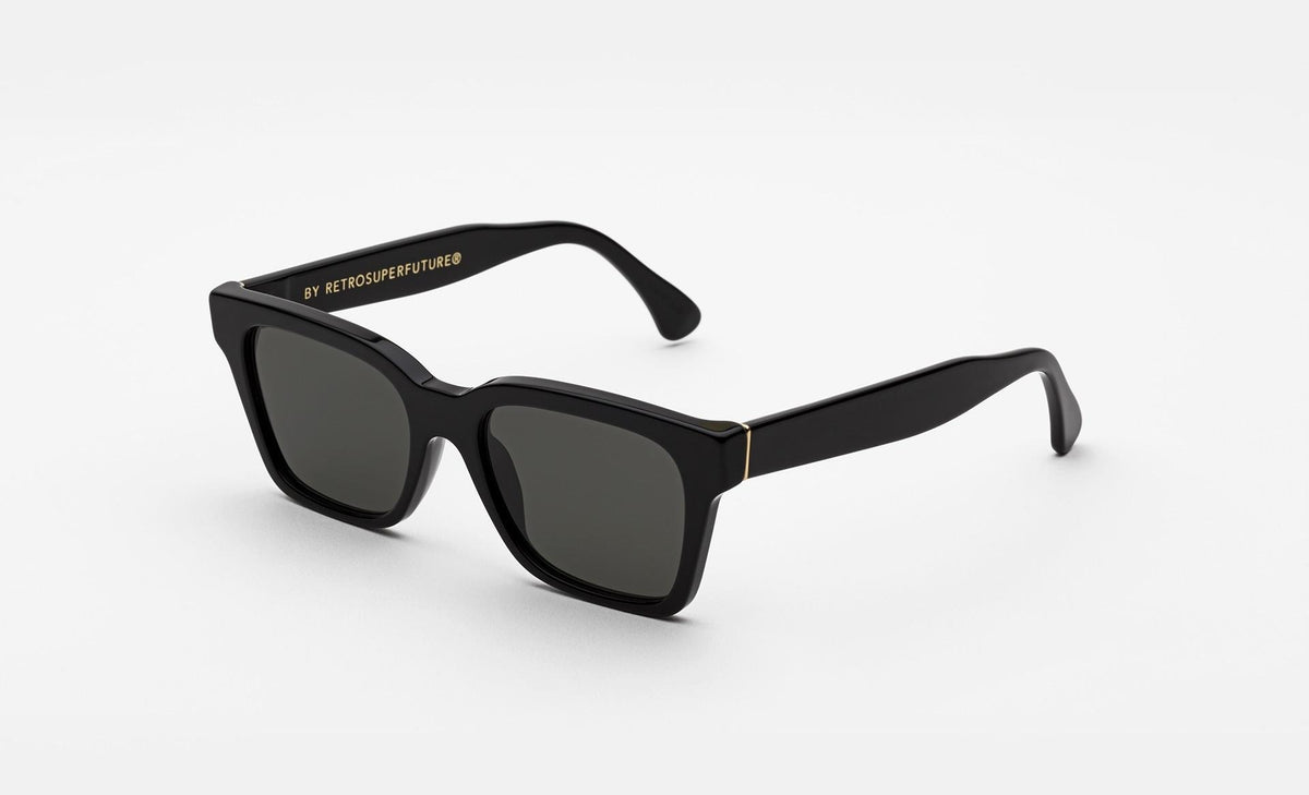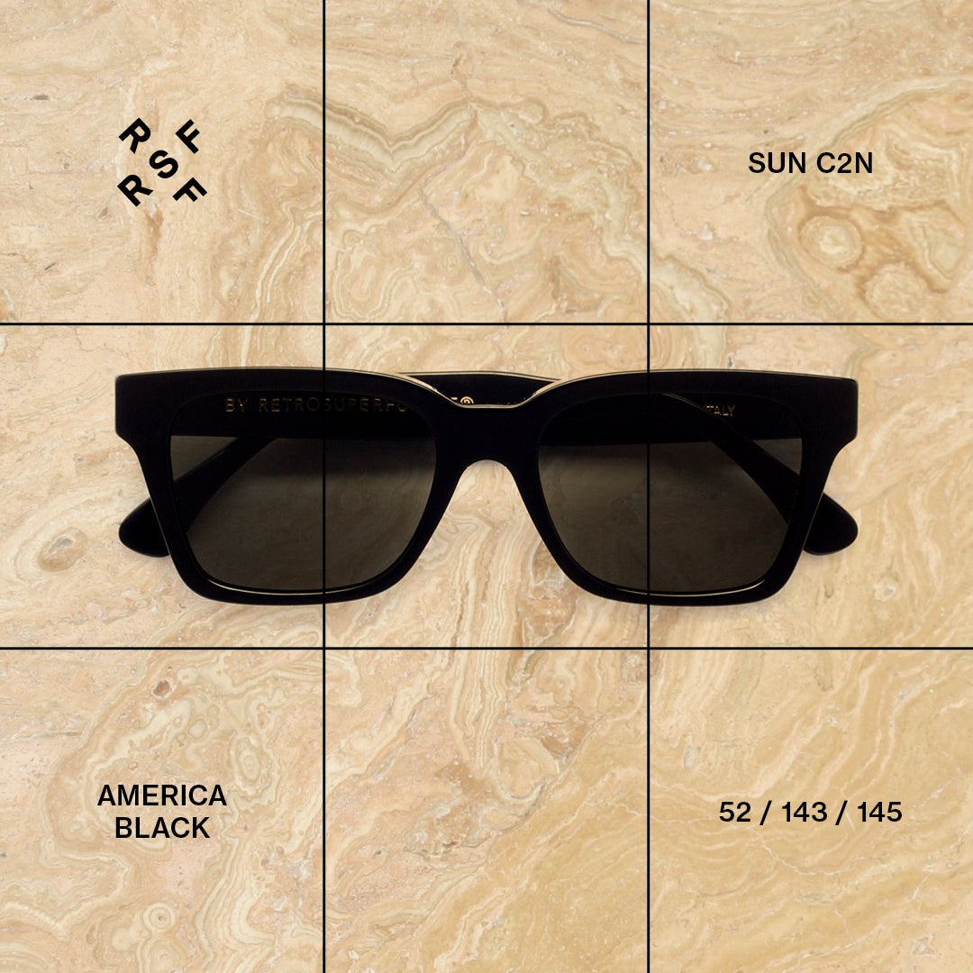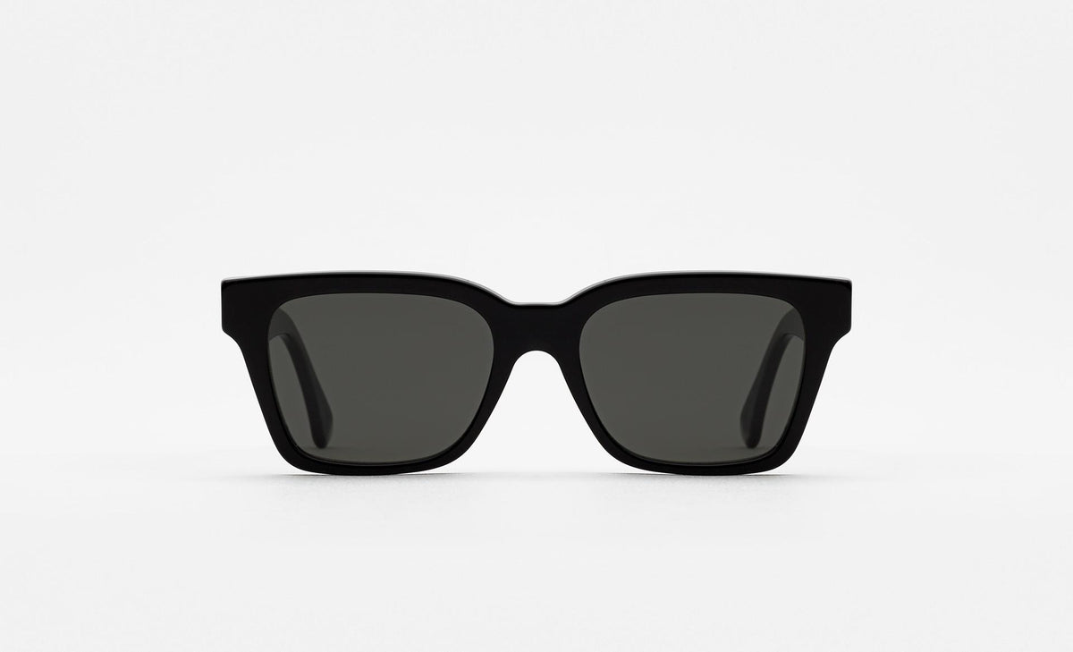 A classic angular design, America features sturdy rims, essential profile and wide lenses. This version of the silhouette features a classic glossy black acetate and dark grey tinted lenses. The box contains a semi-hard case and a cleaning cloth.