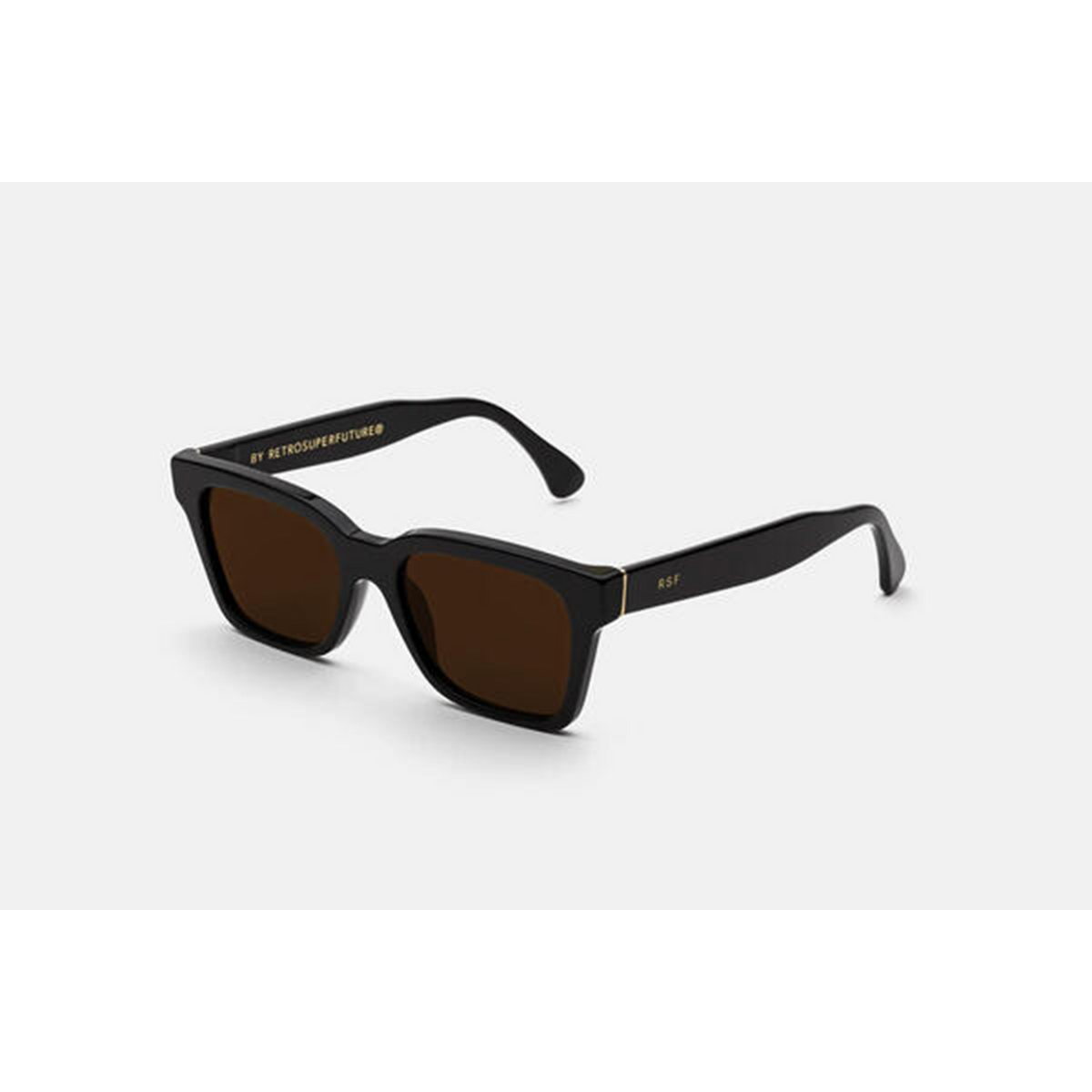 A classic angular design, America features sturdy rims, essential profile and wide lenses. This version of the silhouette features a classic glossy black acetate and brown tinted lenses. The box contains a semi-hard case and a cleaning cloth.