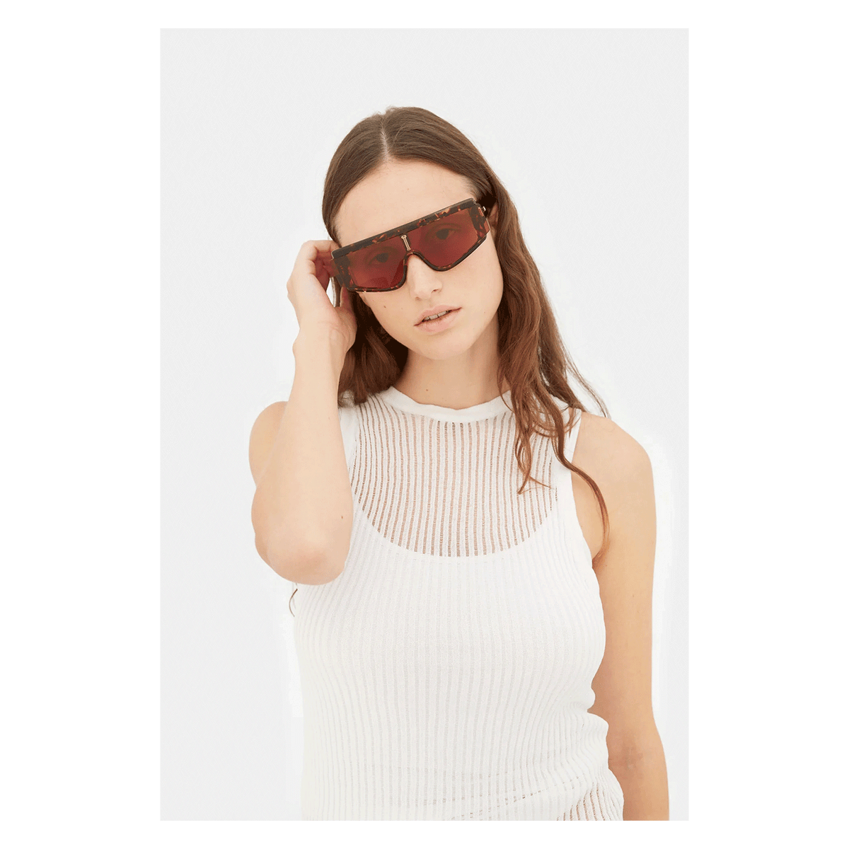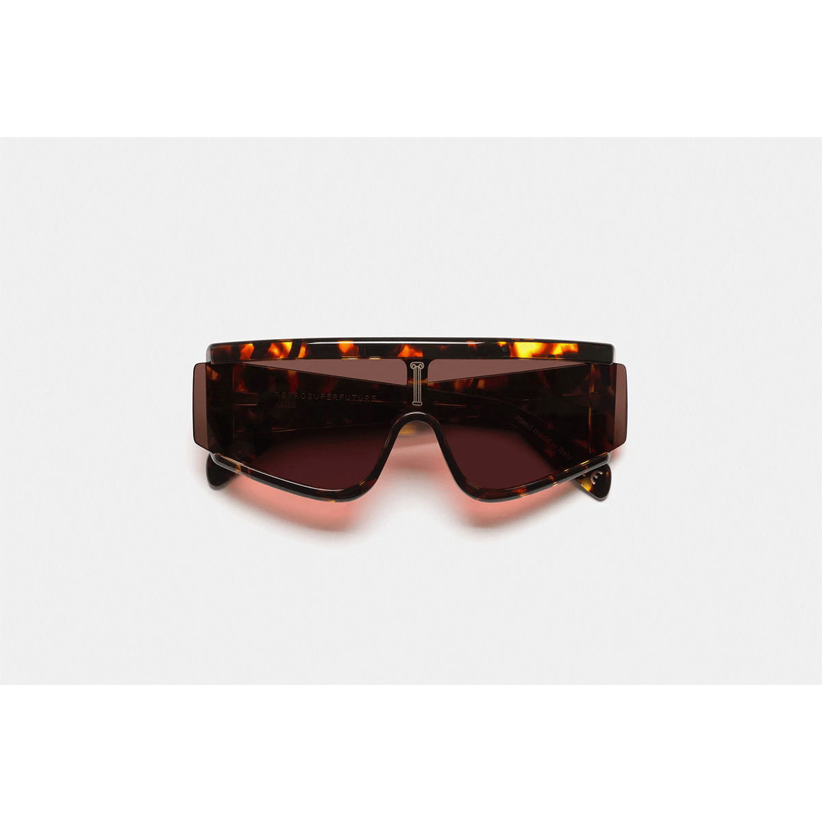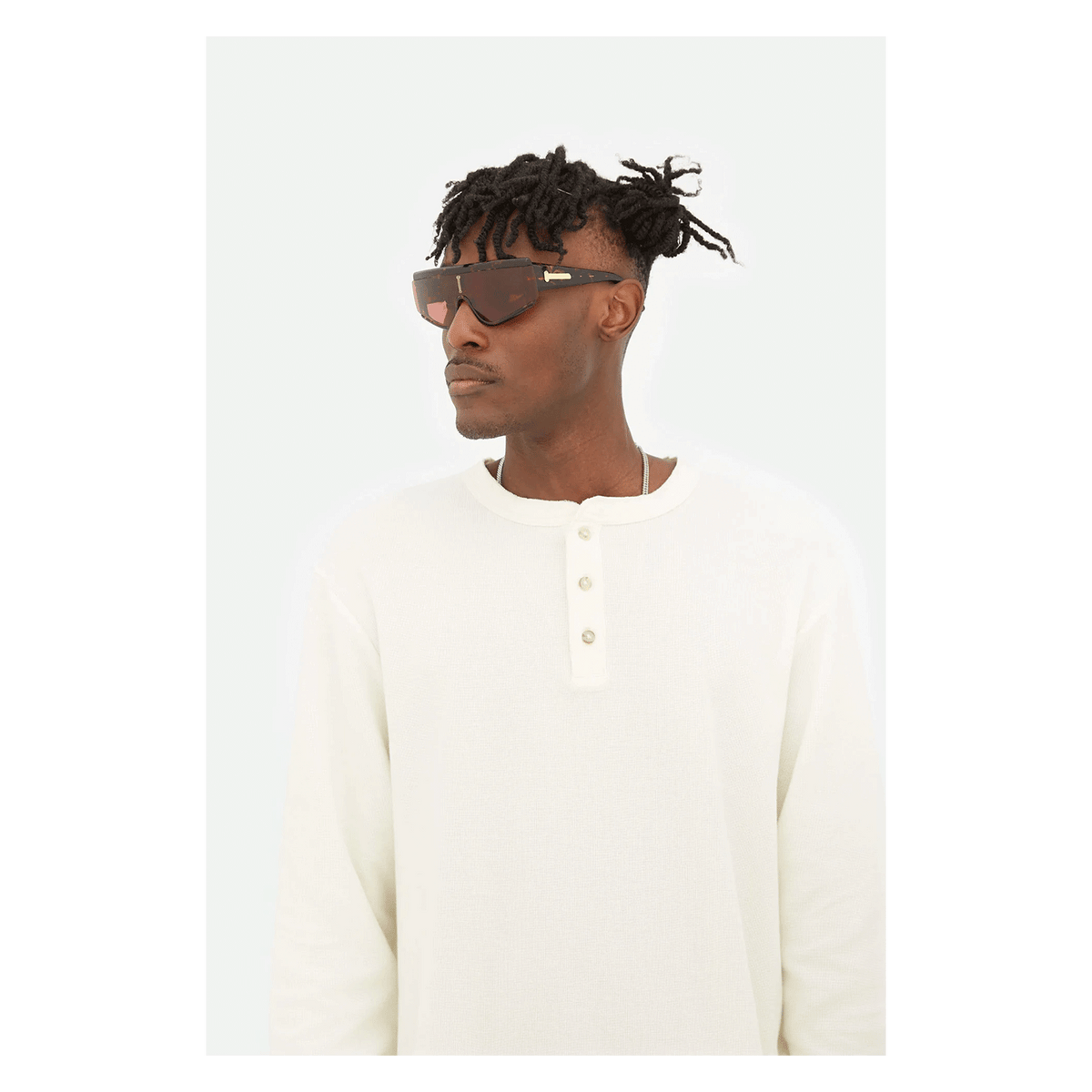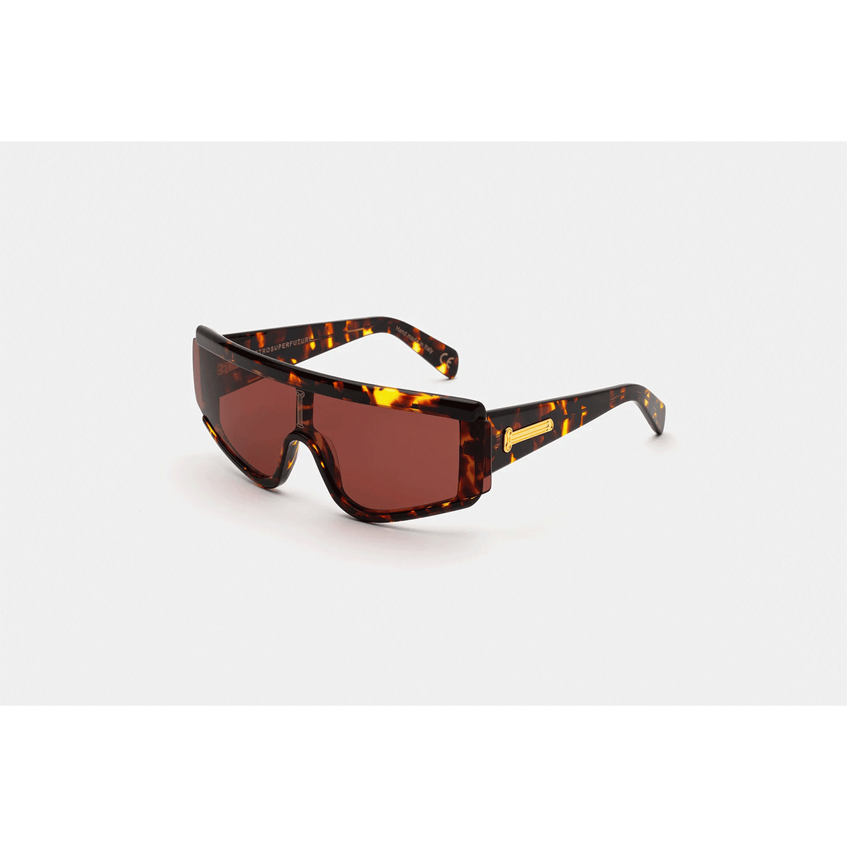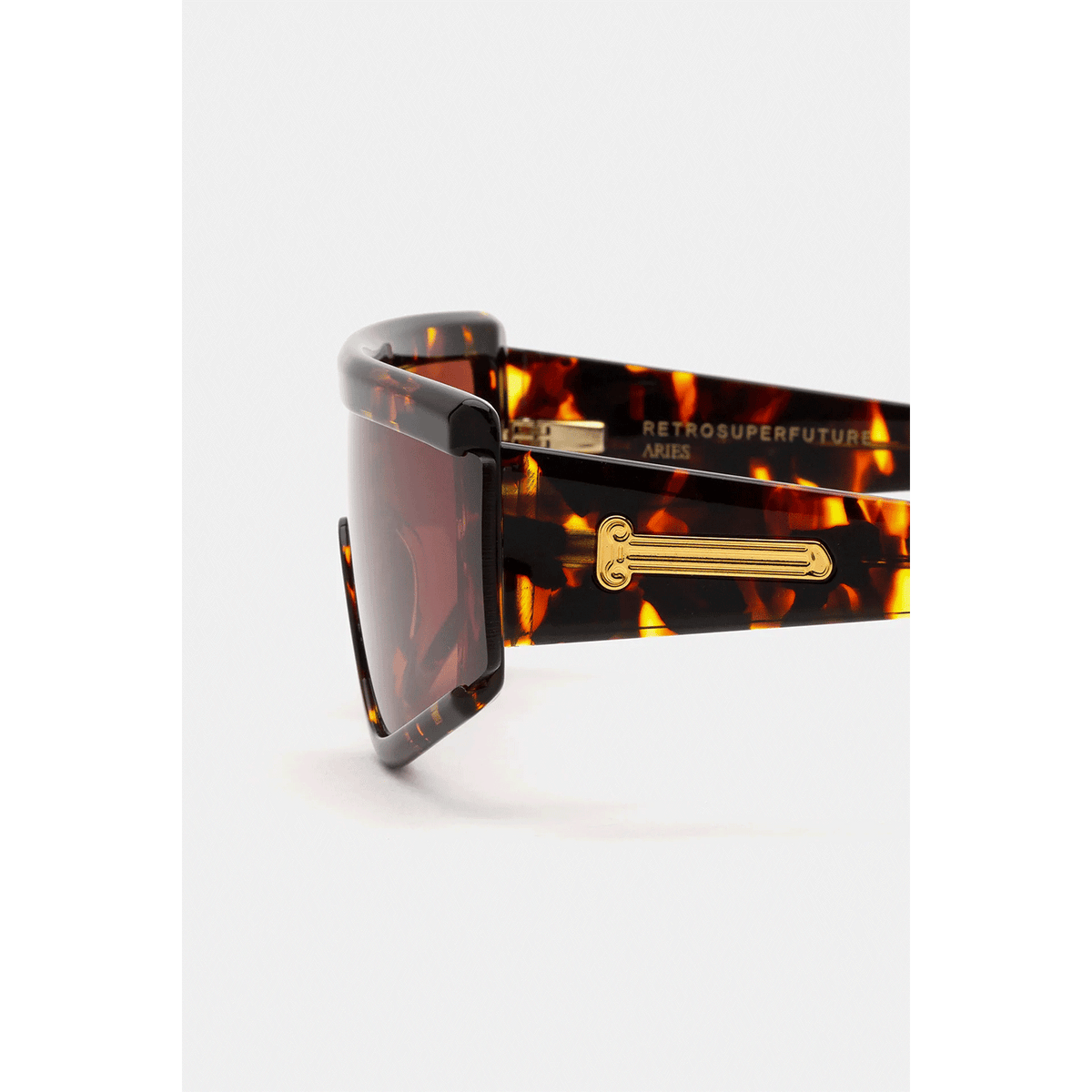Developed for the exclusive collaboration with the cult British brand Aries, Zed was conceived as a genderless silhouette that mixes diverse conceptual references, from high-tech sportswear to sleek aesthetics of contemporary design. This approach encapsulates Aries’ disruptive and multi-faceted visual language. With its bold streamlined design, this eyewear piece features a single high-grade shield lens mounted in a thick acetate structure, the technical flex hinges allow extra comfort for the design’s wide temples. The final touch was given by Aries, whom customised the piece with its signature broken Roman column, creating two gold metal decors for the temples and a central graphic on the frame’s prominent shield. This version comes in a tortoiseshell acetate paired with a dark amber coloured lens.