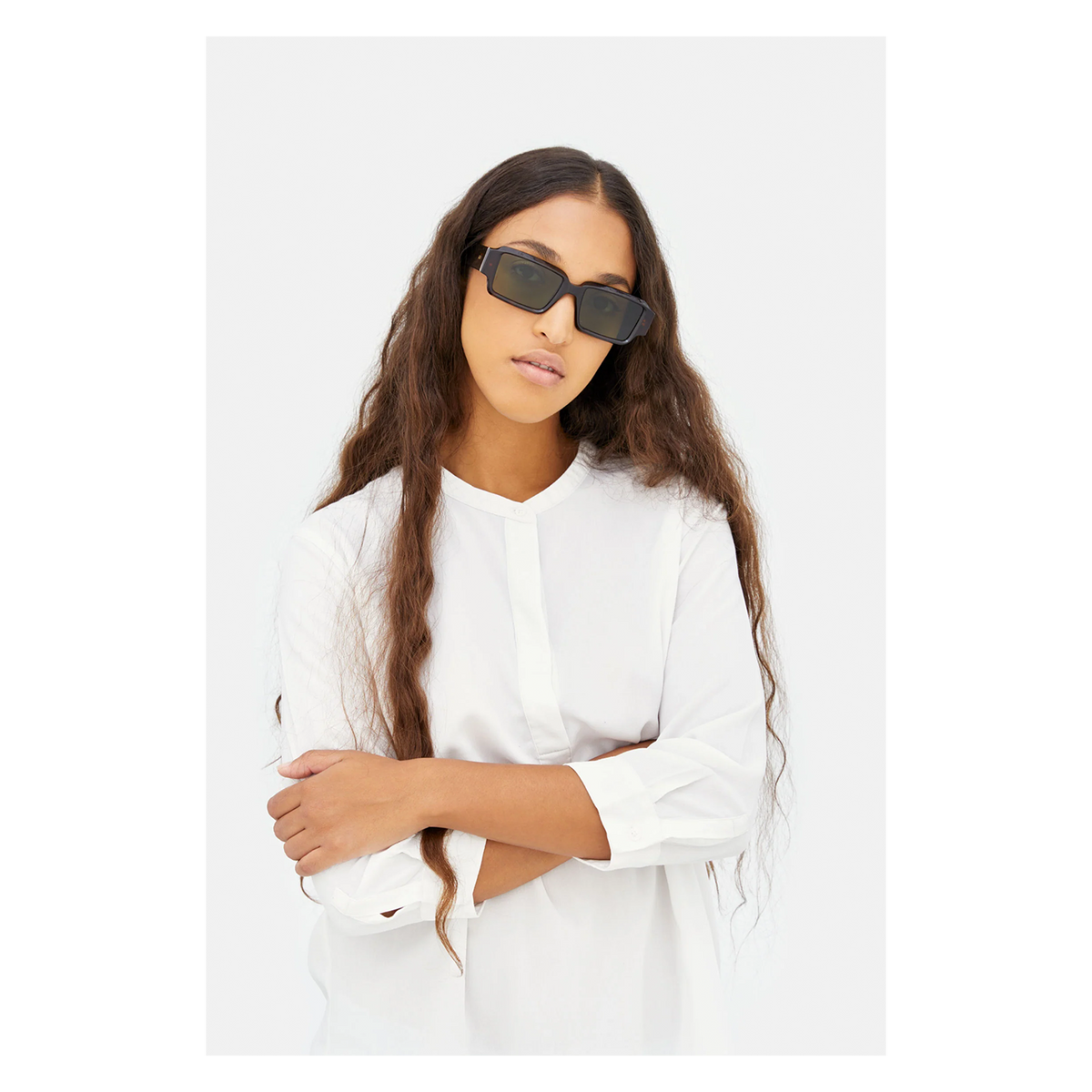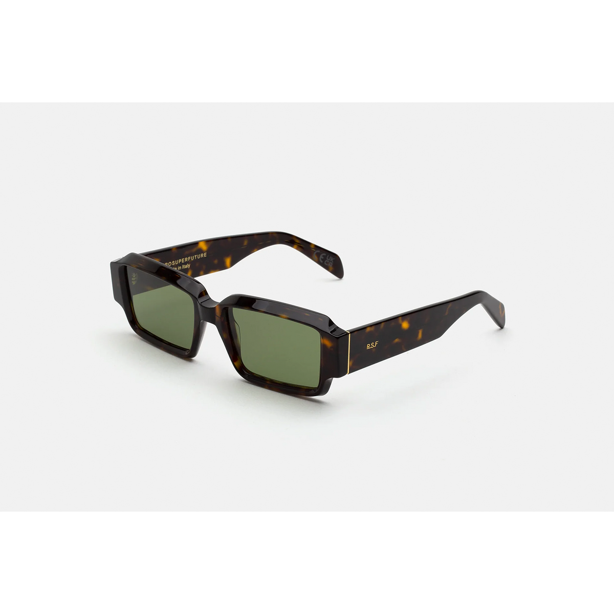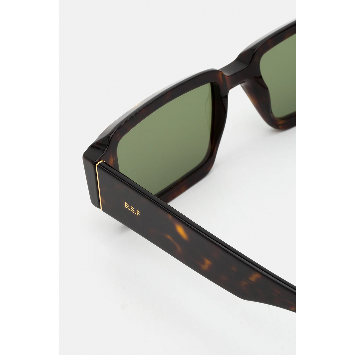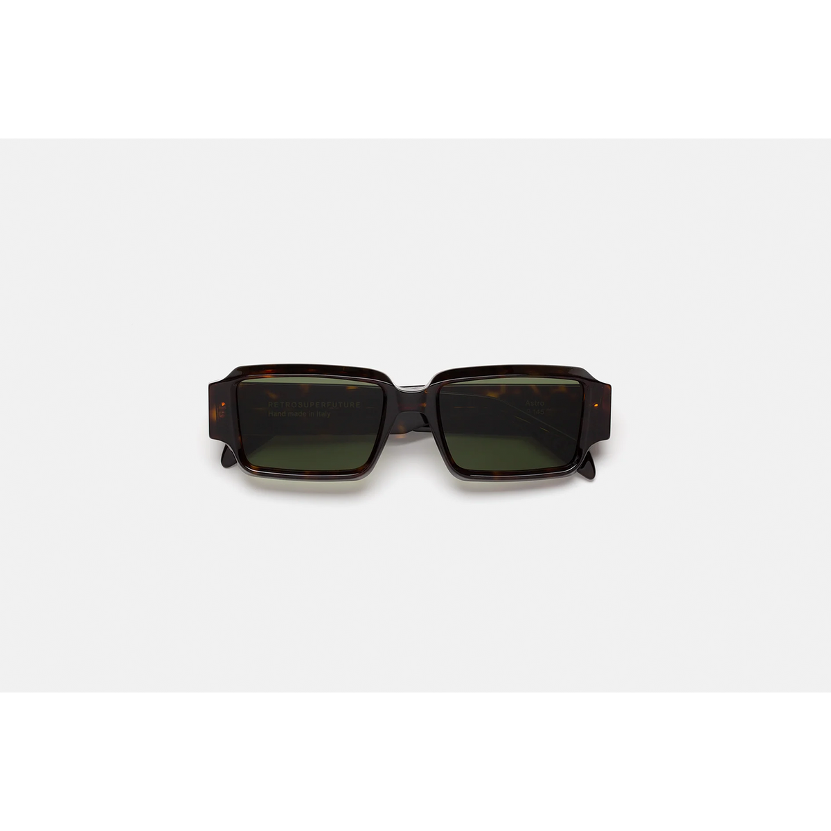 Astro is a squared frame with thick temples and a low nose-bridge, characterised by sculpted rims to form a distinctive slanted, architectural profile. Exceptional Italian acetate in dark tortoise shell with green lenses make this an exquisite high-end design. The box contains a semi-hard case and a cleaning cloth.
