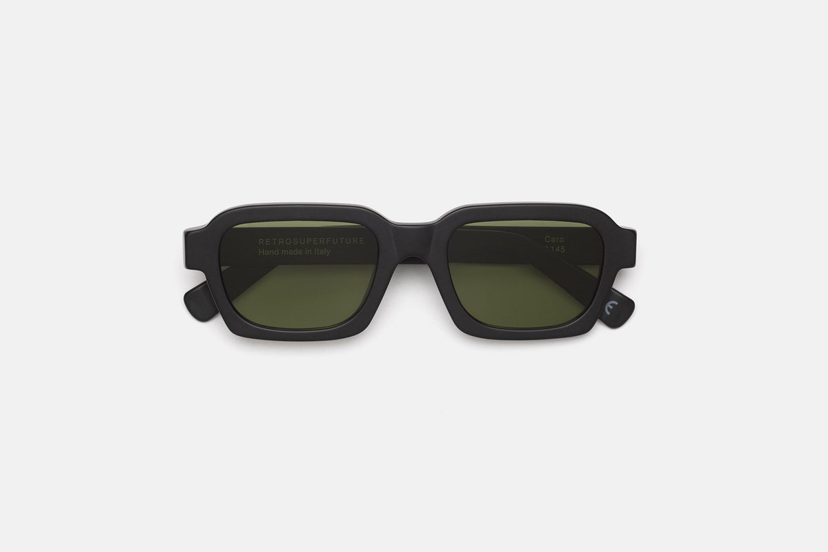 Caro is a wide, geometric silhouette that blends 1960s Italian classicism with 1990s grunge aesthetic. The model features a well-rounded design with a thick, sturdy acetate structure, squared temple tips and angular rims on the lower half of the frame. This version of Caro comes with classic bottle green lenses, and a matte black acetate frame. The box contains a semi-hard case and a cleaning cloth.