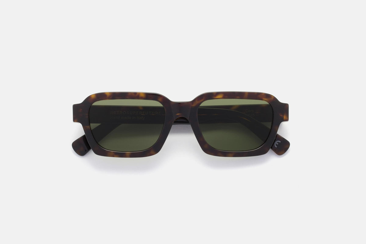 Caro is a wide, geometric silhouette that blends 1960s Italian classicism with 1990s grunge aesthetic. The model features a well-rounded design with a thick, sturdy acetate structure, squared temple tips and angular rims on the lower half of the frame. This version of Caro comes with classic green lenses, and a dark havana acetate frame. The box contains a semi-hard case and a cleaning cloth.