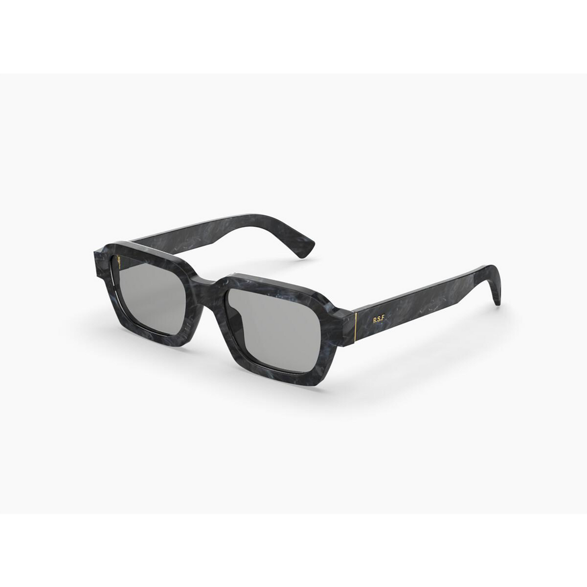 Caro is a wide, geometric silhouette that blends 1960s Italian classicism with 1990s grunge aesthetic. The model features a well-rounded design with a thick, sturdy acetate structure, squared temple tips and angular rims on the lower half of the frame. This version of Caro comes with light grey lenses, and a glossy grey marbled acetate frame. The box contains a semi-hard case and a cleaning cloth.
