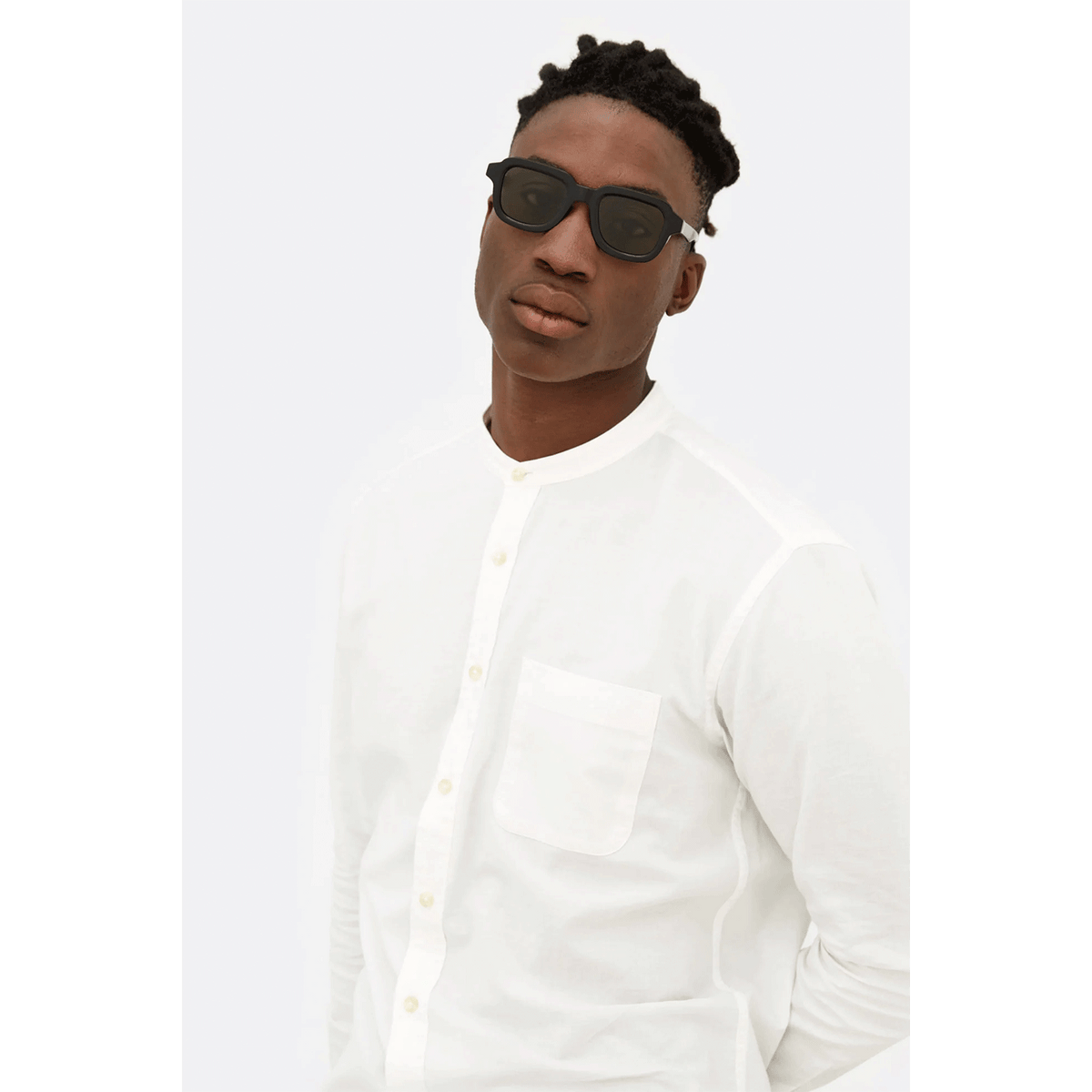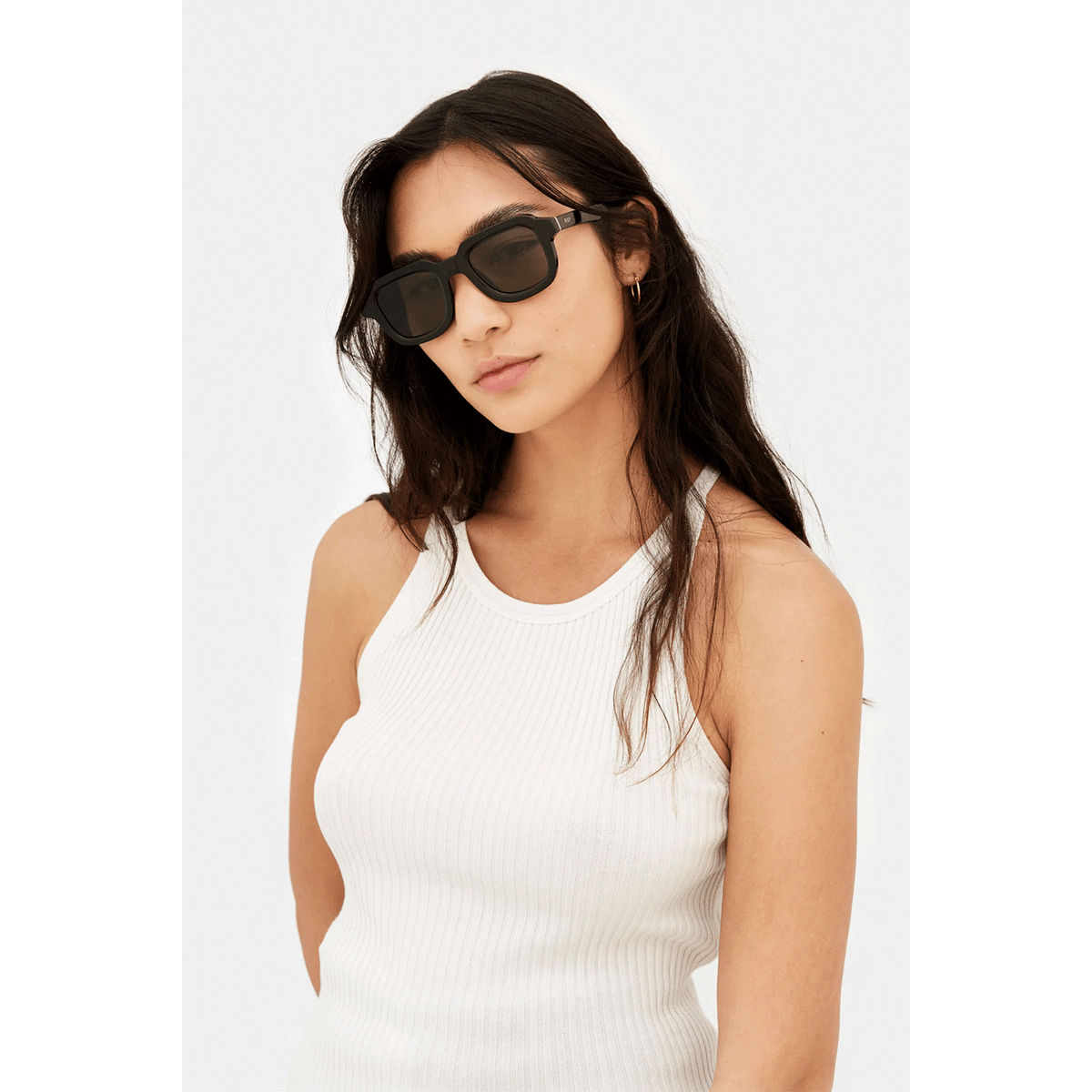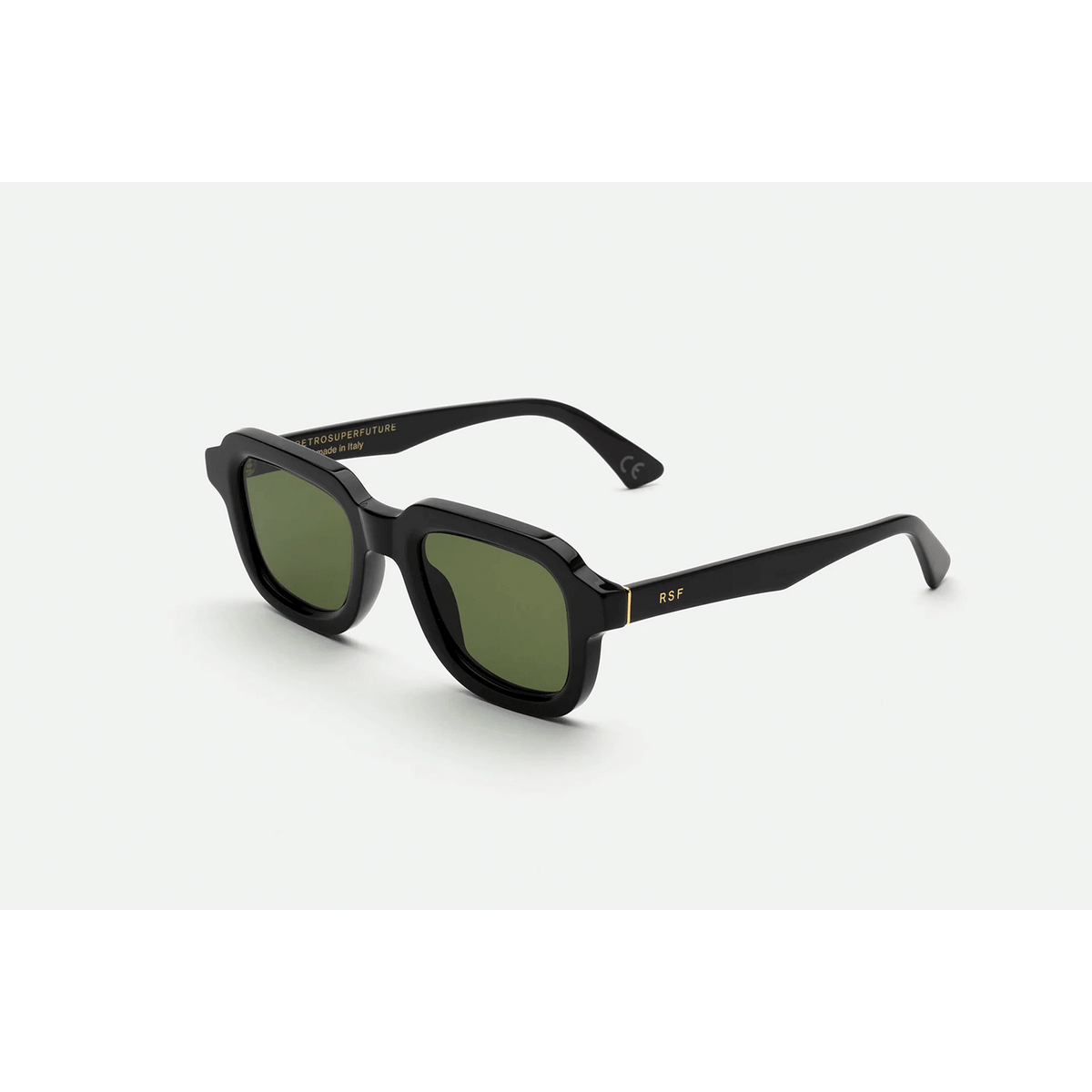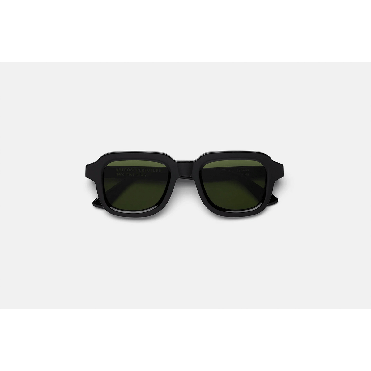 The Lazarus is a wide, square silhouette that blends 1960s Italian classicism with a 1990s grunge aesthetic. The model features a well-rounded design with a thick, sturdy acetate structure, squared temple tips, and angular rims on the lower half of the frame. This version features shiny black acetate with bottle green lenses.