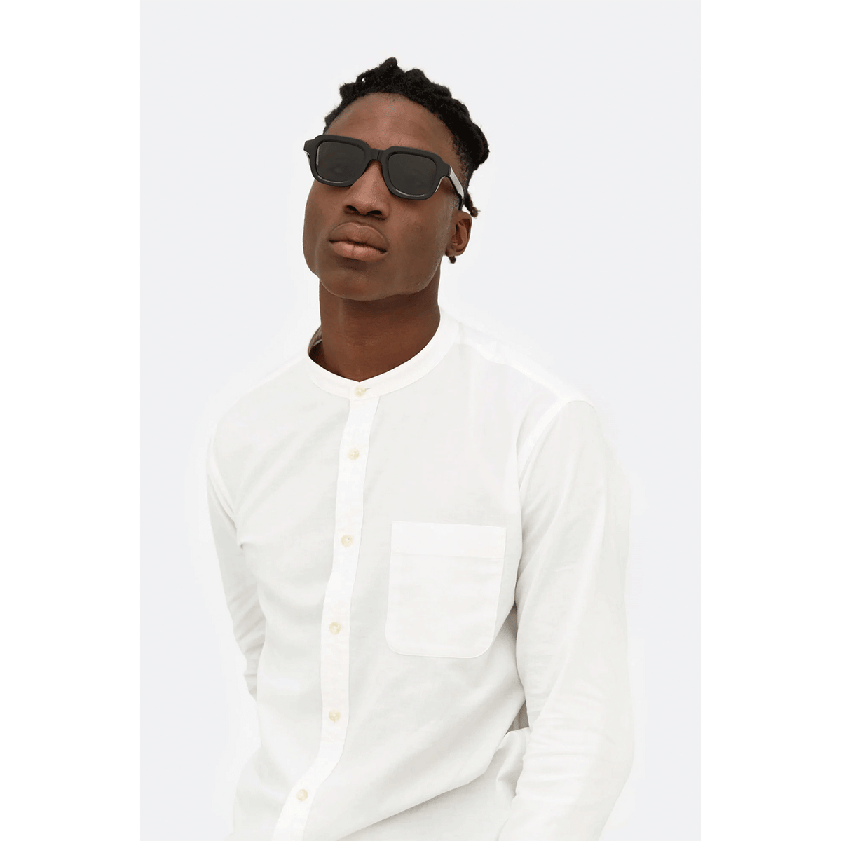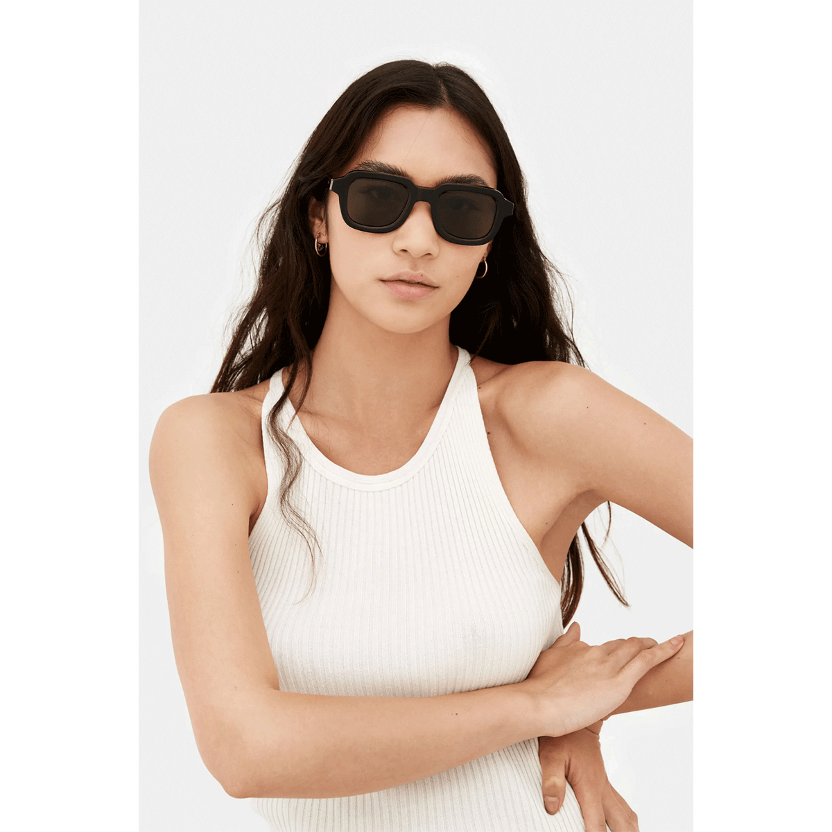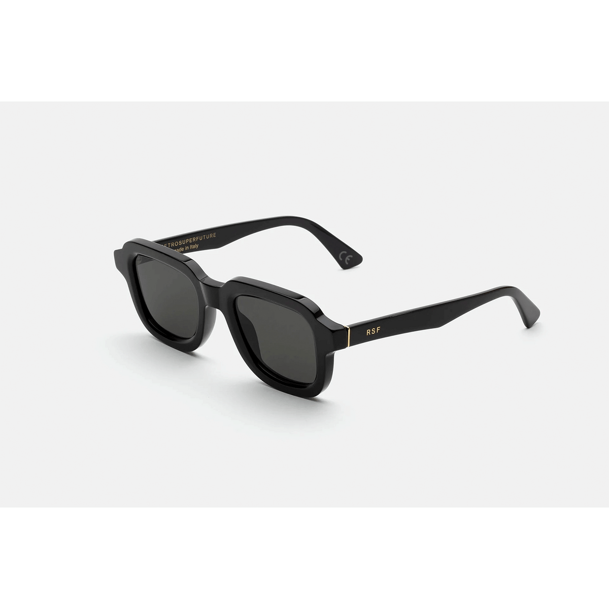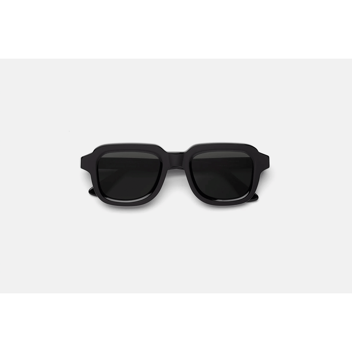 The Lazarus is a wide, square silhouette that blends 1960s Italian classicism with a 1990s grunge aesthetic. The model features a well-rounded design with a thick, sturdy acetate structure, squared temple tips, and angular rims on the lower half of the frame. This version features shiny black acetate with matching lenses.