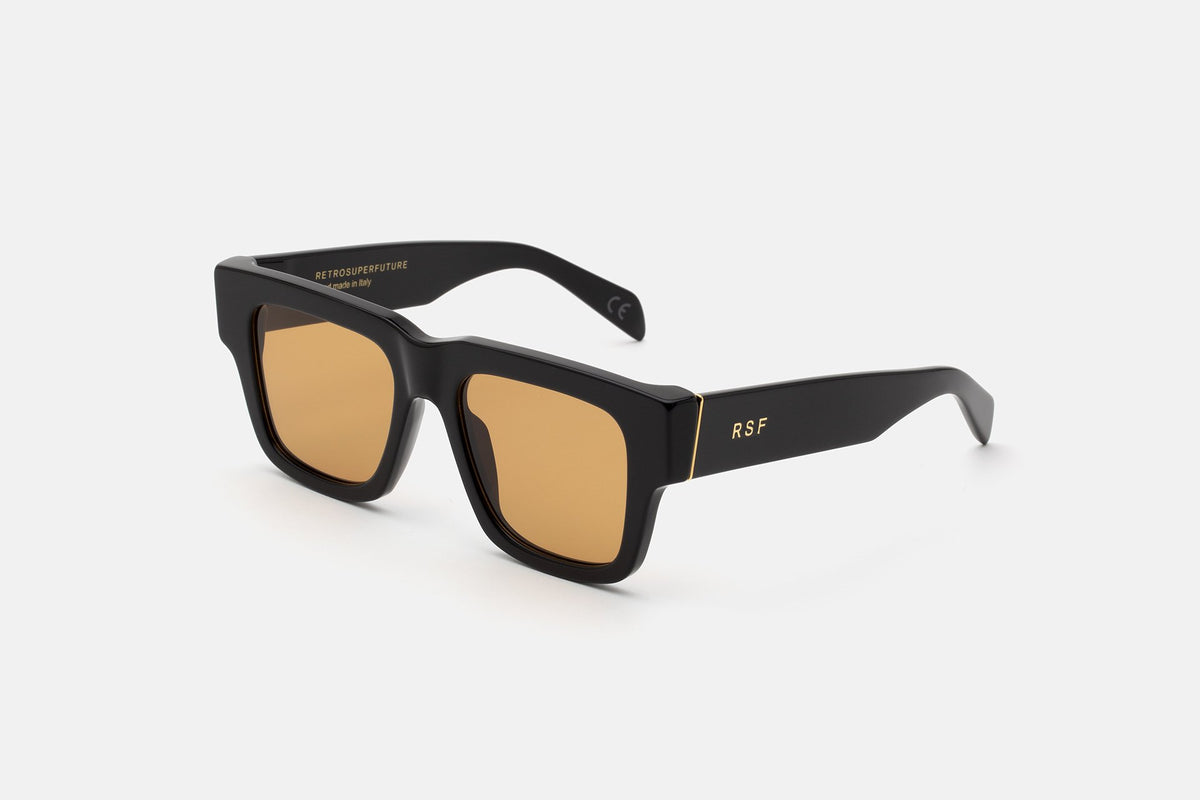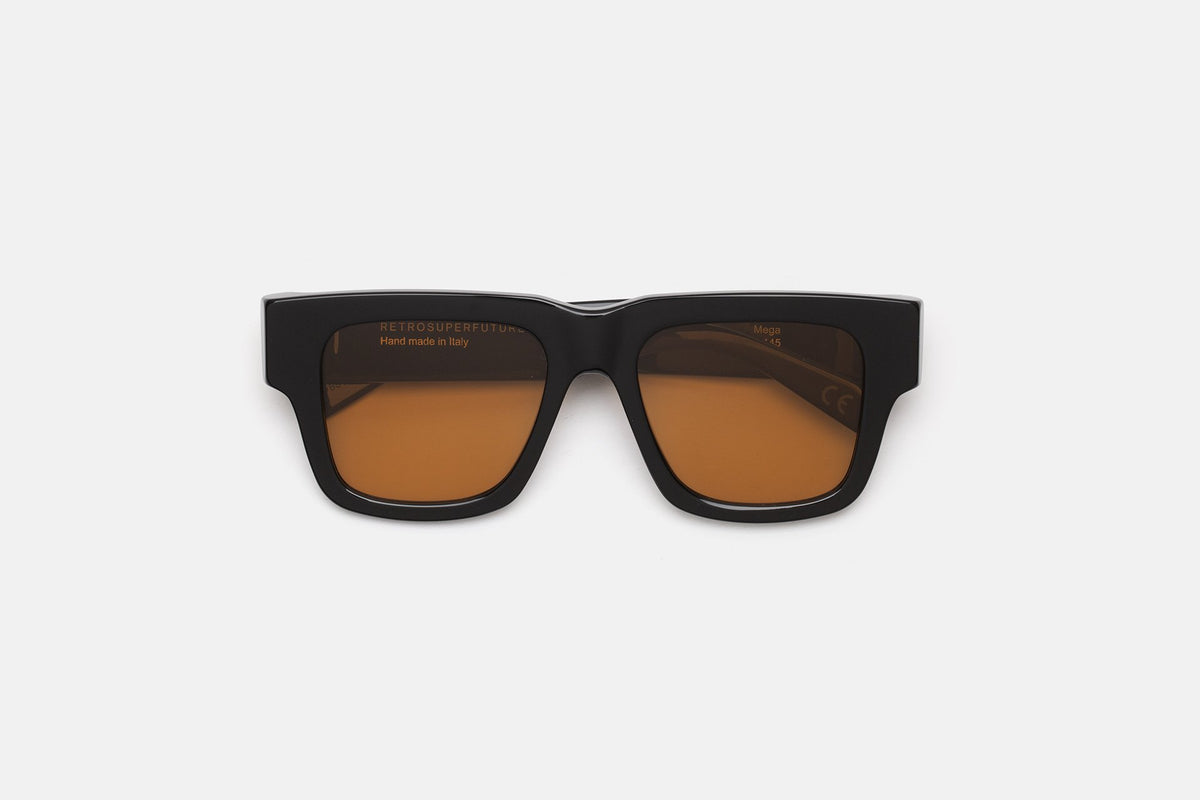 Mega is a statement silhouette conceived as a modern unisex oversized frame. Crafted from high-end Italian acetate for a compact and precise design, the model features tall, thick rims, a sturdy nose-bridge and angular lenses. This version comes in black acetate and refined light brown lenses. The box contains a semi-hard case and a cleaning cloth.