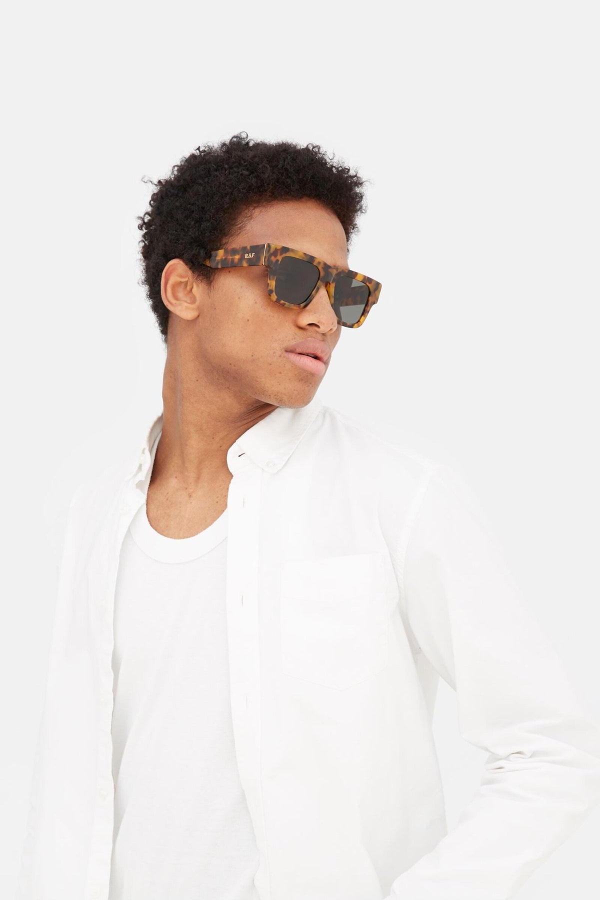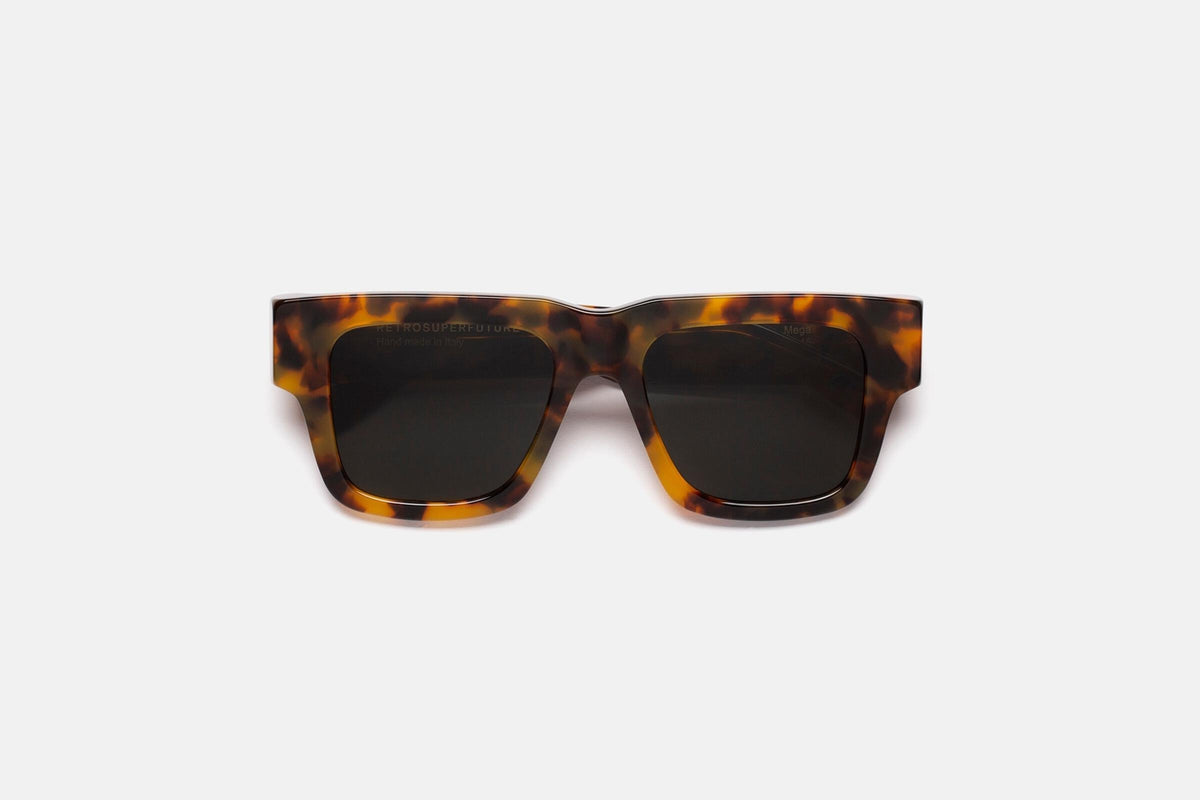 Mega is a statement silhouette conceived as a modern unisex oversized frame. Crafted from high-end Italian acetate for a compact and precise design, the model features tall, thick rims, a sturdy nose-bridge and angular lenses. This version comes in a spotted Havana acetate with black lenses. The box contains a semi-hard case and a cleaning cloth.