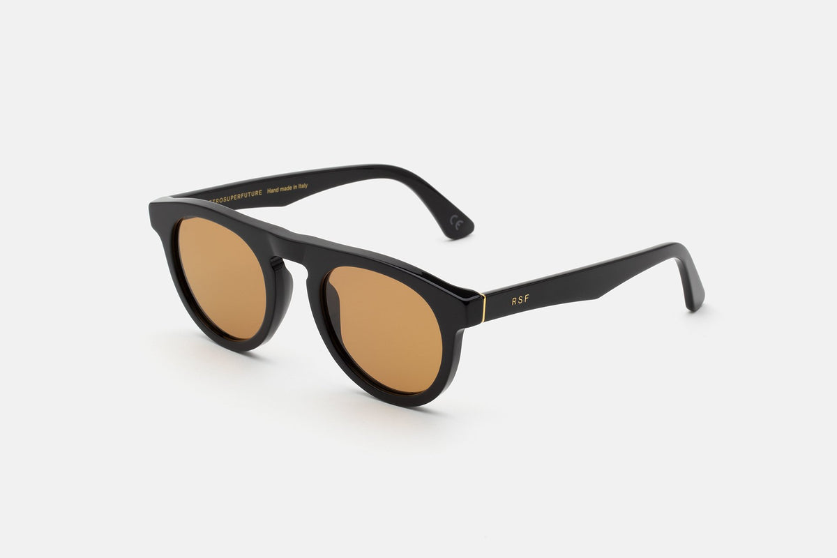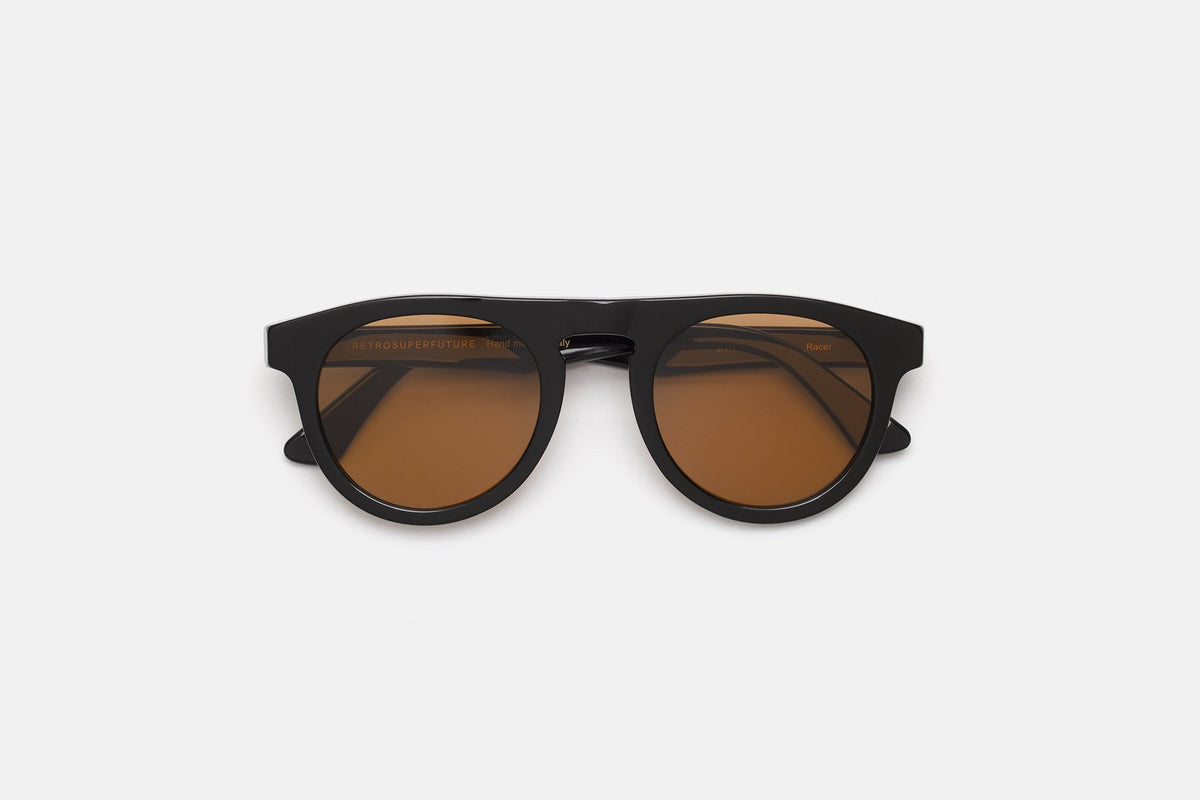 Re-designed for the Spring/Summer 2021 collection, Racer is a timeless sportswear-inspired silhouette, with a streamlined upper line and contrasting curved, dynamic lens shapes. The lenses are Barberini tempered glass for a precise, technical feel and function. This version comes with a gloss black acetate and light brown lenses. The box contains a semi-hard case and a cleaning cloth.