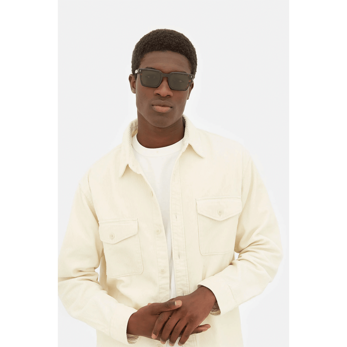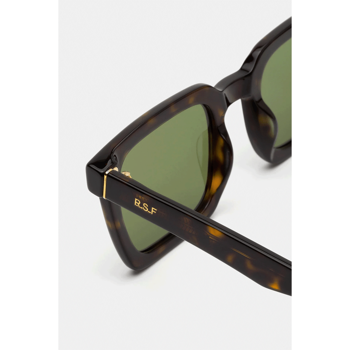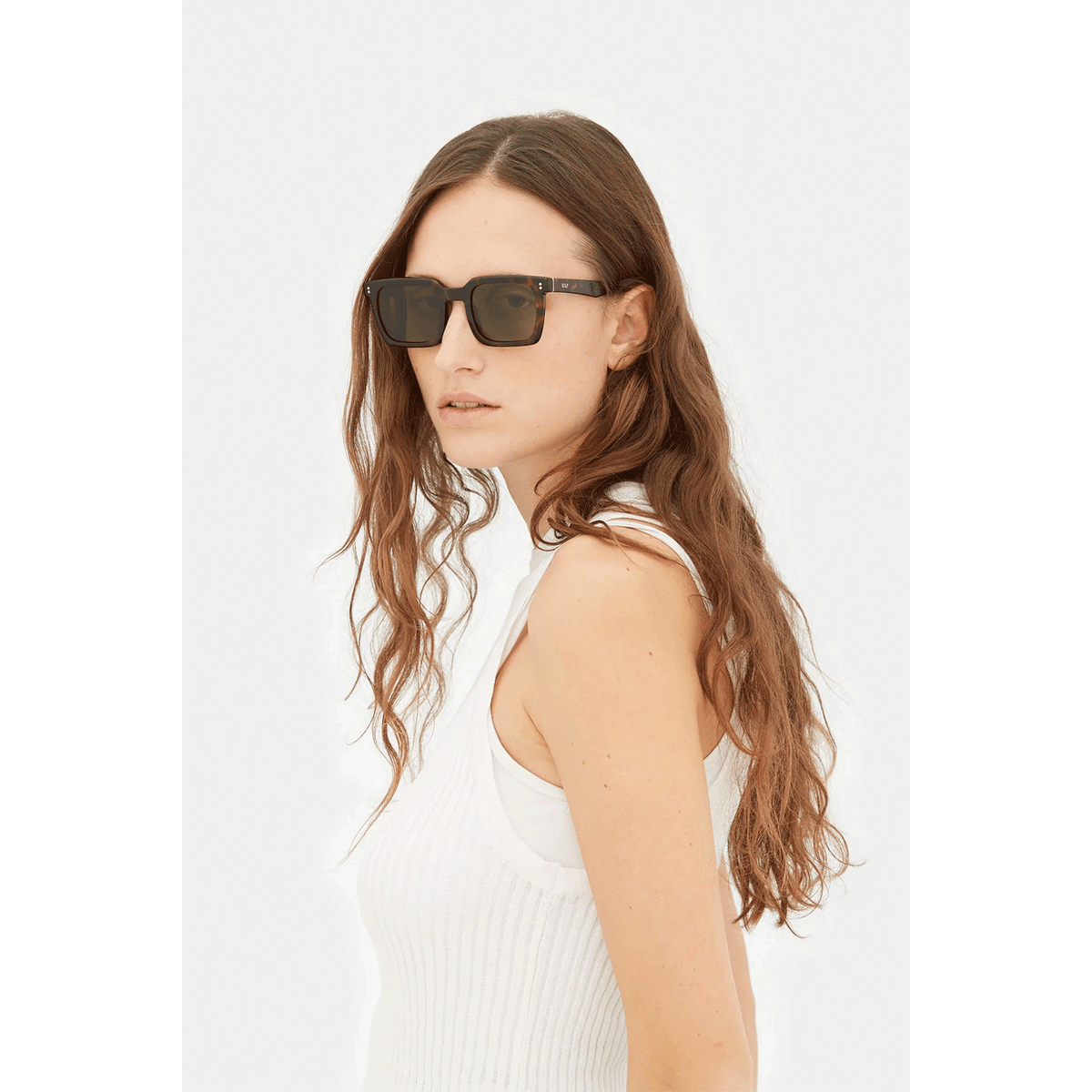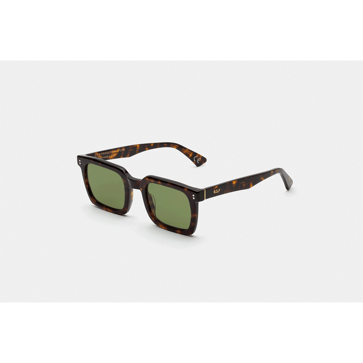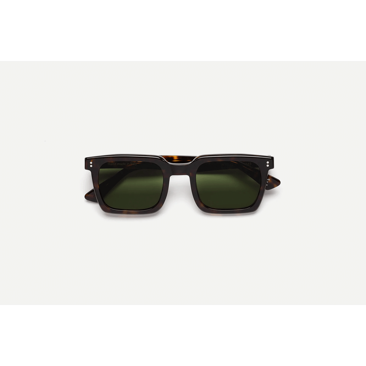 Secolo is an essential geometric silhouette with a distinctive architectural quality, where precise angles of the frame are balanced with its rounded lenses. This is an uncompromising, yet fitting shape for those looking for elegant, squared sunglasses with a unique modernist character. Its apparent simplicity and aesthetic purity conceal carefully crafted details, such as its pointed temple tips and sharp angular detailing on the temples. Secolo comes in a vibrant Havana acetate with bottle green lenses.