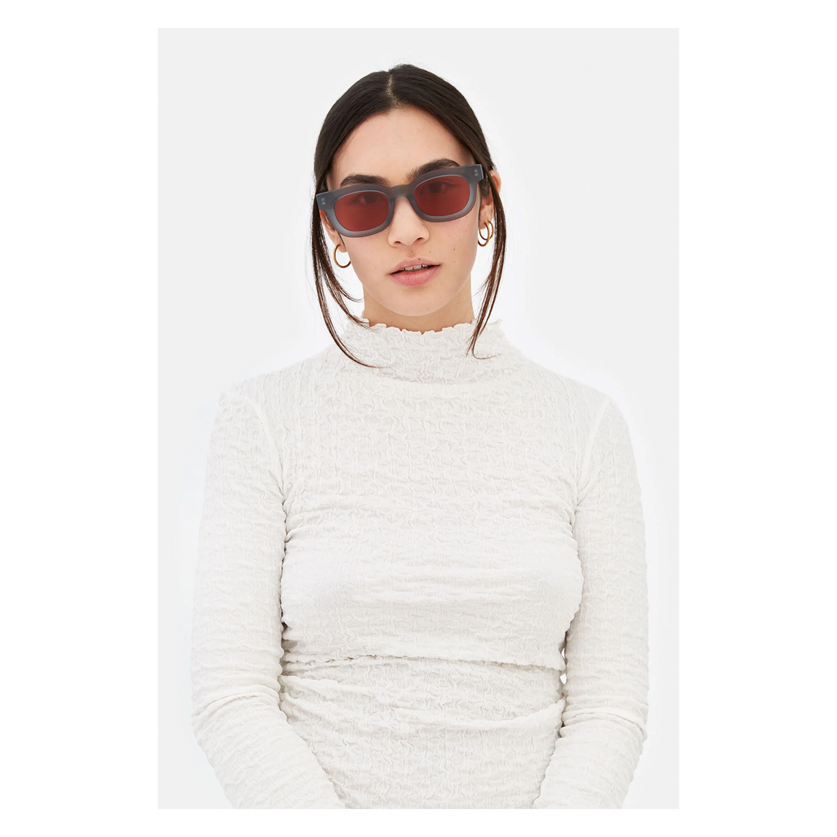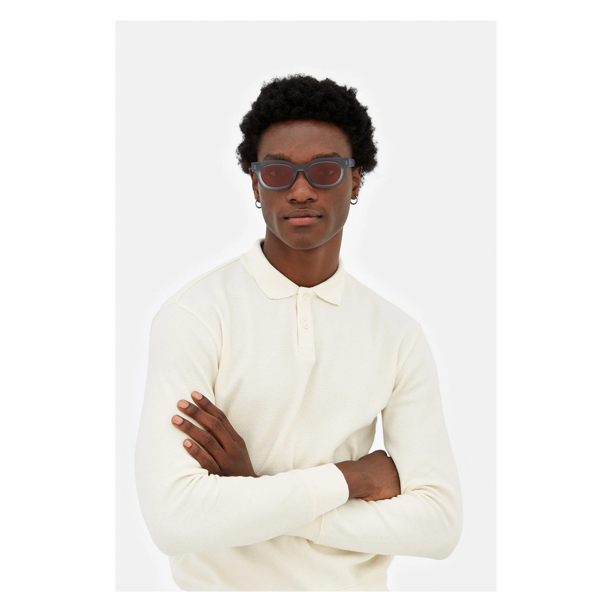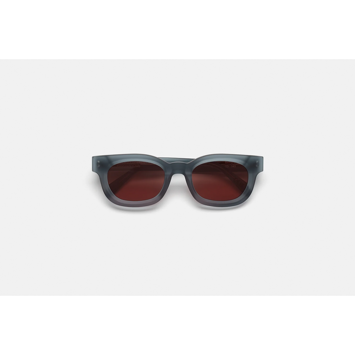 A reinterpretation of 1960s shapes, Sempre stands out with its softly carved rims with that extra depth around the lenses, giving the piece a unique sculptural quality. Its ovaloid lenses have a familiar, soothing quality while its squared temples elevate the design with sharp contemporary detailing and a precise geometric approach. This version of Sempre features a grey-blue translucent acetate with red clay tinted lenses.. The box contains a semi-hard case and a cleaning cloth.