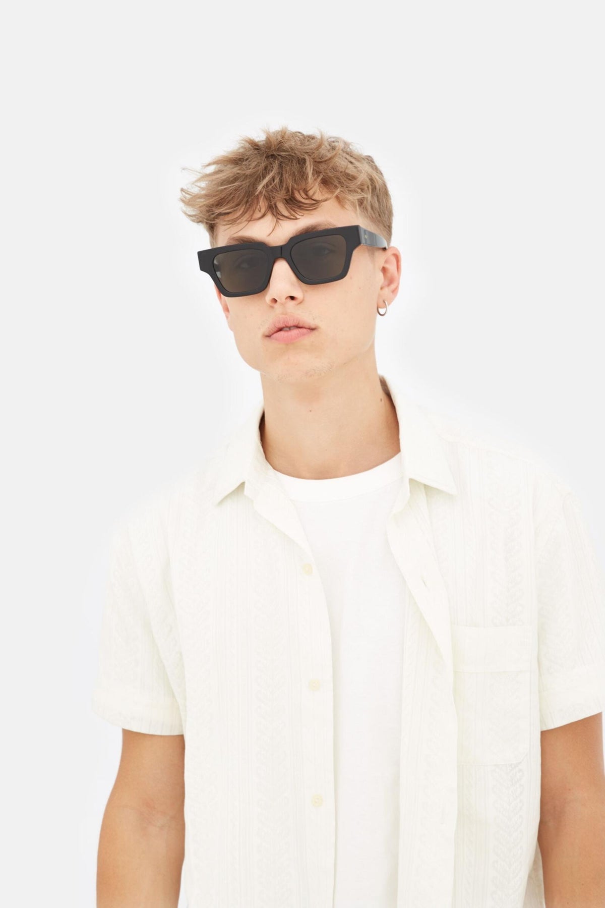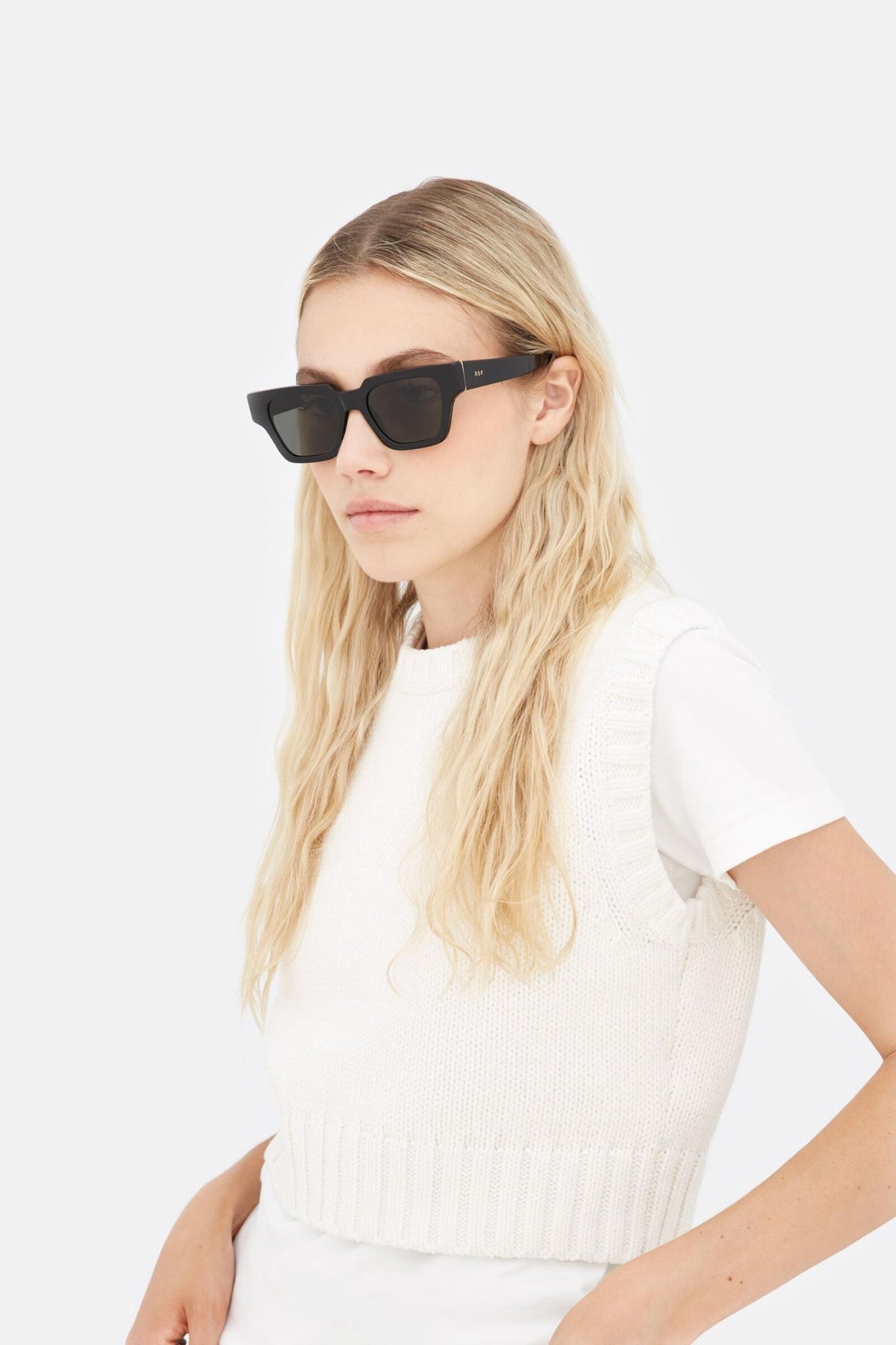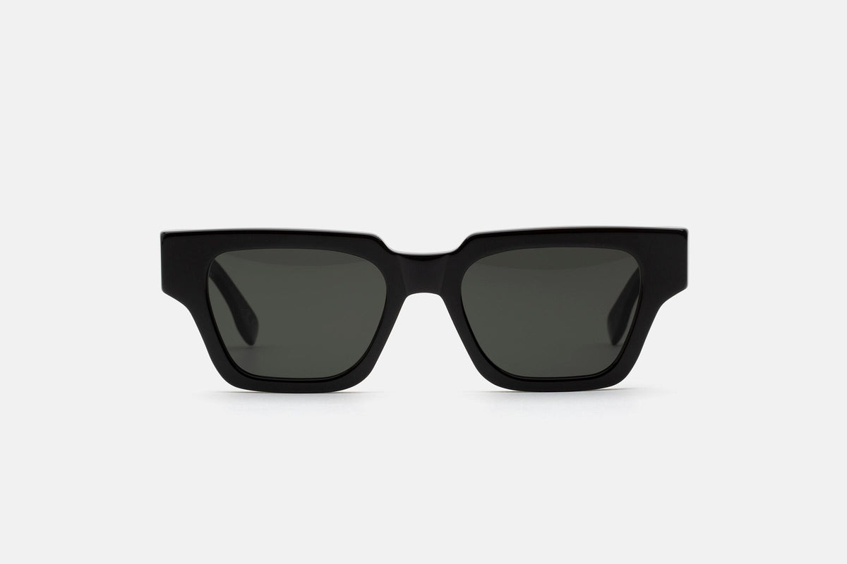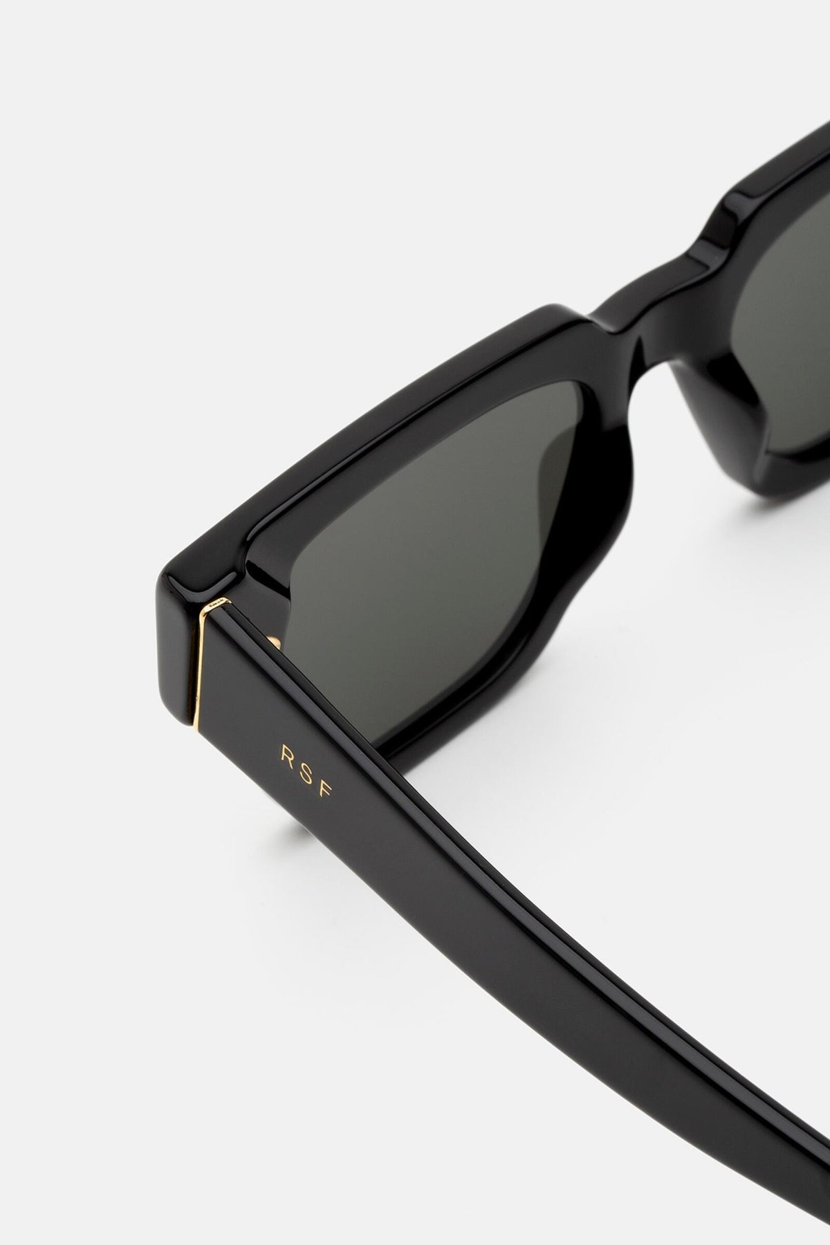 A cool, sleek piece with street edge, Storia is an exciting new shape in RSF's roster of angular silhouettes. The model is characterised by a geometric brow-line, with sharp angles sculpted around its nose-bridge. Precise lines define its thick temple-tips and sturdy acetate rims encase its compact and semi-flat lenses. This is a quintessential unisex model, designed to be worn beyond seasonal trends. This version comes in glossy Black acetate with black lenses. The box contains a semi-hard case and a cleaning cloth.