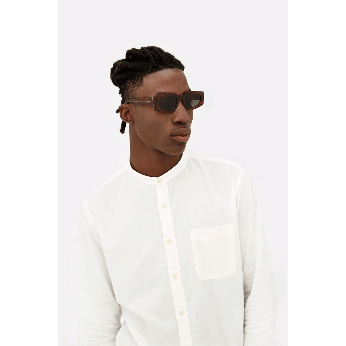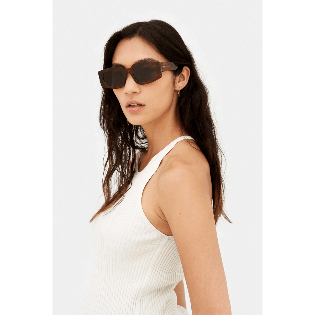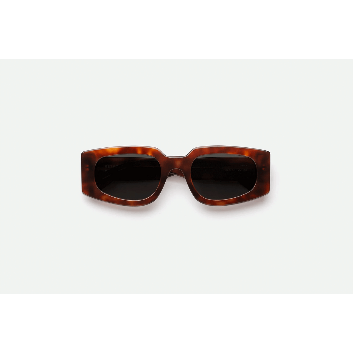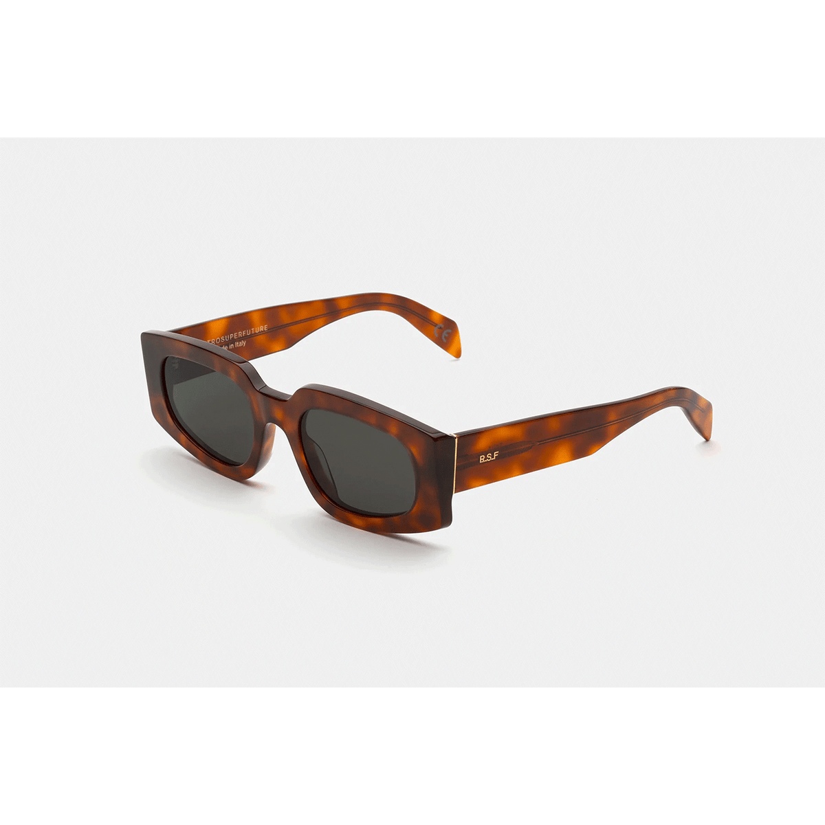 The Tetra blends vintage references with cutting-edge modern design. The silhouette is characterised by a rectangular oversized shape with rounded lenses and chiseled edges on its thick moulded rims. This version comes in havana acetate with dark grey lenses.